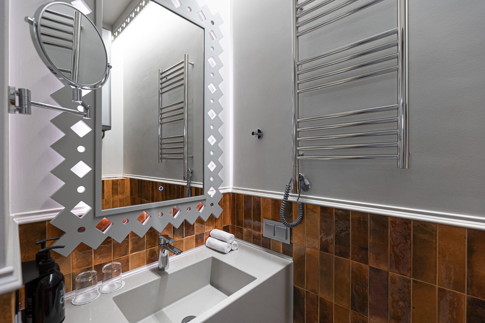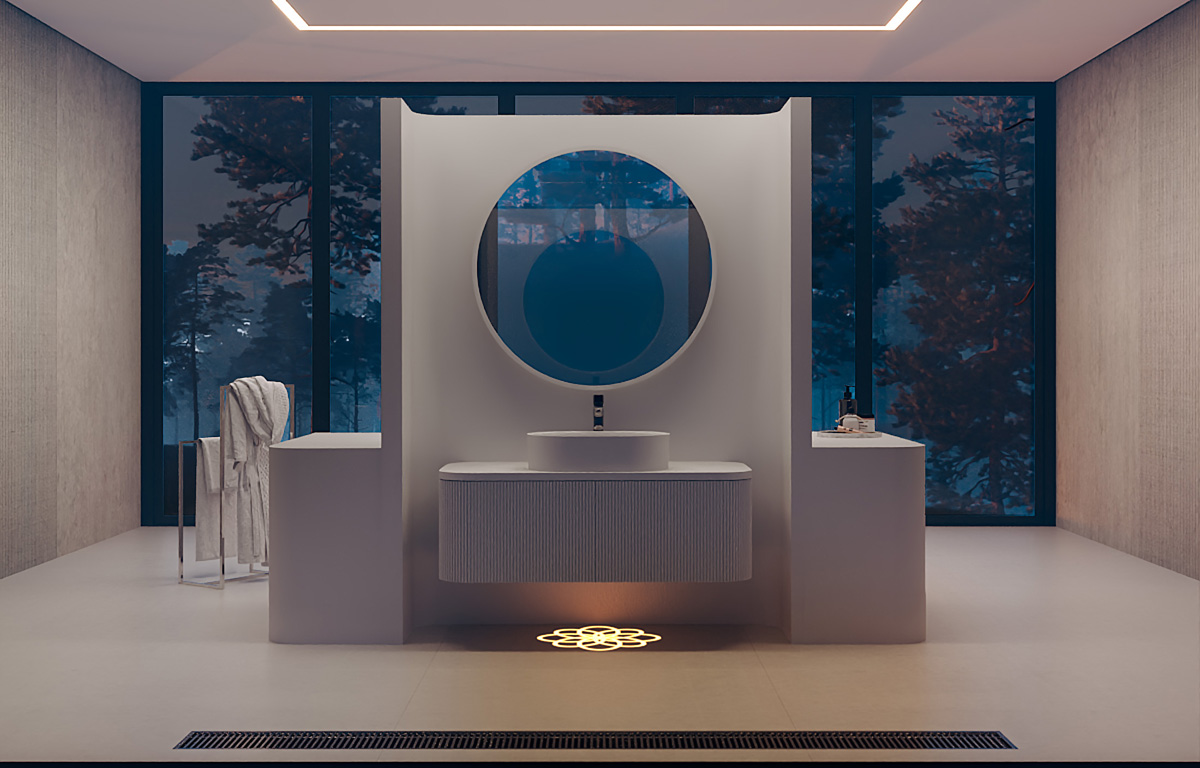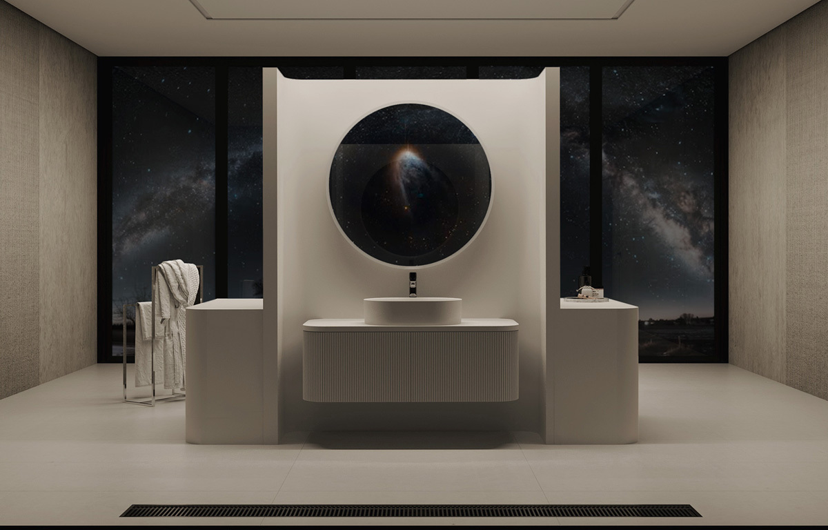 Благодаря своей форме и заложенной концепции, система органично вписывается в любые интерьеры — от более классических до ультрасовременных и футуристичных. Плавные линии и круг зеркала с подсветкой создают футуристические очертания, вызывая ассоциации с космическими объектами: восходом солнца на Марсе, мягким сиянием далеких планет или орбитальным светом, обнимающим поверхность. Такая форма делает конструкцию универсальной и выразительной, превращая её в эмоциональный и художественный акцент любого пространства. В лимитированных версиях системы хранится «тайна»: в основании одного из элементов скрыто устройство для подсветки-проекции, которая в ночь Ивана Купала в определённый момент загорается, рождая образ цветущего папоротника — мифа, который веками искали в эту ночь. Этот световой эффект превращает встречу с объектом в символическое событие, усиливает эмоциональное восприятие и создаёт уникальный, магический пользовательский опыт. Эта модульная система — не просто функциональный элемент, а предмет искусства, способный стать эмоциональным центром любого пространства, в любой точке мира.