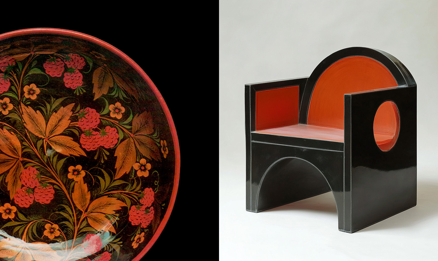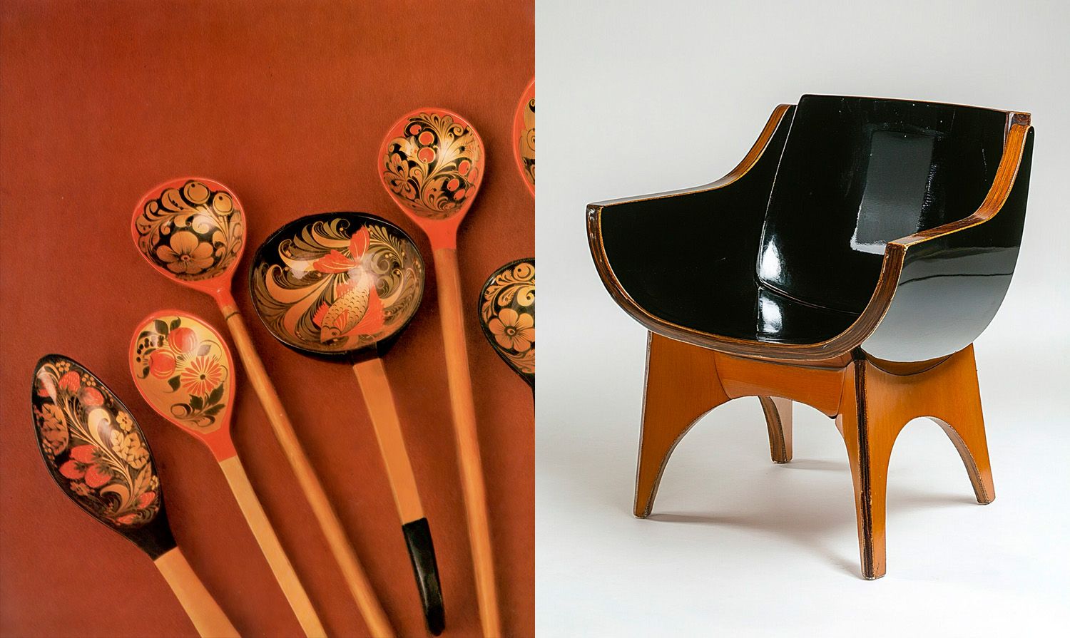 Концепция: В основе проекта лежит глубокое, но ироничное переосмысление хохломского промысла. Без прямого копирования росписи, дизайн акцентирует внимание на узнаваемых силуэтах, характерном лаковом глянце и благородном золотистом дереве. Цветовая палитра, включающая чёрное тулово, золотые плечики, киноварь горловину и малахитово-зеленый сюртук, является смелой современной интерпретацией традиционных оттенков. Использование шпонированного МДФ (шпон берёзы, ольхи или осины) отсылает к историческим материалам, привнося в проект уникальное чувство русского юмора и игривость.