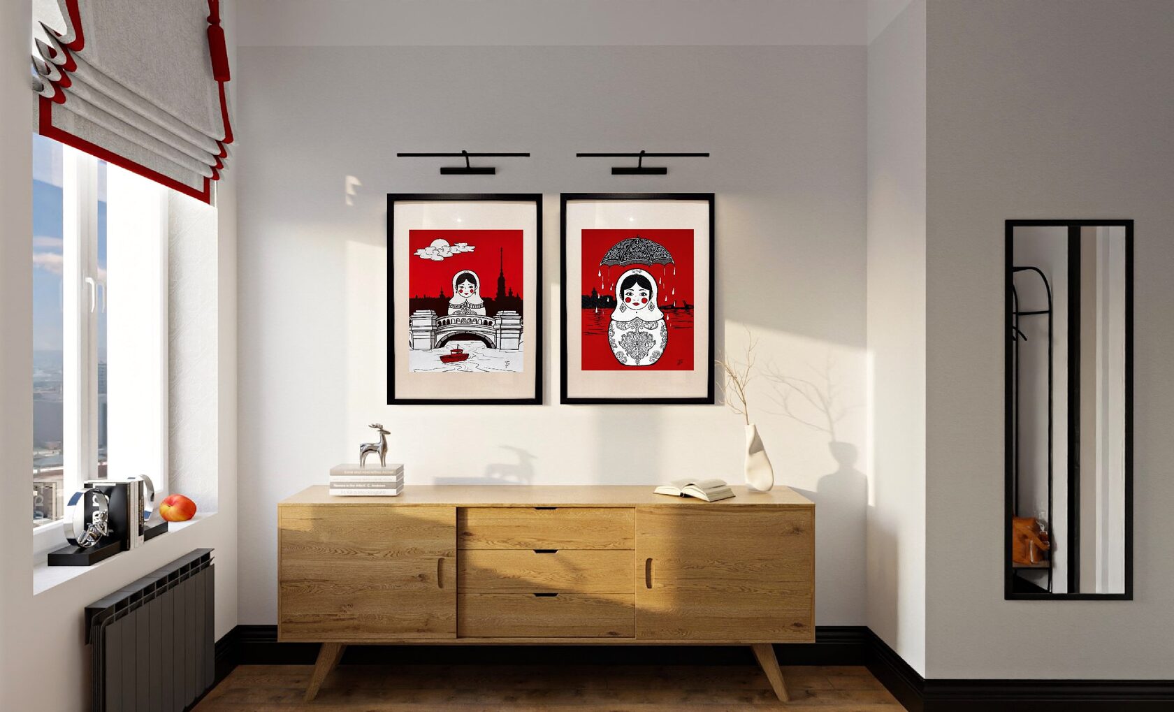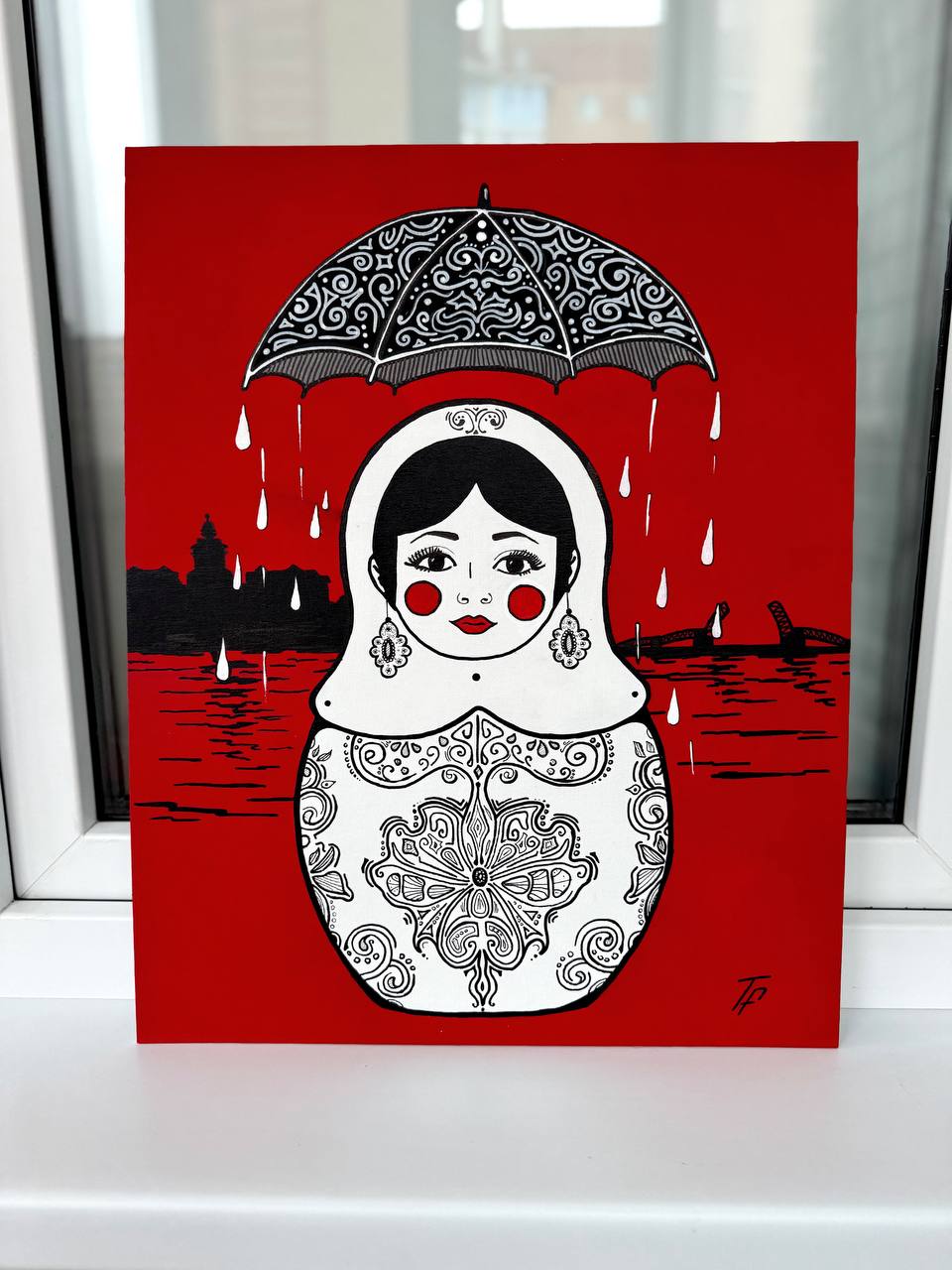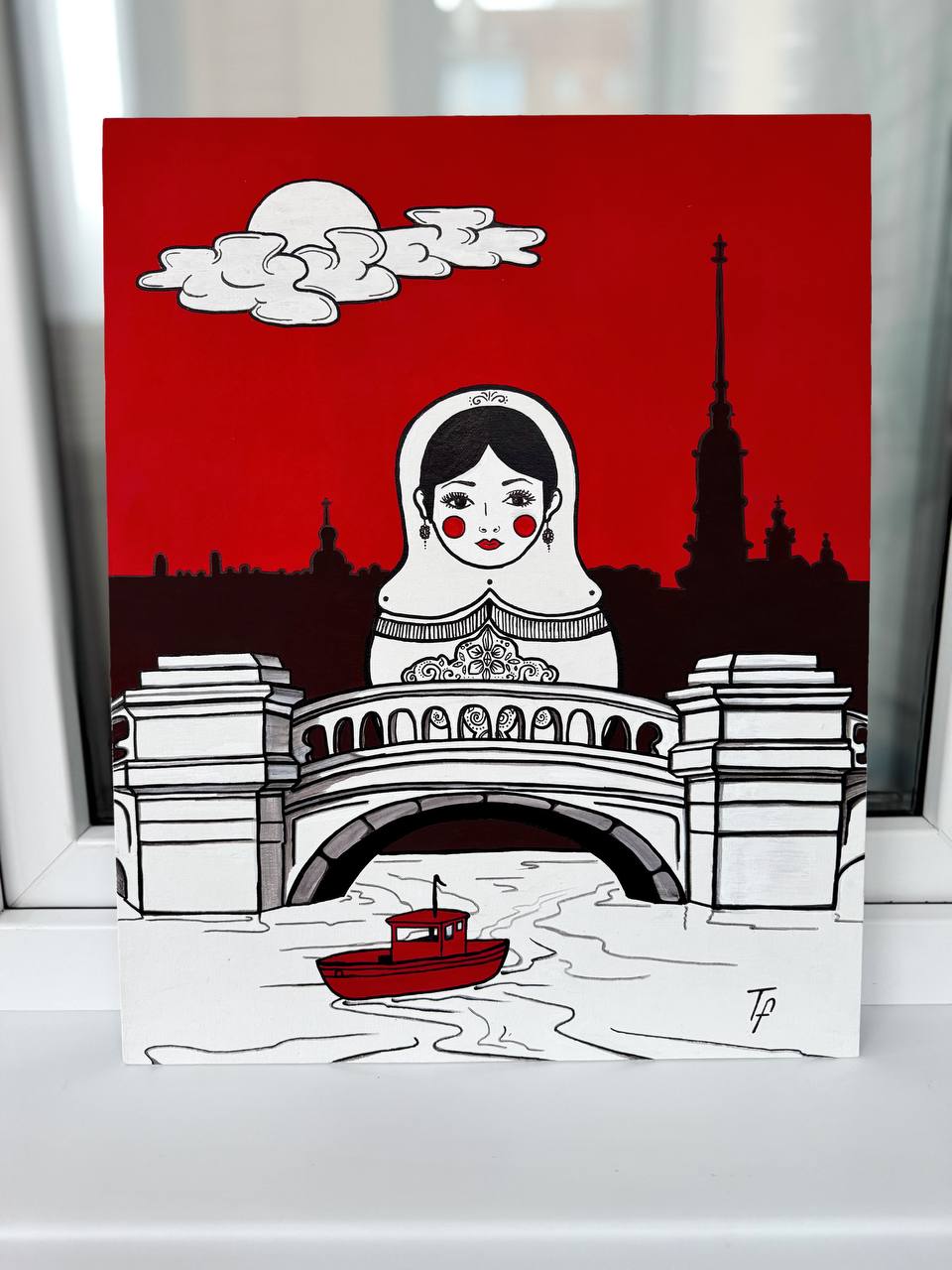 Концепция: В основе концепции лежит стремление выйти за рамки обычного городского пейзажа, превратив его в глубокий онтологический стоп-кадр русской культуры. Красный цвет используется не как акцент, а как древний знак торжественности и жизненной силы, а фон воспринимается как живая ткань истории. Современный стиль исполнения с минимумом цветов, чёткими линиями и контрастами позволяет трансформировать традиционный сувенир в мощный тотем, актуализируя традицию в современном художественном контексте. Каждое полотно, выполненное акрилом на холсте (40х50 см), приглашает к размышлению о культурной памяти.