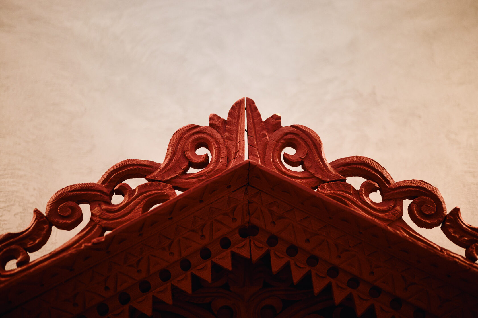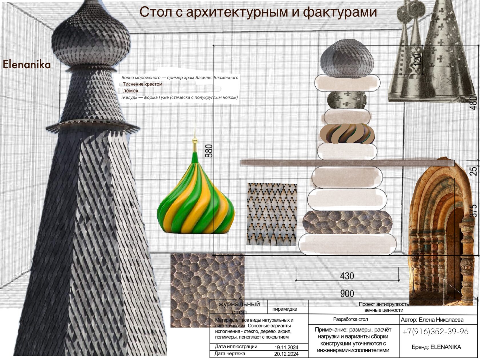 Концепция: Основная идея проекта — создание моста между прошлым и настоящим через синтез традиционного русского орнамента и современного минимализма. Объект задуман как "капсула культурной памяти", сохраняющая и переосмысливающая мотивы русского деревянного зодчества в контексте выставочного пространства. Черный задник усиливает скульптурность силуэта и глубину, подчеркивая историческое наследие через призму современного искусства.