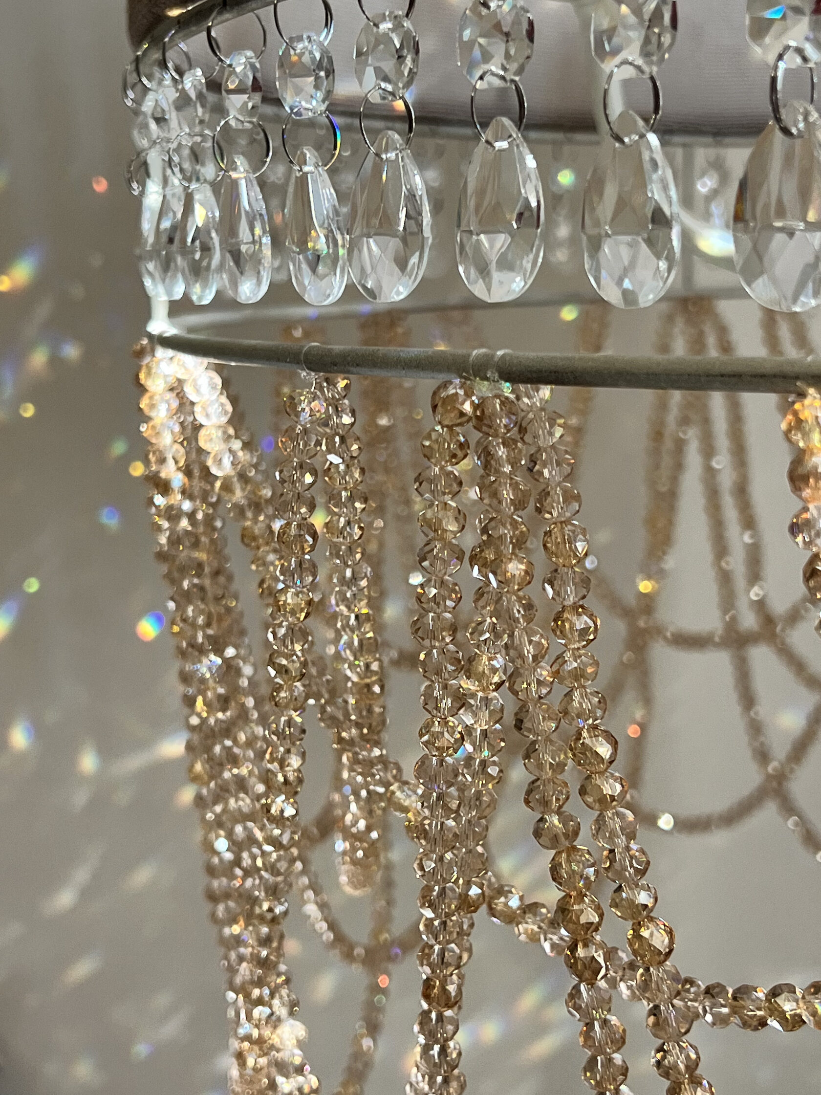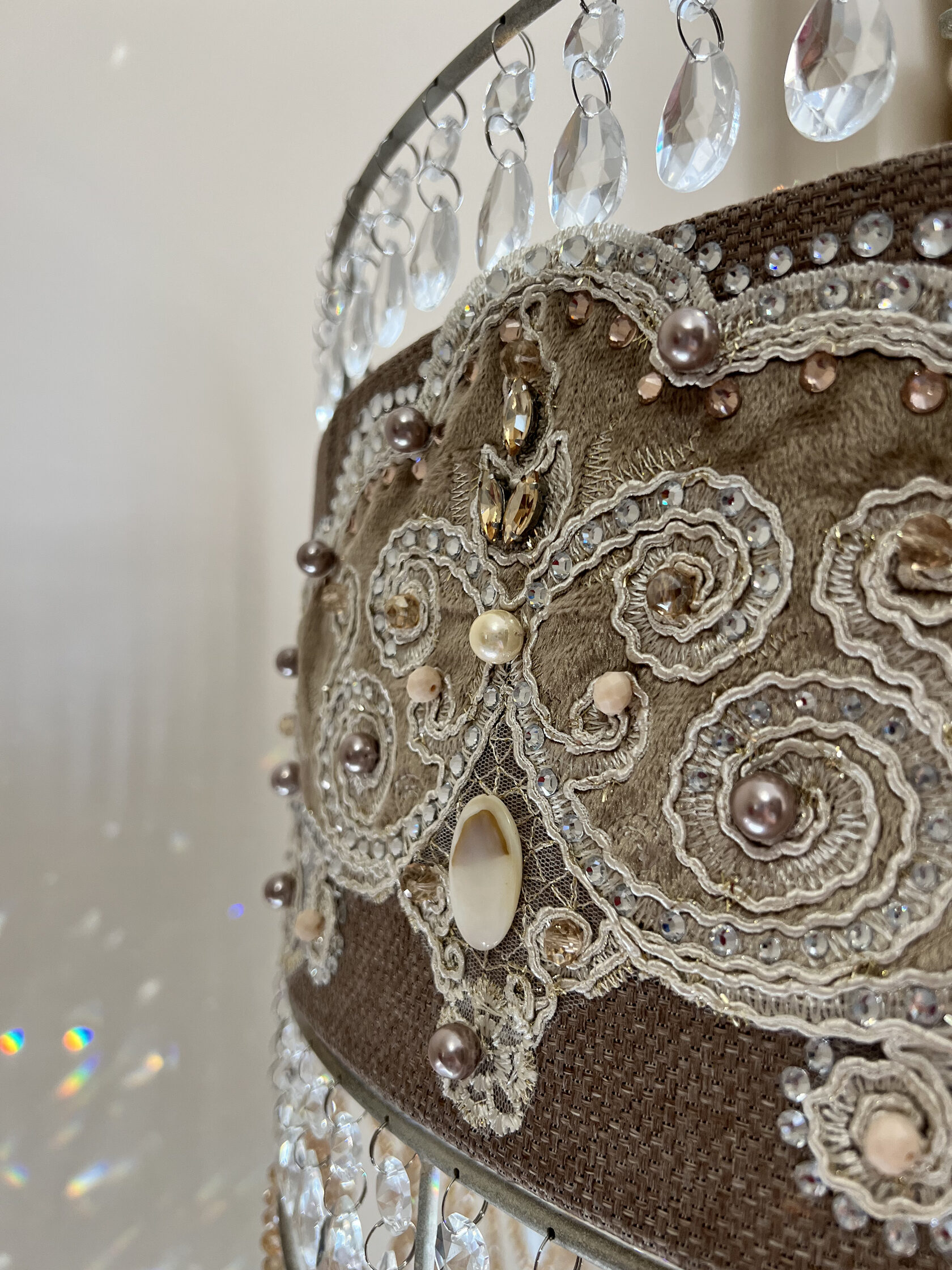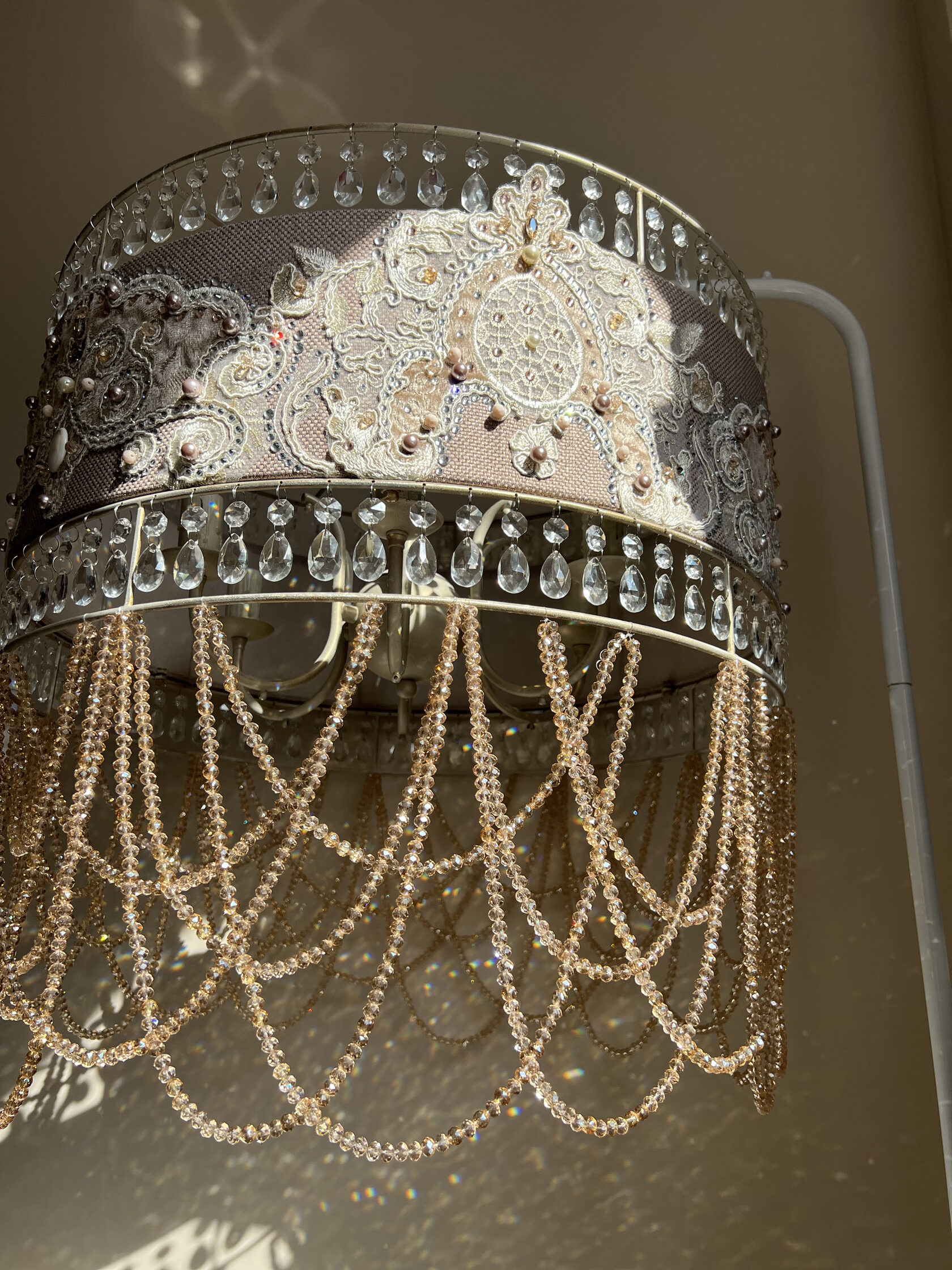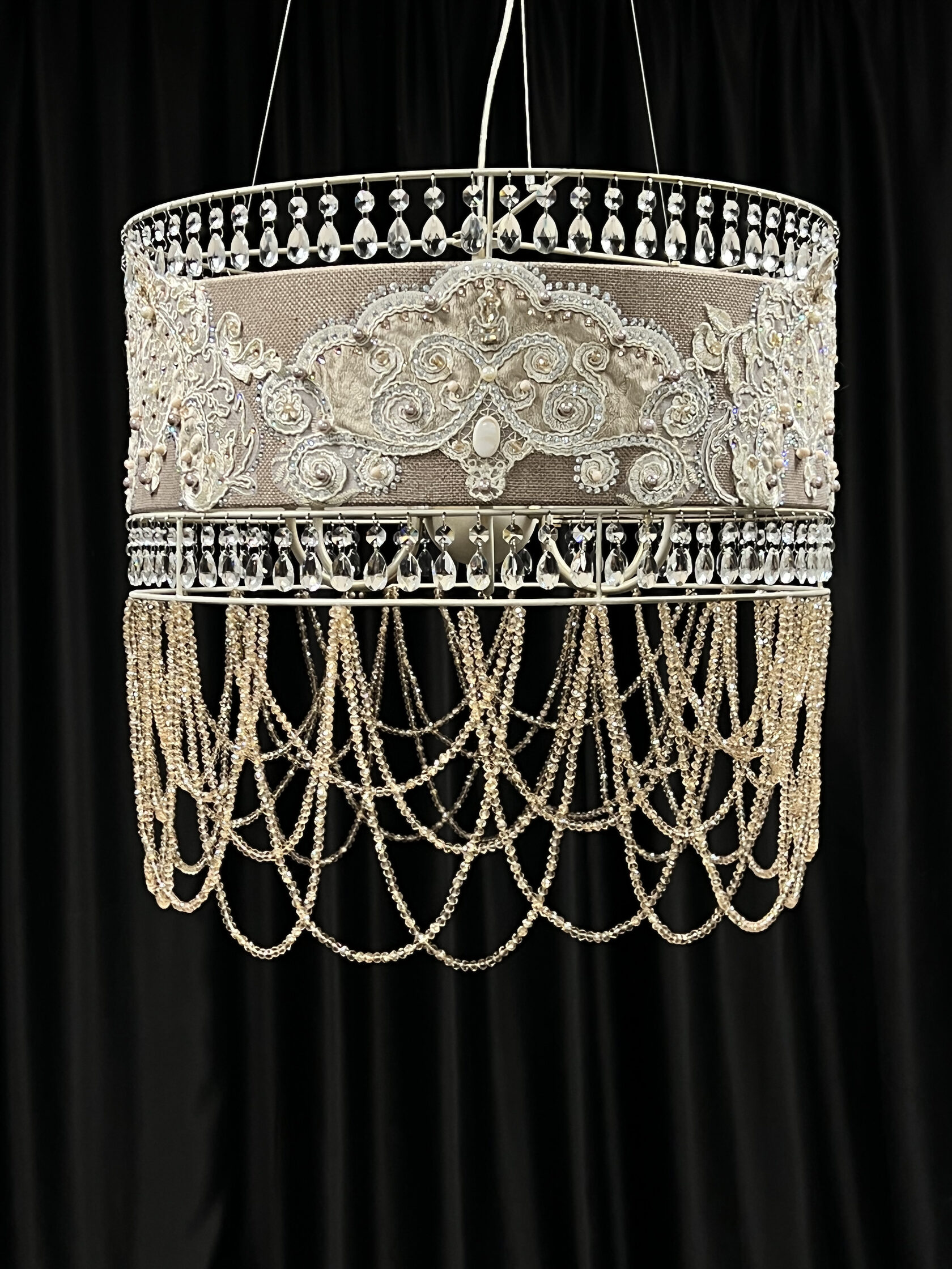 Этот абажур — больше, чем предмет освещения. Это культурный символ, превращённый в световой арт-объект. Его форма вдохновлена кокошником — важной частью русского народного костюма, символом женской красоты, грации и статуса. Вся поверхность украшена ручной вышивкой по бархату, инкрустированной натуральным жемчугом Майорка, перламутровыми камнями и сверкающими стразами Swarovski. Кружевной узор венчают хрустальные подвесы, придающие композиции объём, лёгкость и торжественность.