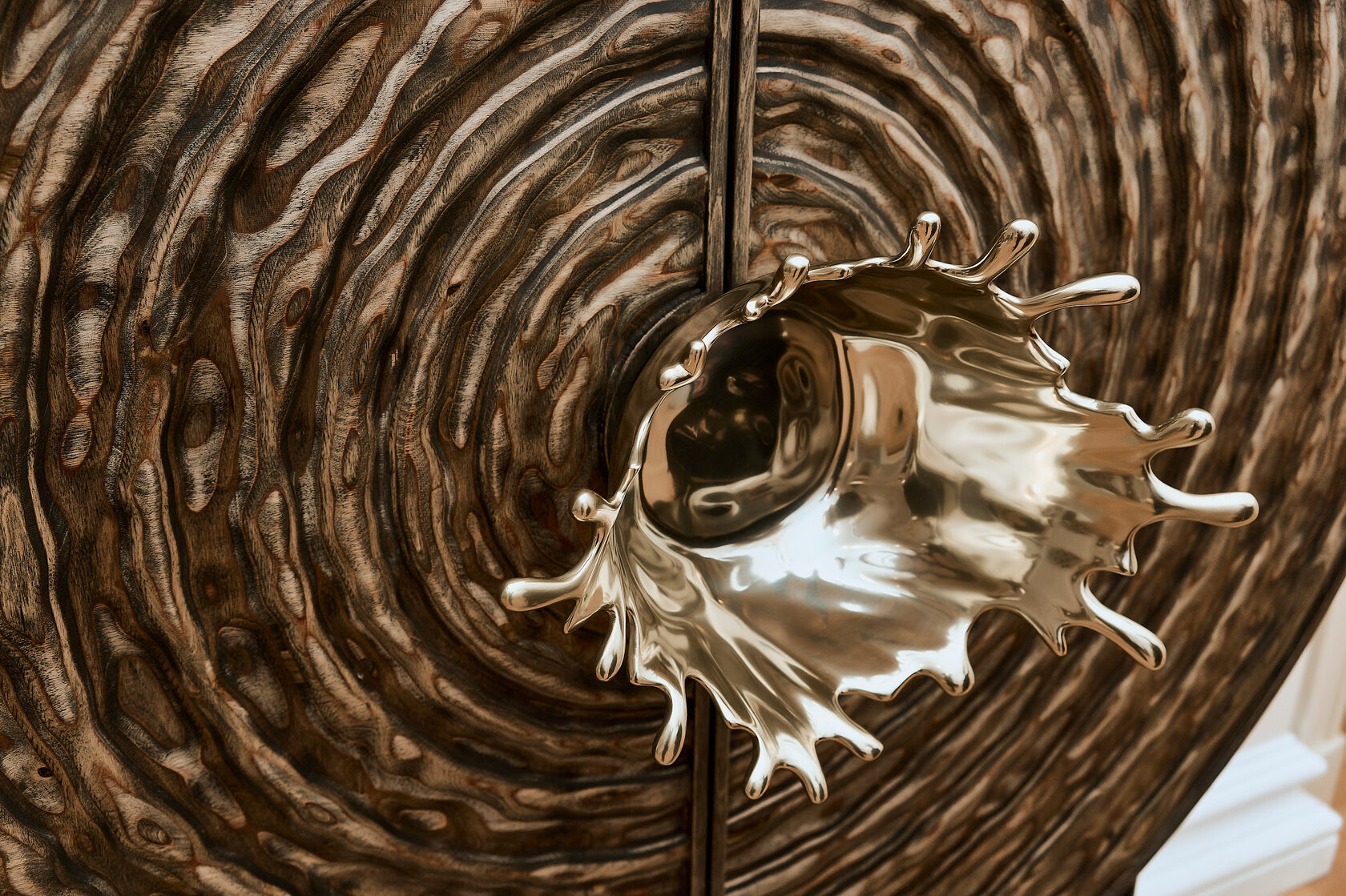 Концепция: В основе концепции лежит глубокое почтение к озеру Светлояр — священному водоему Руси, окутанному легендами о граде Китеже и целительных свойствах. Круглая форма комода символизирует безмятежную озерную гладь, а центральная рукоятка-капля, словно касаясь воды, создает эффект расходящихся кругов, воспроизведенных на фасаде. Эта метафора созерцания воды, обладающей сакральными свойствами очищения и освящения, воплощена с помощью передовой трехмерной фрезеровки, позволяющей формировать сложные, объемные рельефы и обеспечивать исключительный тактильный опыт.