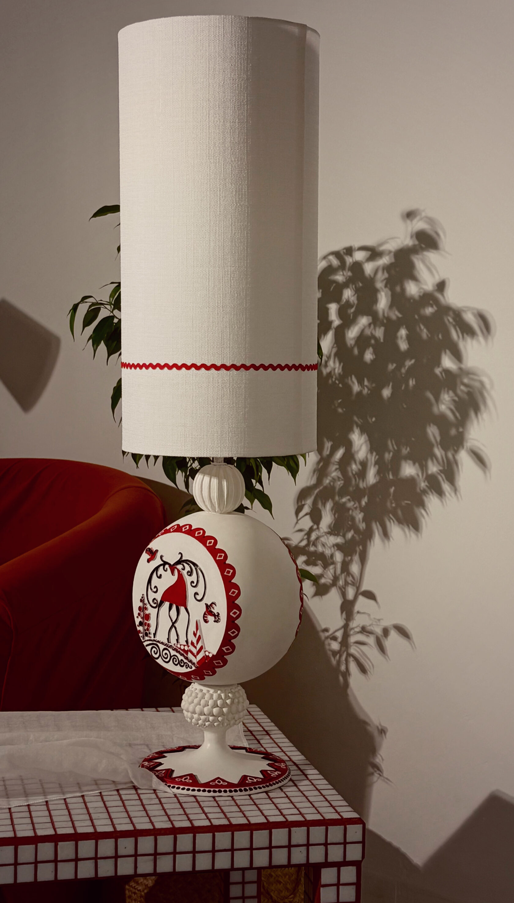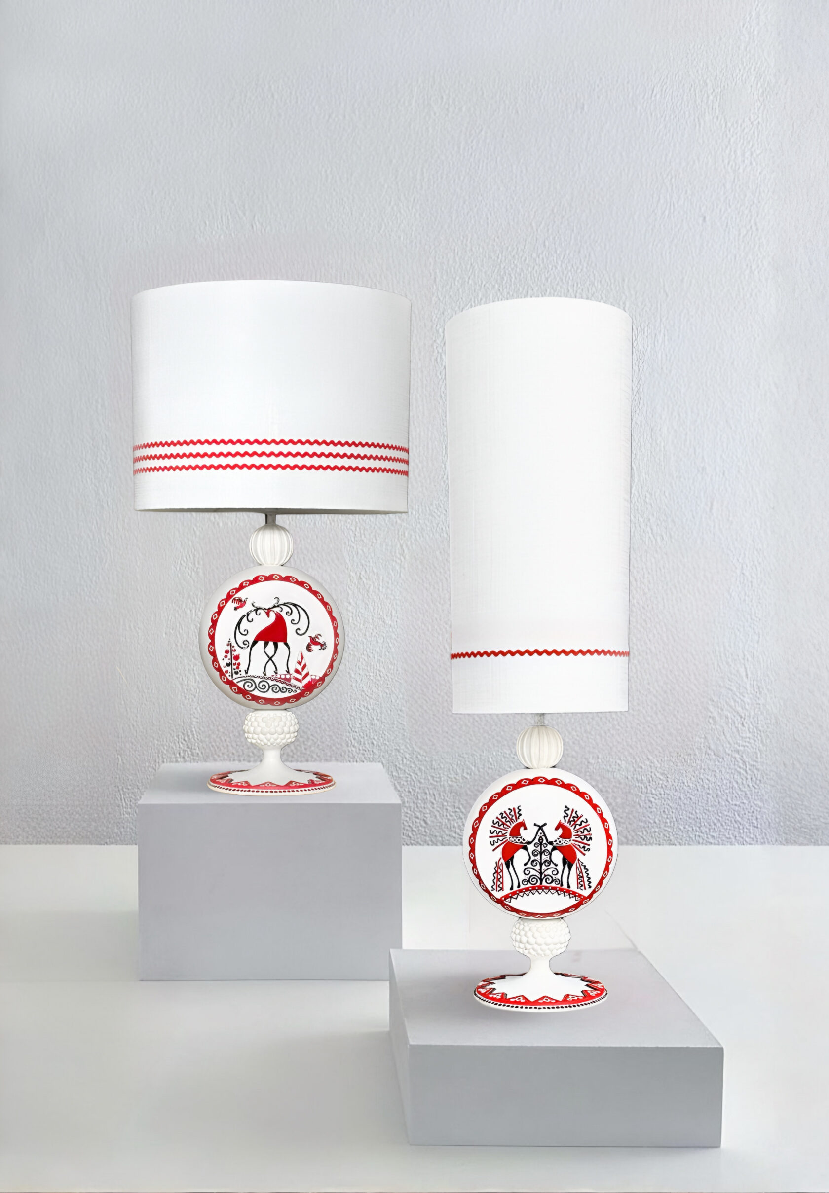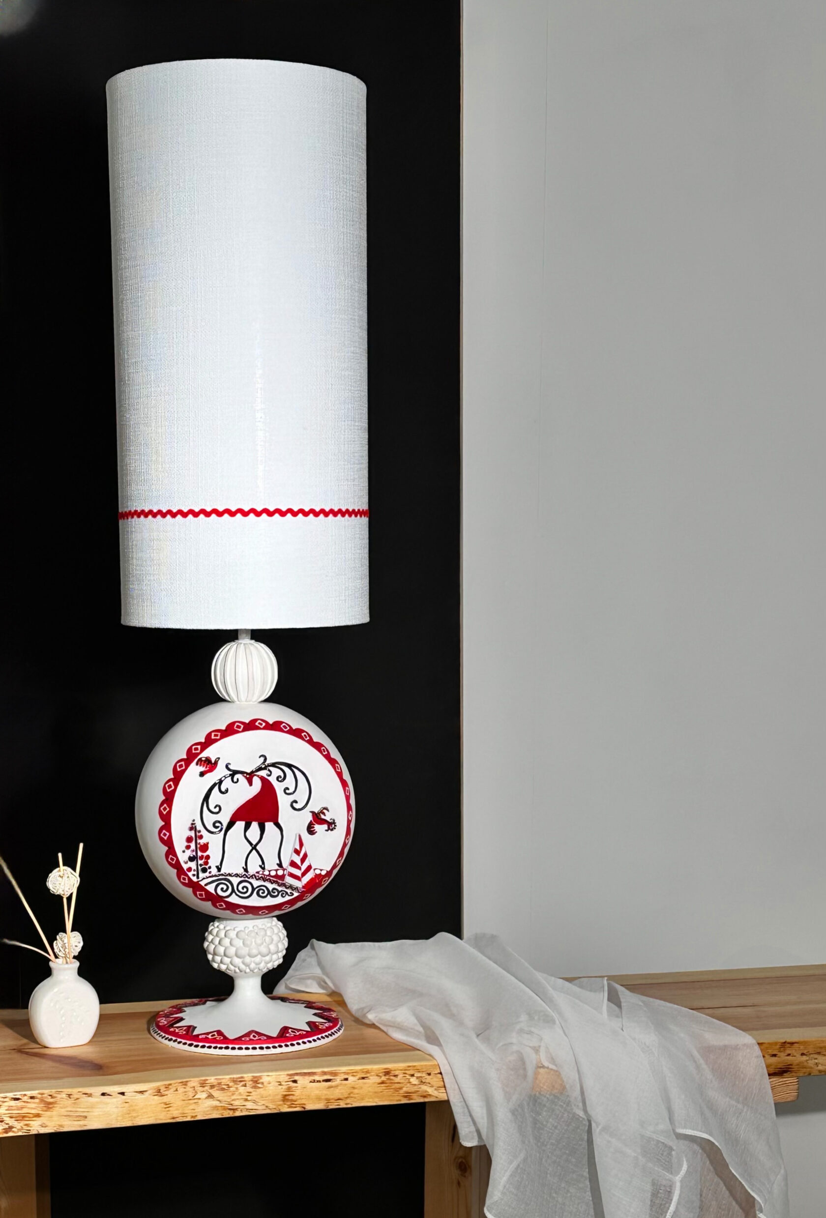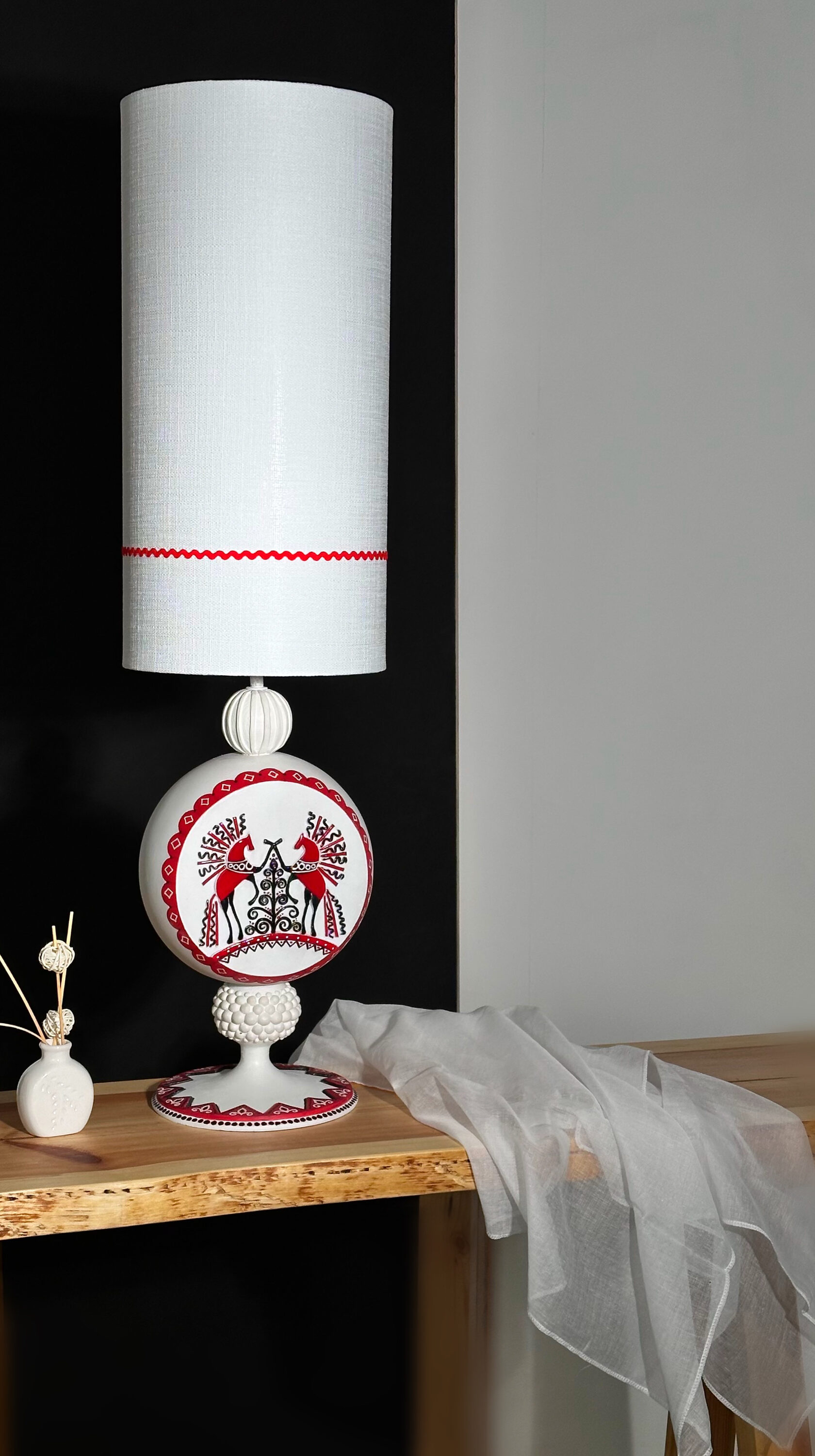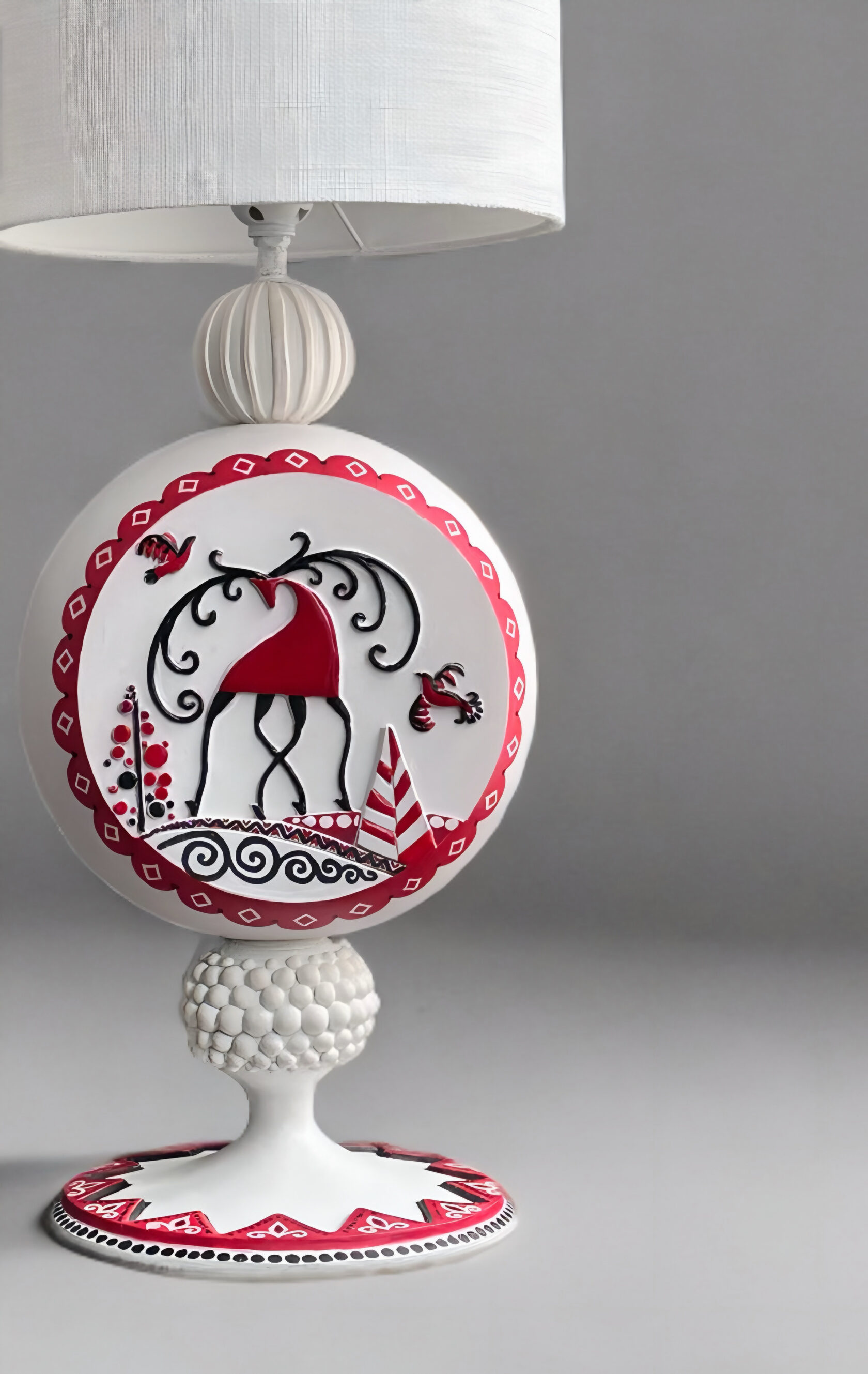 Концепция: Концепция проекта основана на глубоком переосмыслении традиций мезенской росписи, воплощенной в современной технике аппликационного рельефа. Этот подход, усиленный глянцевым покрытием, придает изделию выразительность и многомерность. Основание, искусно выполненное из массива сибирской сосны методом столярной обработки, подчеркивает природную аутентичность. Возможность яркого или монохромного исполнения позволяет лампе гармонично интегрироваться как акцент в сдержанные интерьеры, так и стать ключевым элементом, заявляющим о культурных истоках.