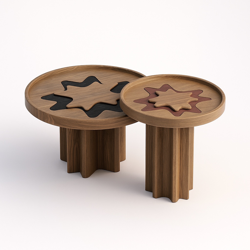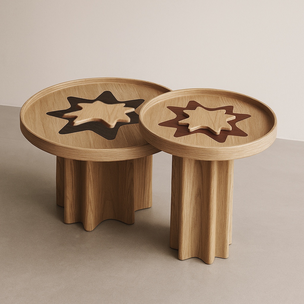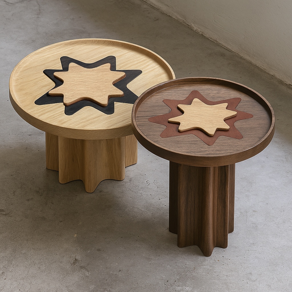 Концепция: Главным символом дизайна стала восьмиконечная звезда толэзё — «лунный узор». Этот знак издавна считался одним из ключевых в удмуртской культуре, символизируя связь человека с космосом и природой. Столики выполнены в комбинированной отделке: дерево и эмаль. По желанию заказчика столешницы могут быть изготовлены из стекла или выполнены в криволинейной форме, что делает коллекцию гибкой и персонализируемой.
