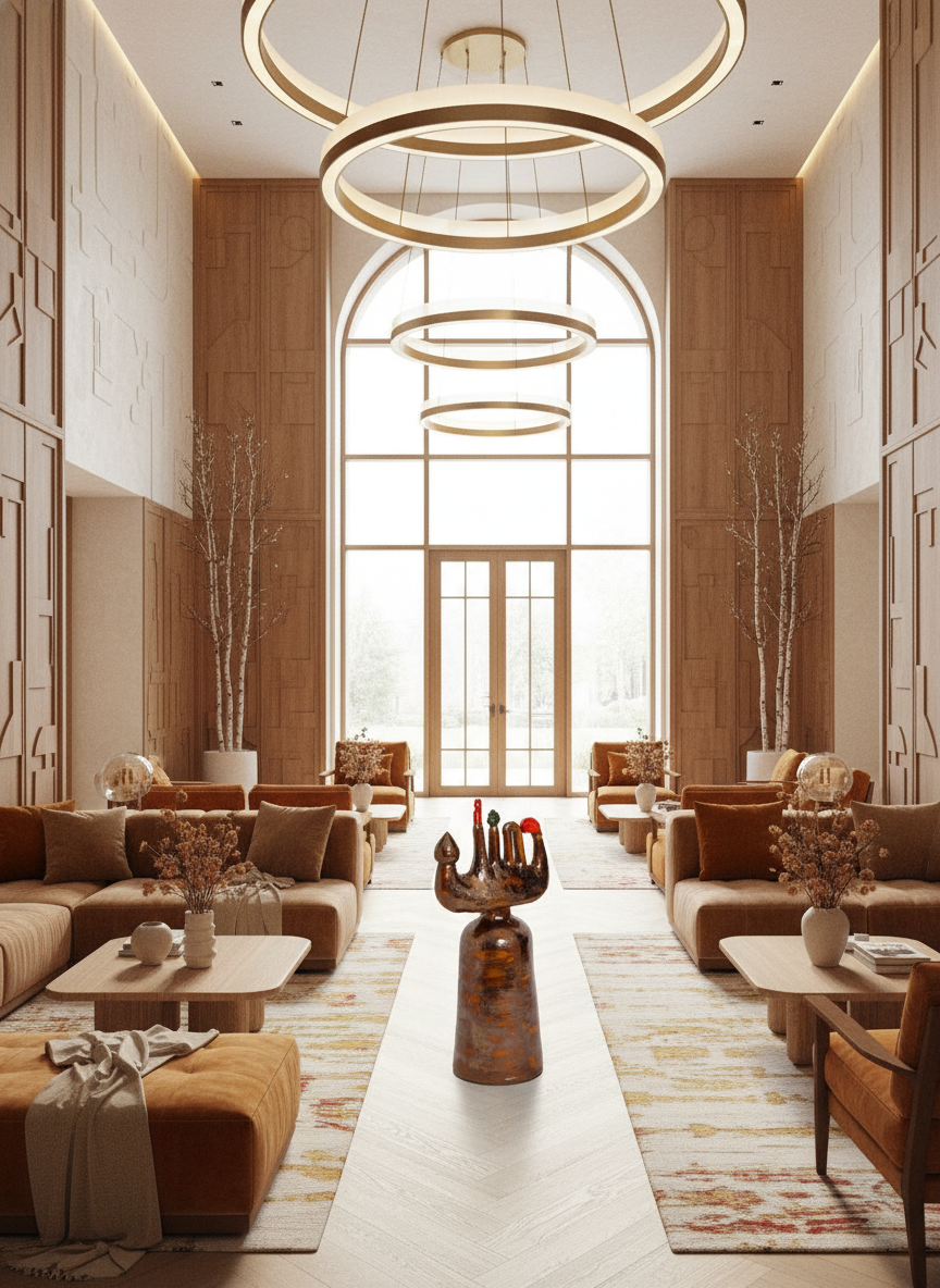 Концепция: Главная идея проекта — воплотить символ домашнего очага, источника тепла, жизни и уюта. Дизайн сочетает современный взгляд с глубоким культурным кодом, создавая живой и эмоциональный объект, который органично вписывается в интерьер.