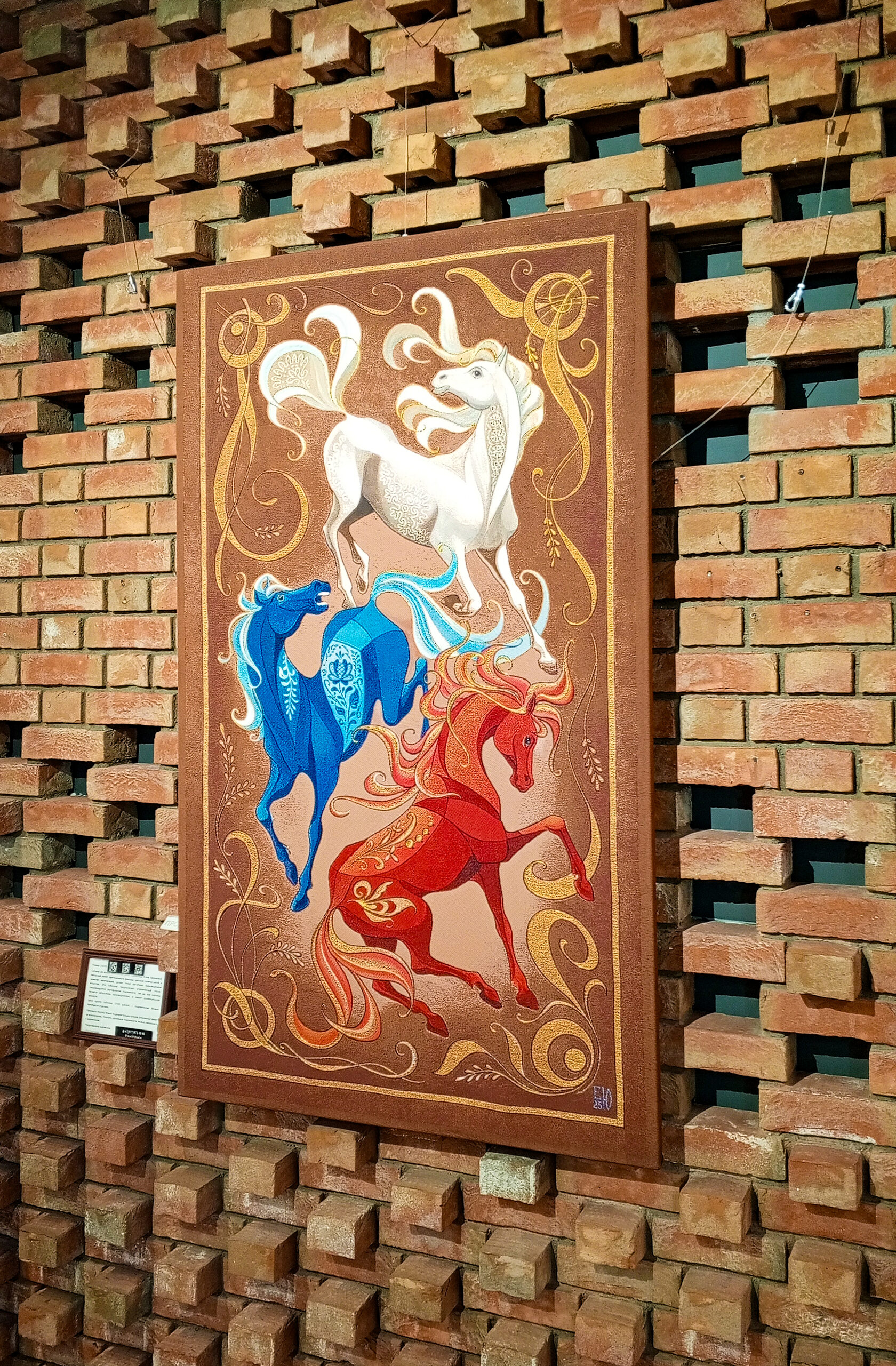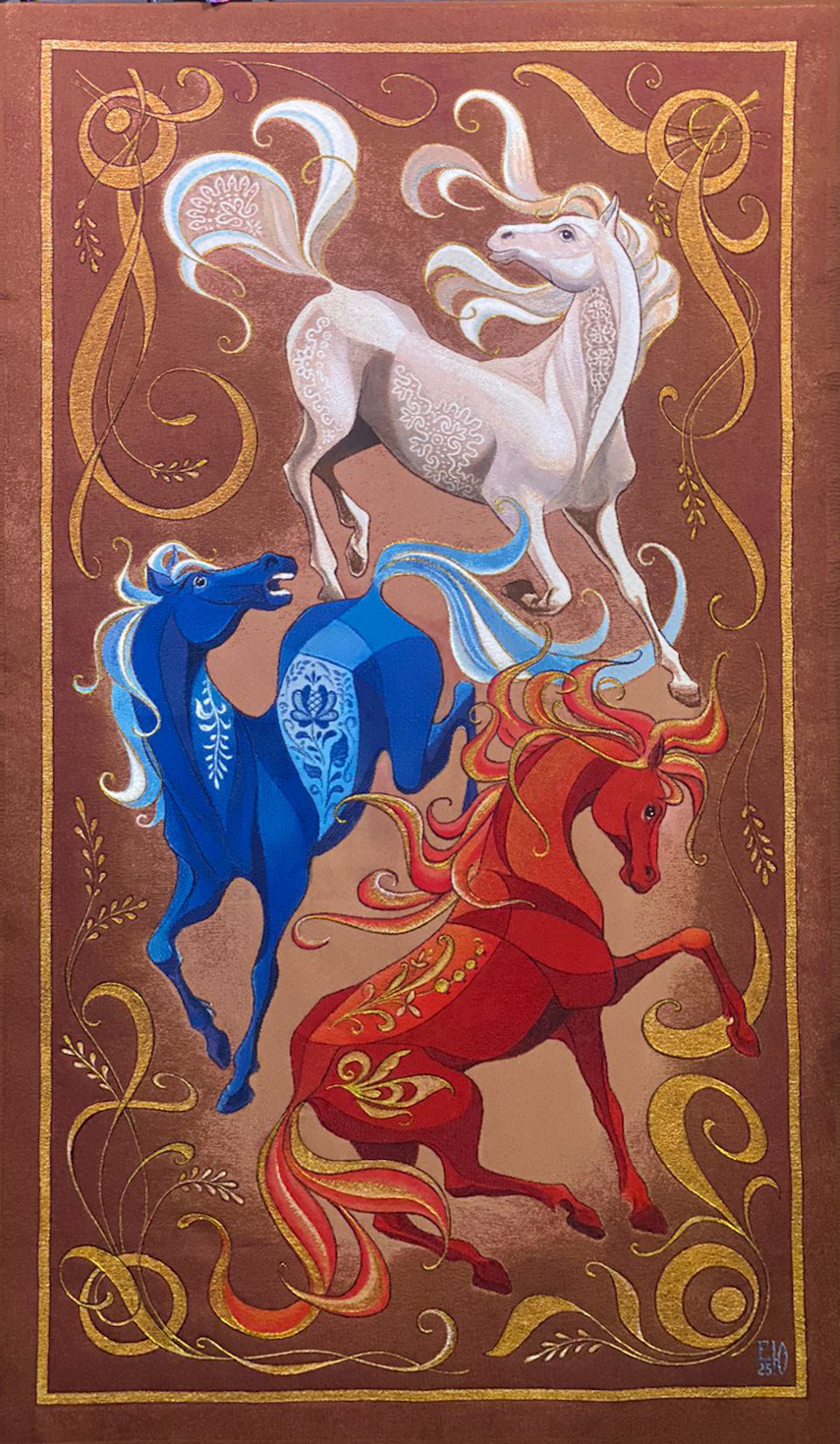 Концепция: Основная концепция гобелена заключается в глубокой символической взаимосвязи между образами трёх грациозных лошадей и богатством русской культурной традиции. Знаменитые народные промыслы, такие как Гжель, Хохлома и Вологодские кружева, органично вплетаются в композицию, ассоциируясь не только с Россией, но и с цветовой палитрой государственного флага, создавая многослойный визуальный нарратив.