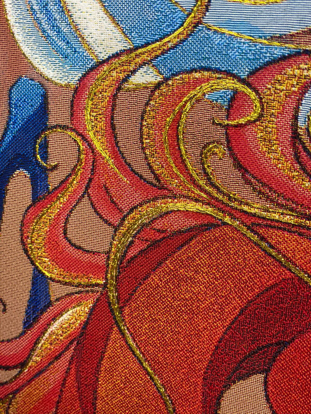 Этот авторский жаккардовый гобелен представляет собой яркое и динамичное художественное произведение, выполненное в глубокой русской народной стилистике. В его композиции искусно объединены ключевые национальные символы России: стремительные образы трёх скачущих лошадей, традиционные русские промыслы и величие российского Триколора.