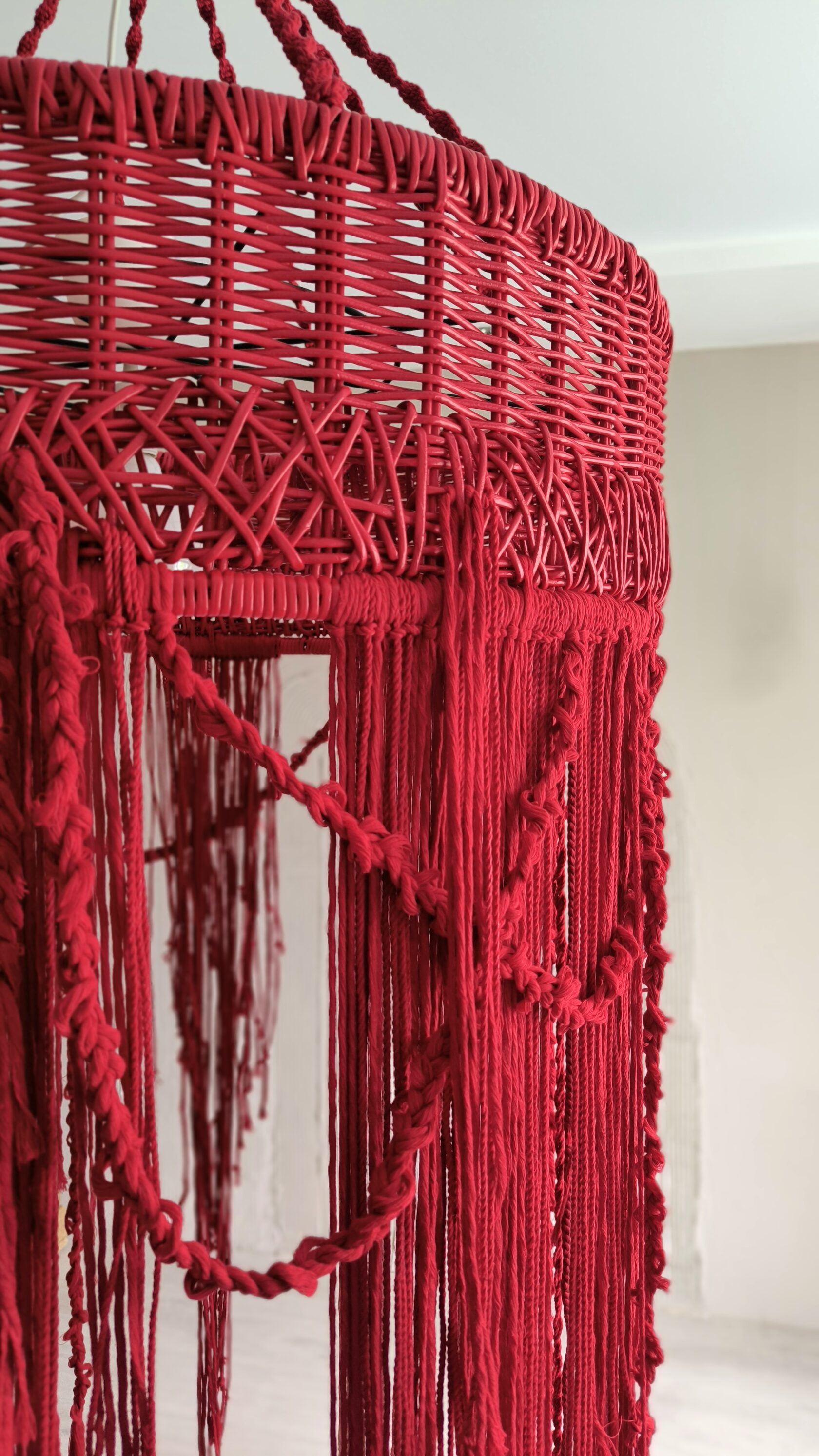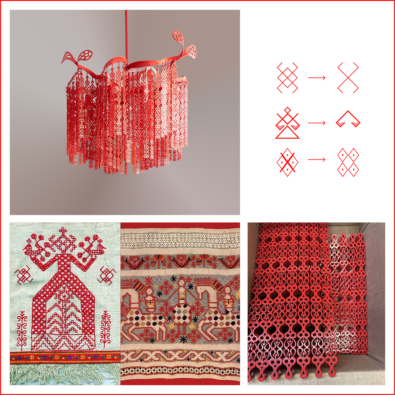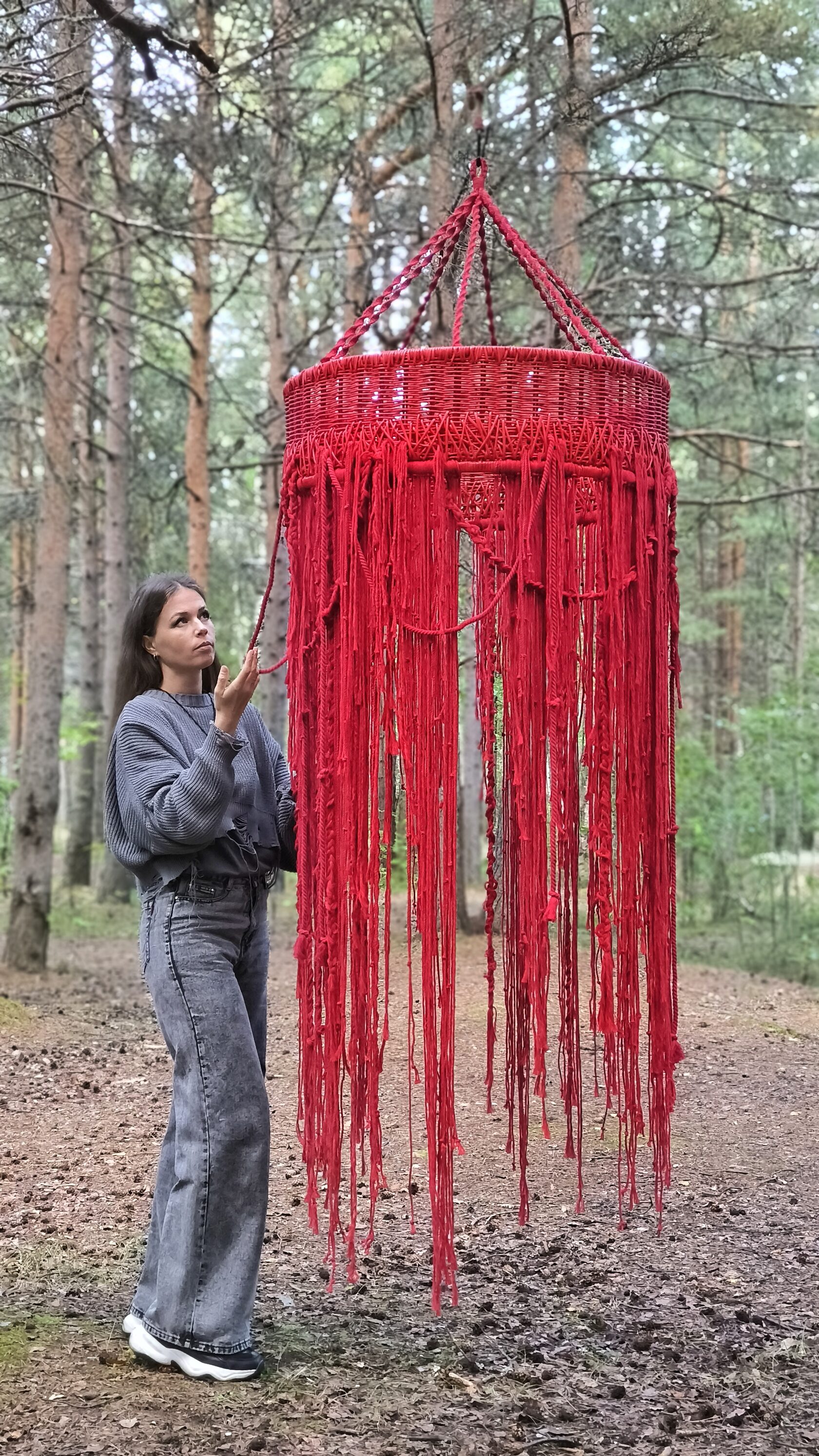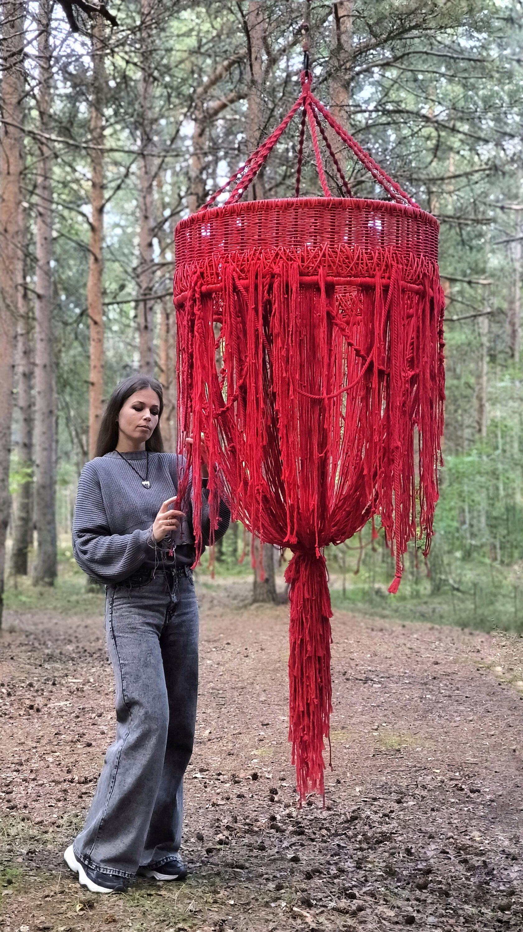 Концепция: В основе концепции лежит архетип Великой Богини-прародительницы, воплощенной в славянской традиции как Макошь. Конструкция люстры состоит из стилизованных металлических подвесов, напоминающих вытянутые женские силуэты, повторяющиеся в ритме традиционной бахромы и ожерелий. Эти элементы служат знаками плодородия, защиты и жизненной силы, присутствующими в предметной культуре Руси. Центральный стержень символизирует ось мира. Насыщенный красный цвет люстры — цвет крови, земли и огня — несет в себе значения красоты, защиты и внутренней энергии, характерные для русской культуры. Подвижные подвесы создают легкий звуковой эффект, добавляя динамики и чувственности образу.