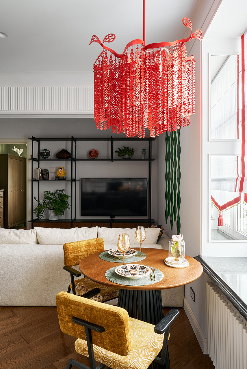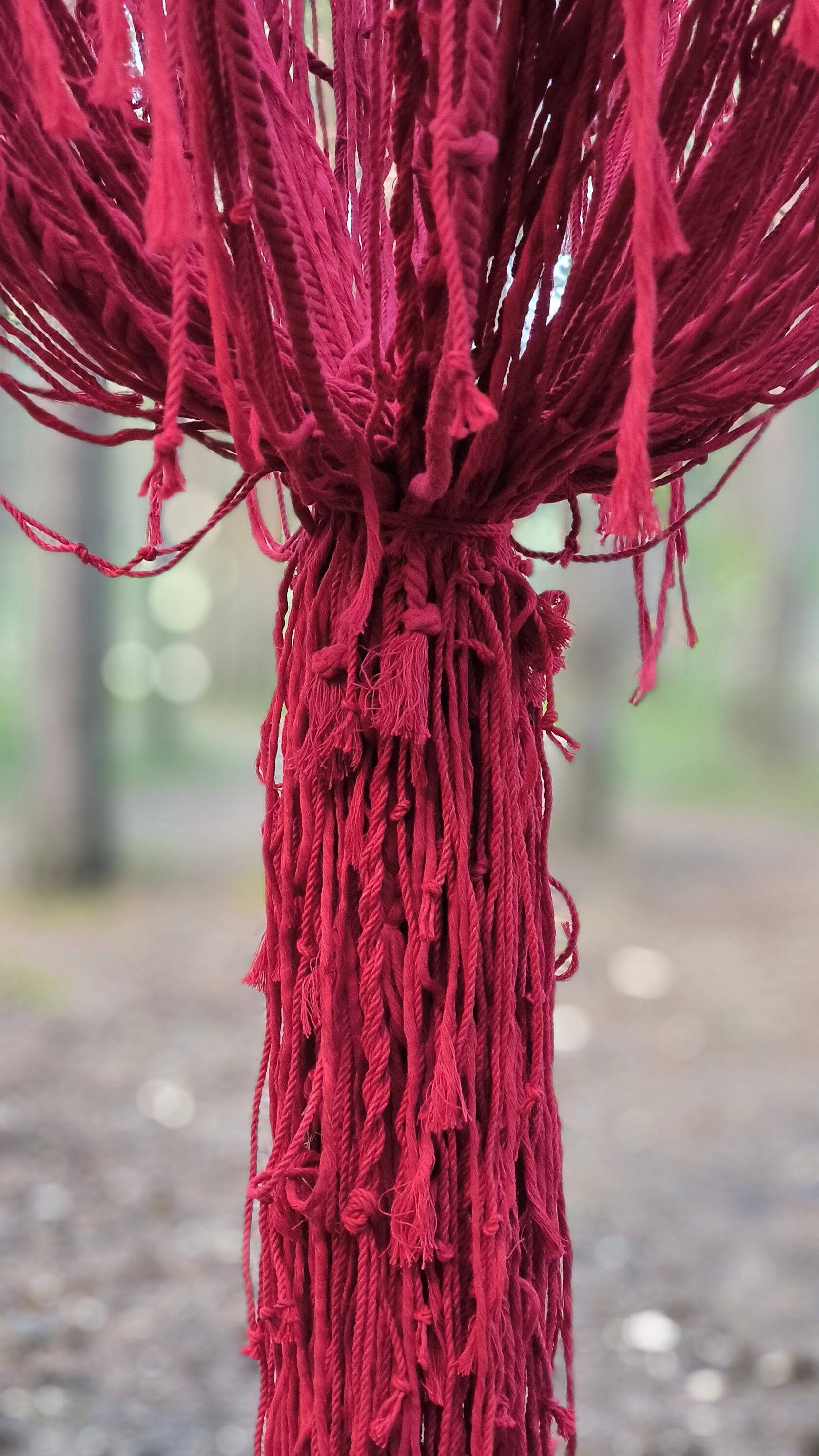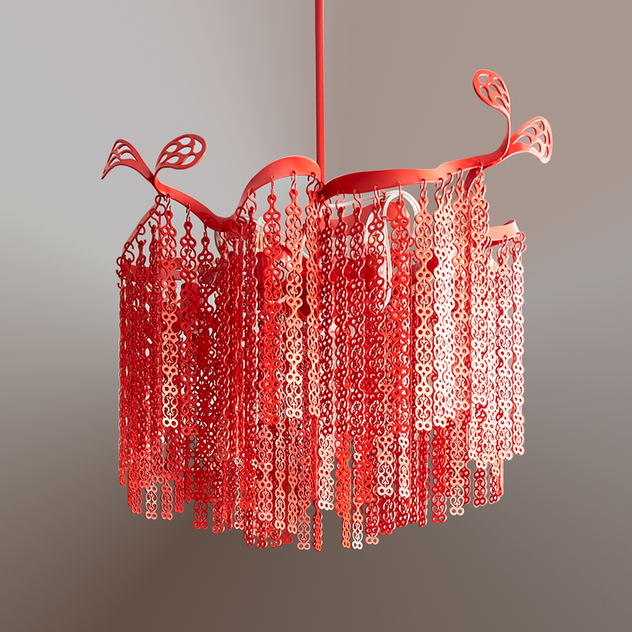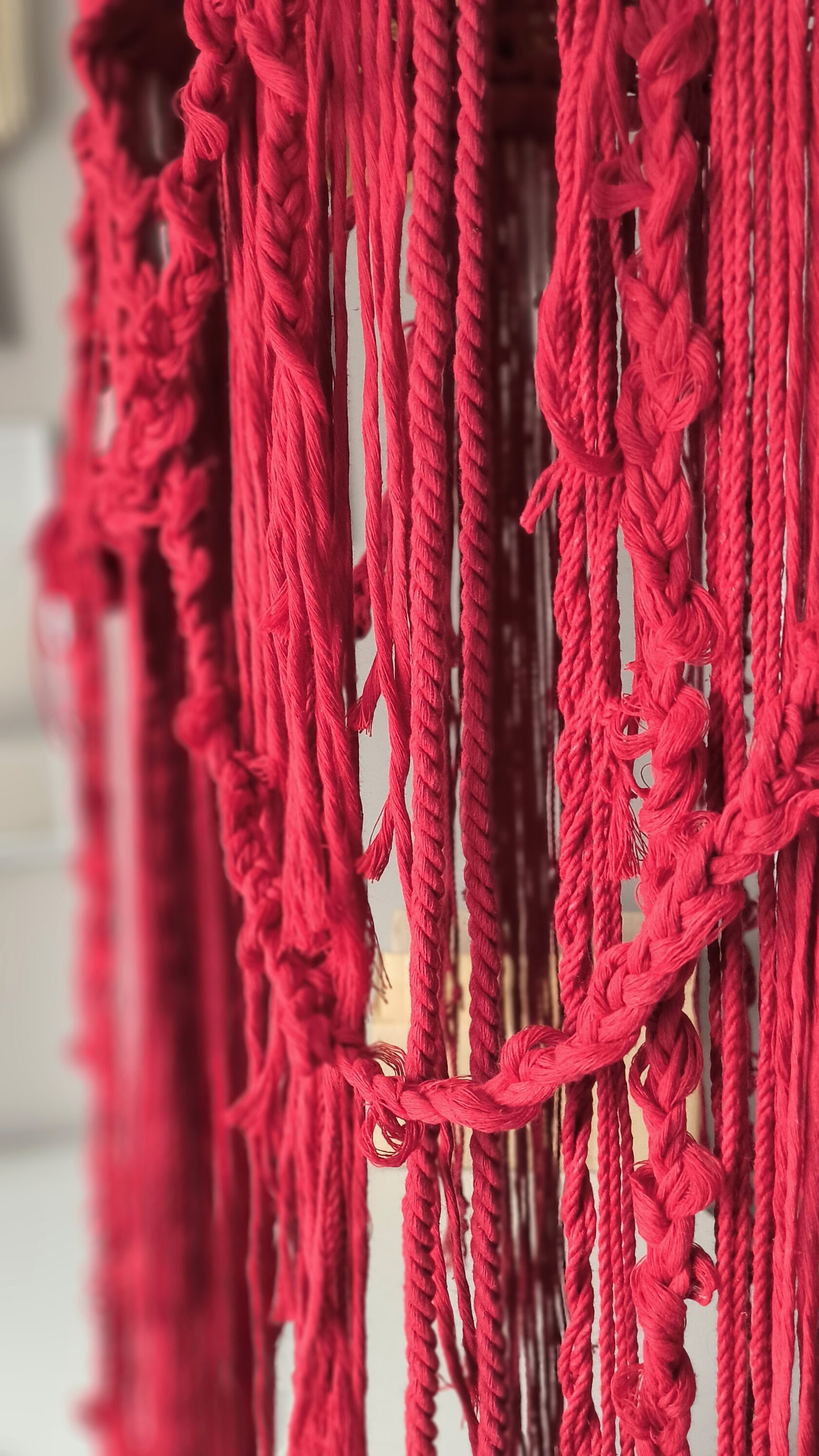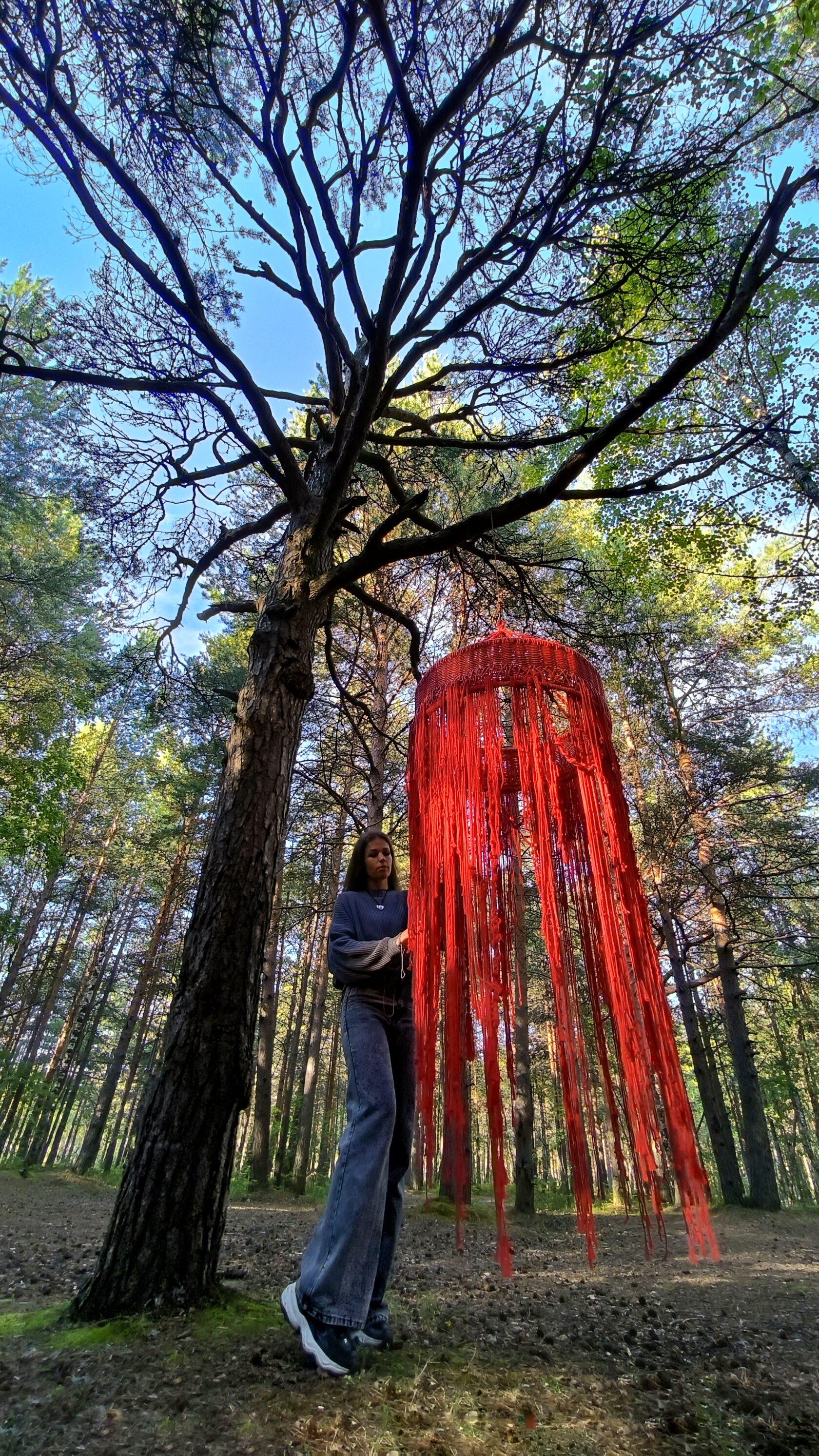 Концепция: В основе концепции лежит архетип Великой Богини-прародительницы, воплощенной в славянской традиции как Макошь. Конструкция люстры состоит из стилизованных металлических подвесов, напоминающих вытянутые женские силуэты, повторяющиеся в ритме традиционной бахромы и ожерелий. Эти элементы служат знаками плодородия, защиты и жизненной силы, присутствующими в предметной культуре Руси. Центральный стержень символизирует ось мира. Насыщенный красный цвет люстры — цвет крови, земли и огня — несет в себе значения красоты, защиты и внутренней энергии, характерные для русской культуры. Подвижные подвесы создают легкий звуковой эффект, добавляя динамики и чувственности образу.