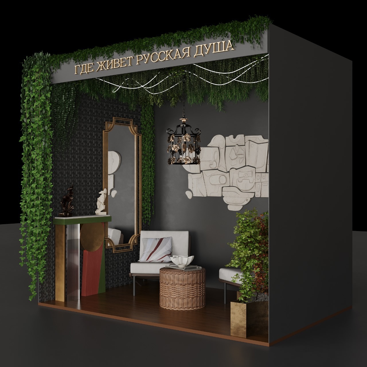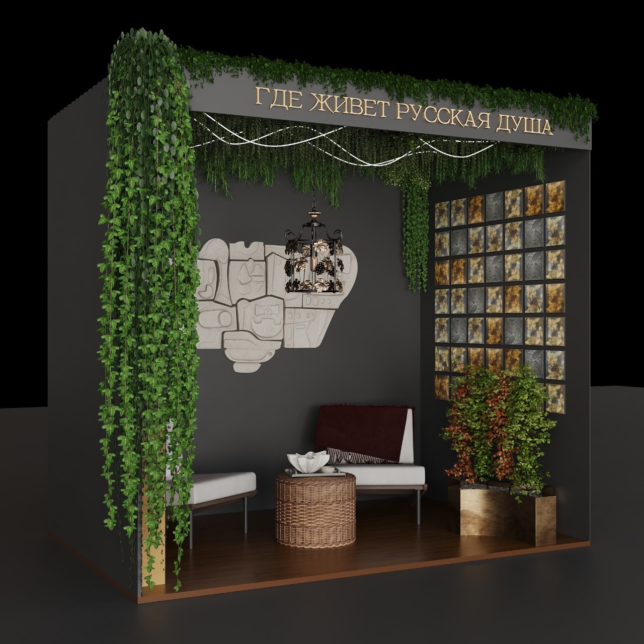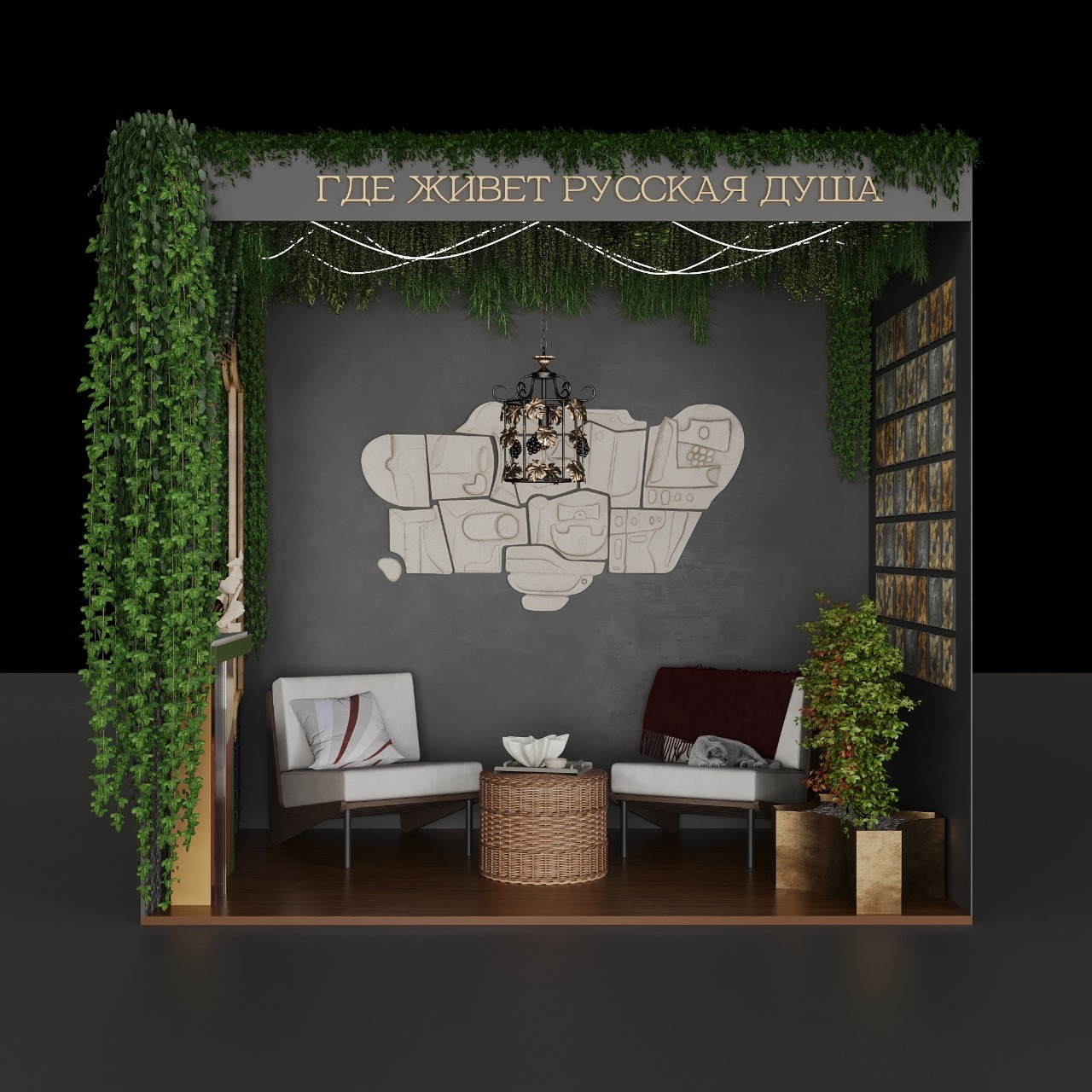 Концепция: Проект выполнен в нескольких вариантах: в фактурах русской архитектуры, отражающих монументальность и традицию; в образах русского застолья, как символа общения и близости; в простой и брутальной версии, подчёркивающей честность материалов и форм. Каждое решение объединяет в себе игру памяти, функциональность и культурные ассоциации.