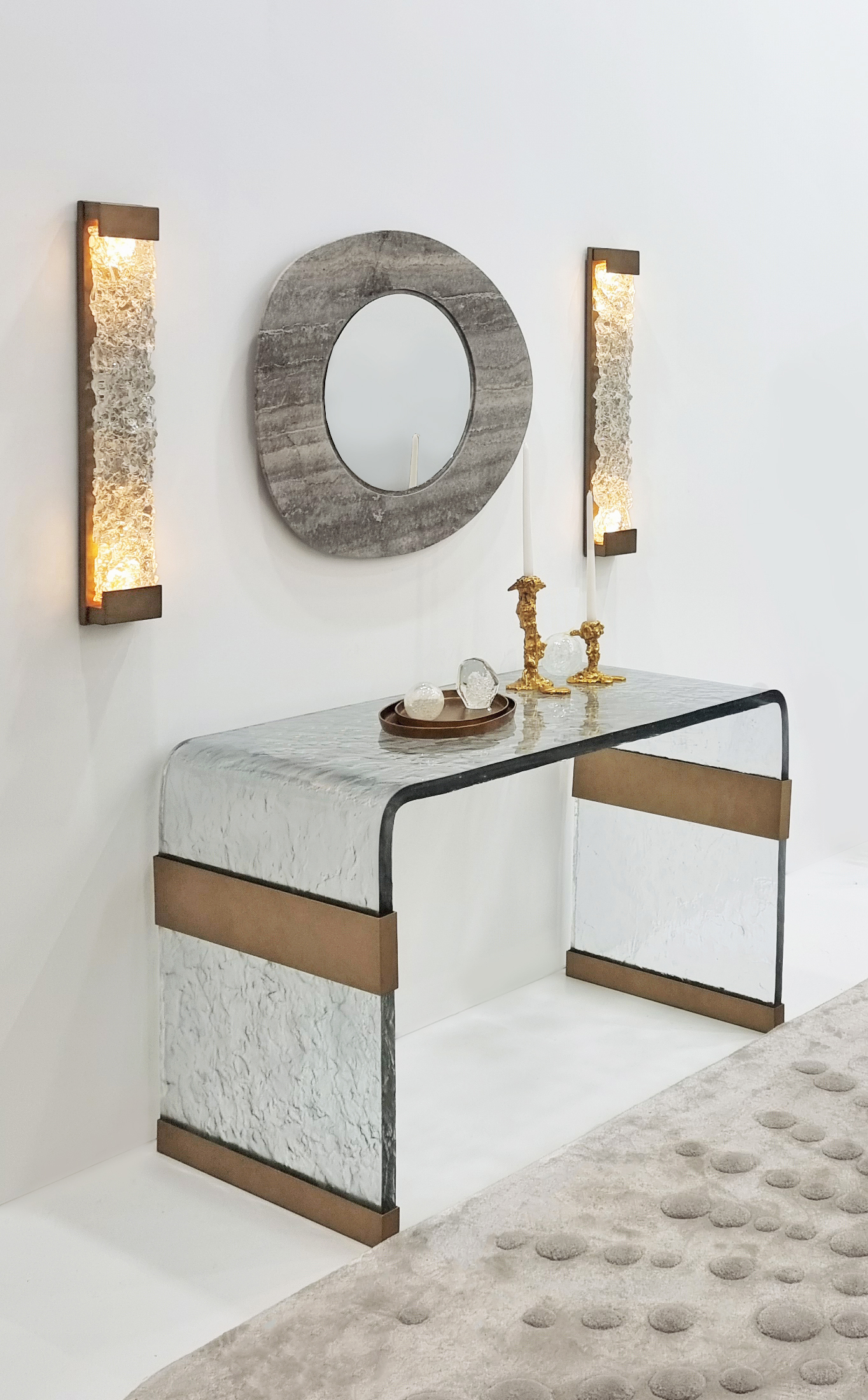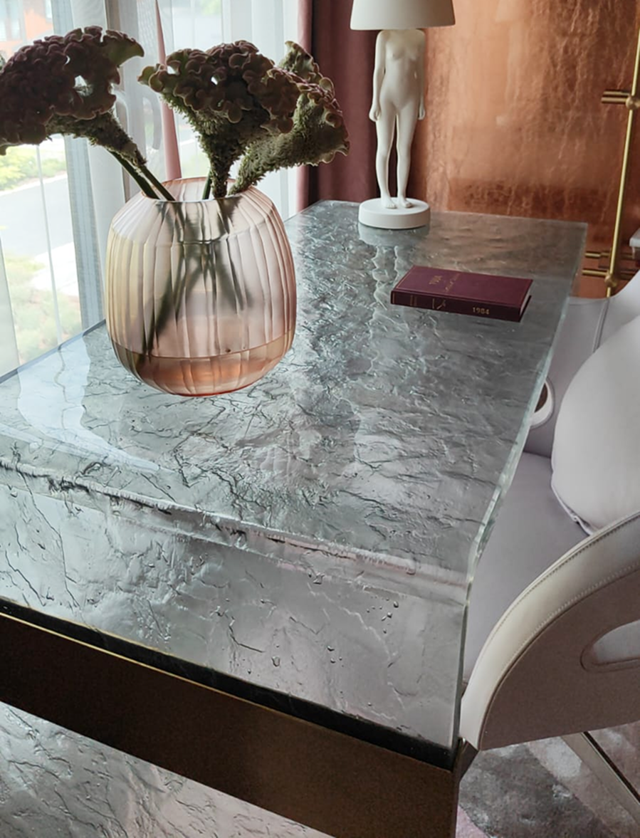 Уникальная технология Стеклянная столешница создана вручную: три слоя спекаются, затем изгибаются для эффекта «ледяного излома». Латунные крепления повторяют рисунок природных трещин. Каждый элемент обработан индивидуально — от полировки до искусственного состаривания.