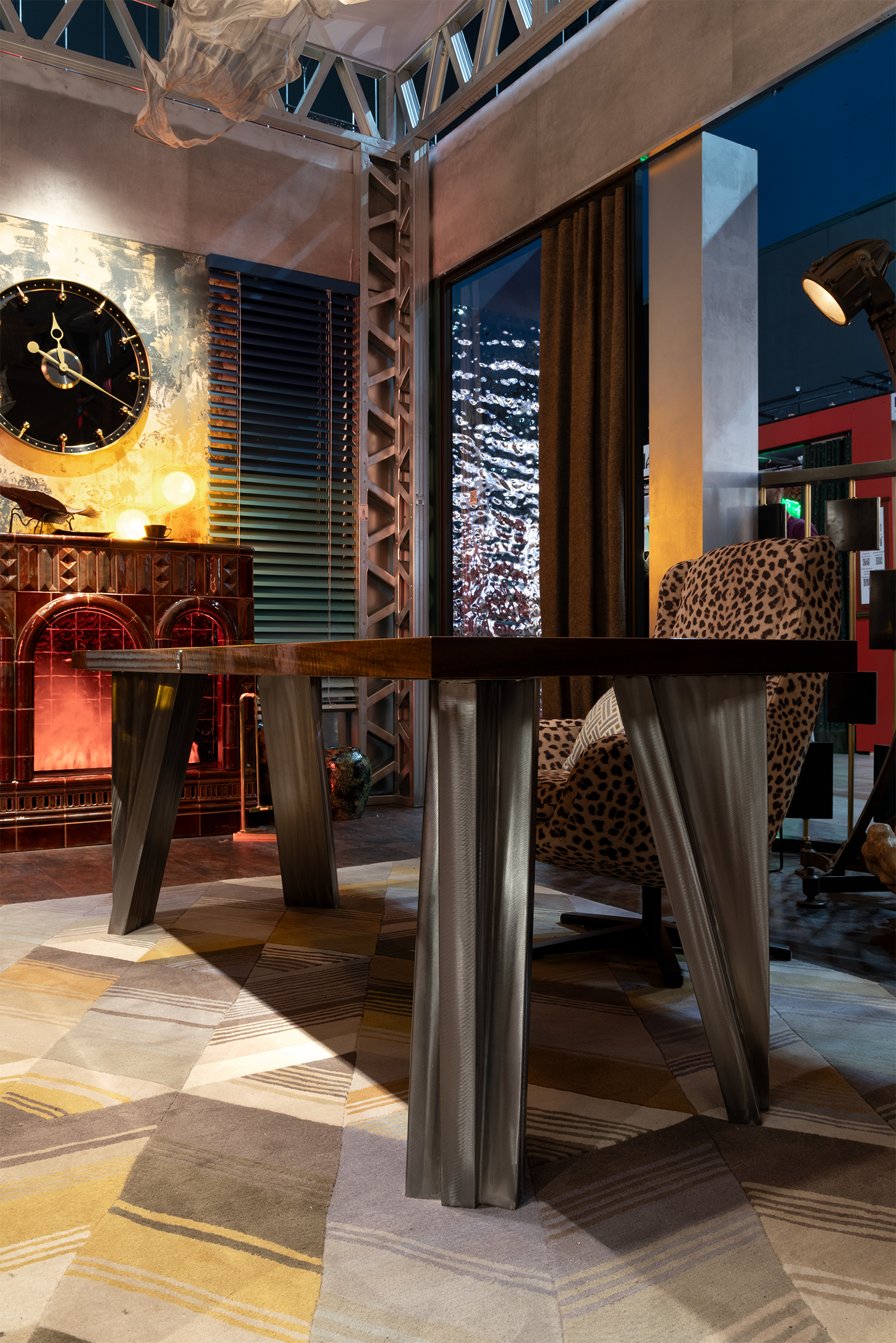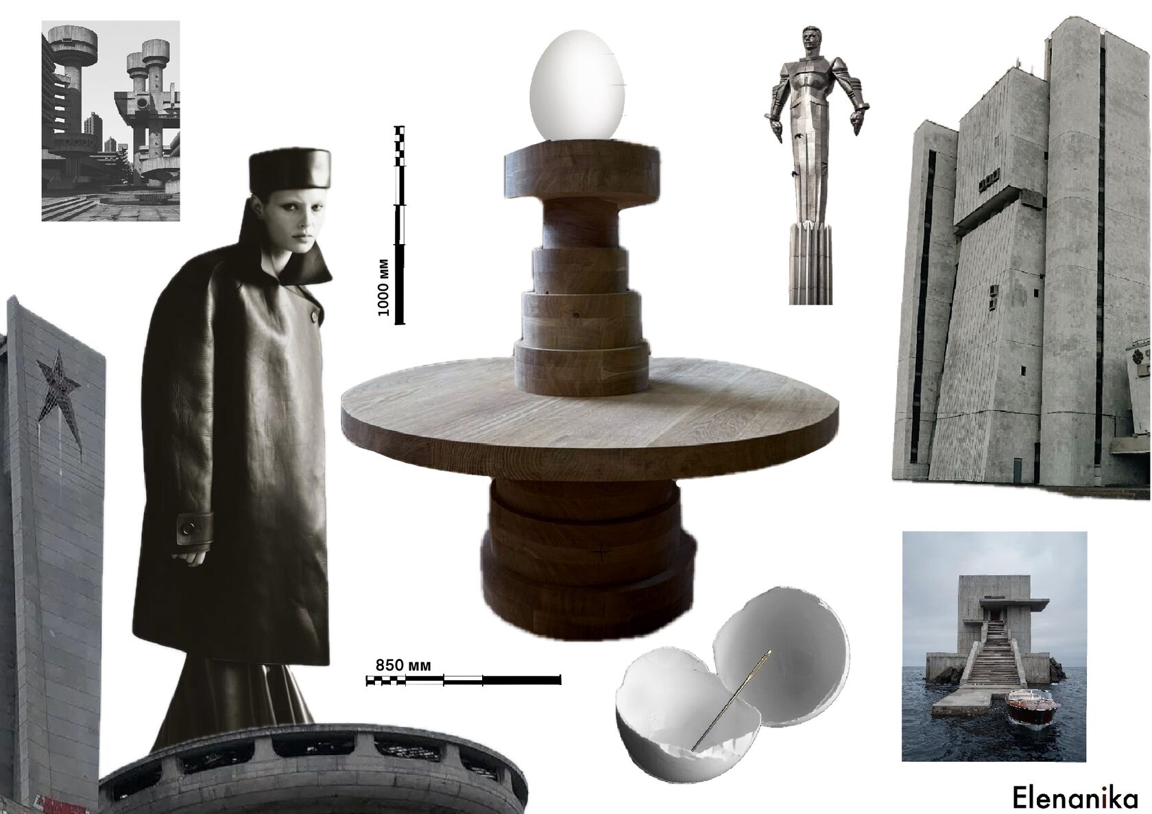 Концепция: В основе концепции лежит переосмысление советского модернизма через призму современного мебельного дизайна. Подстолье стола является прямой отсылкой к архитектурным опорам Дома Авиаторов, символа эпохи. Выбор материалов — сталь для ножек и лакированное дерево для столешницы — подчеркивает индустриальную эстетику и теплоту натуральных текстур. Особое внимание уделено пропорциям: ширина (828 мм) и высота (764 мм) изделия рассчитаны с использованием двойного серебряного и золотого сечений соответственно, что гарантирует визуальную гармонию. Проект реализован компанией FURNITEK, специализирующейся на эксклюзивной мебели ручной работы.