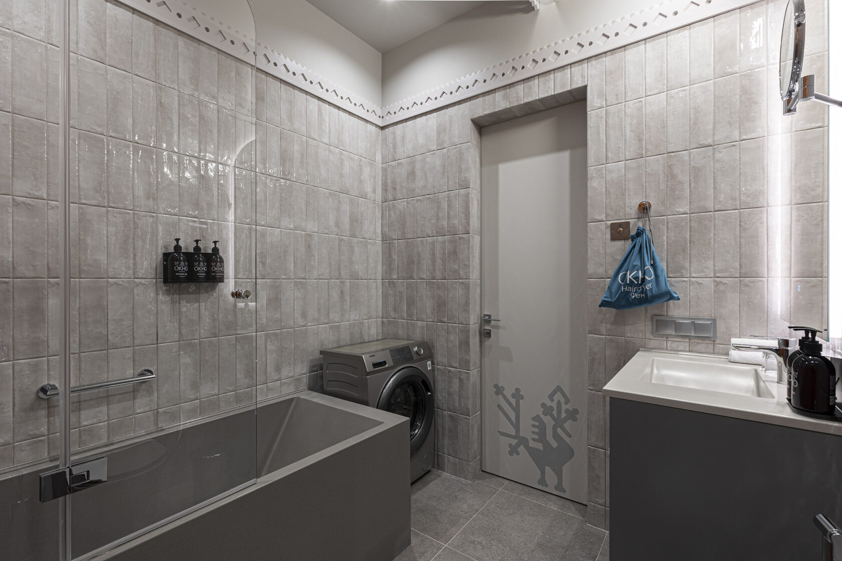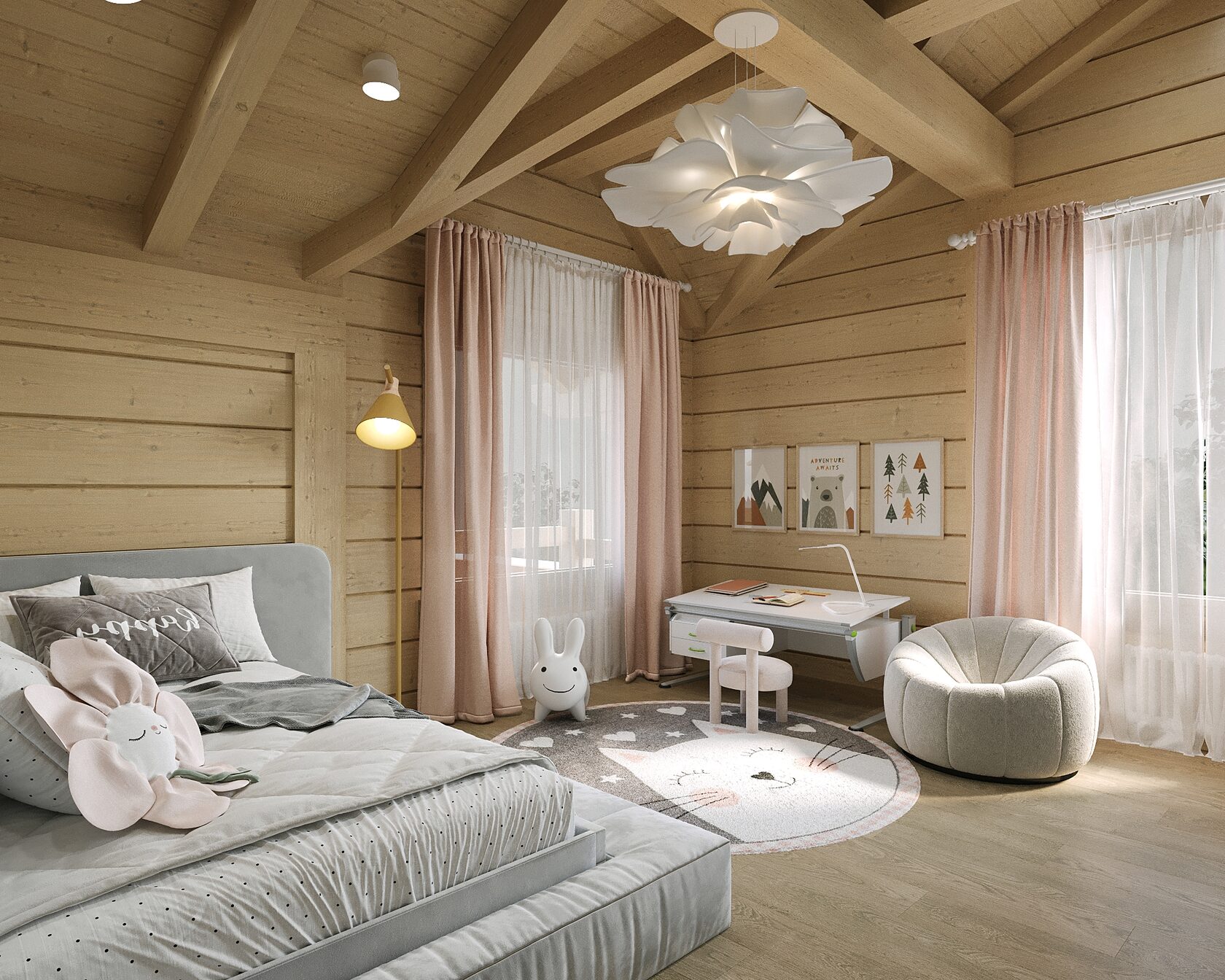 Дом построен из редкого и благородного материала — сосны кело тёмно-серого оттенка, обладающей уникальной текстурой и выразительным природным цветом. Основная задача проекта заключалась в том, чтобы «оживить» монохромный фон интерьера, внести яркость, тепло и национальный колорит, при этом не нарушая природную эстетику и целостность пространства.