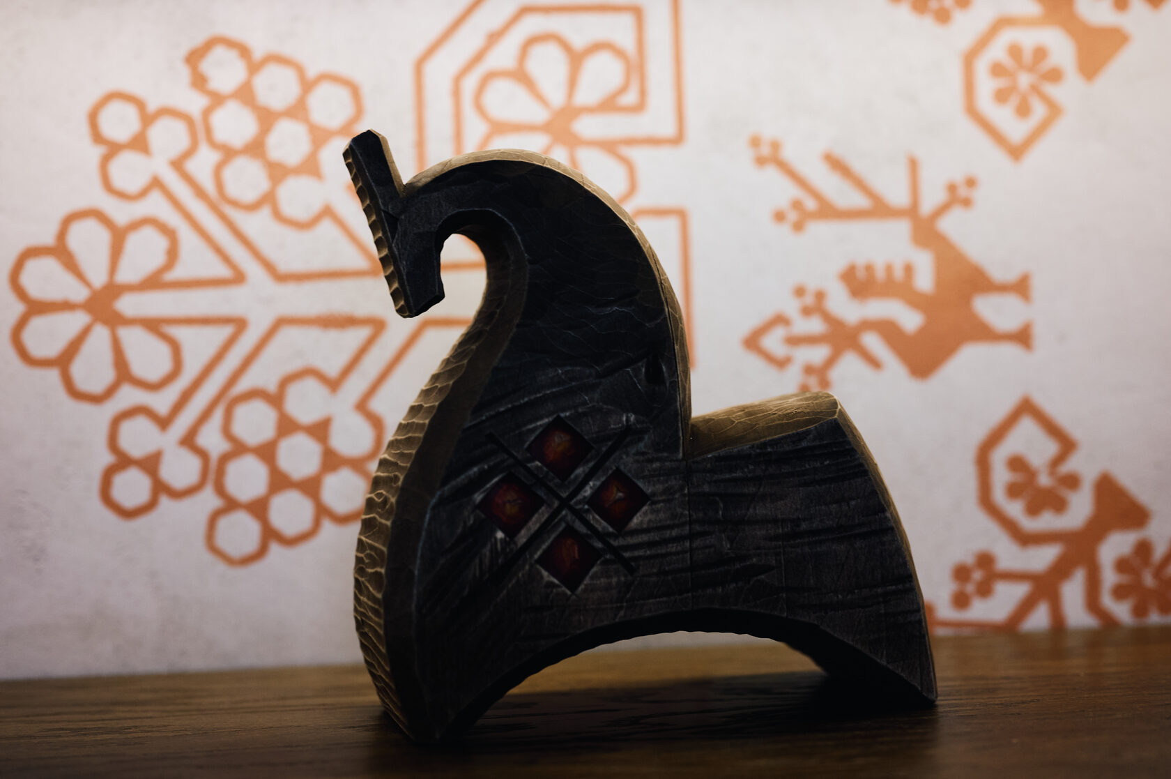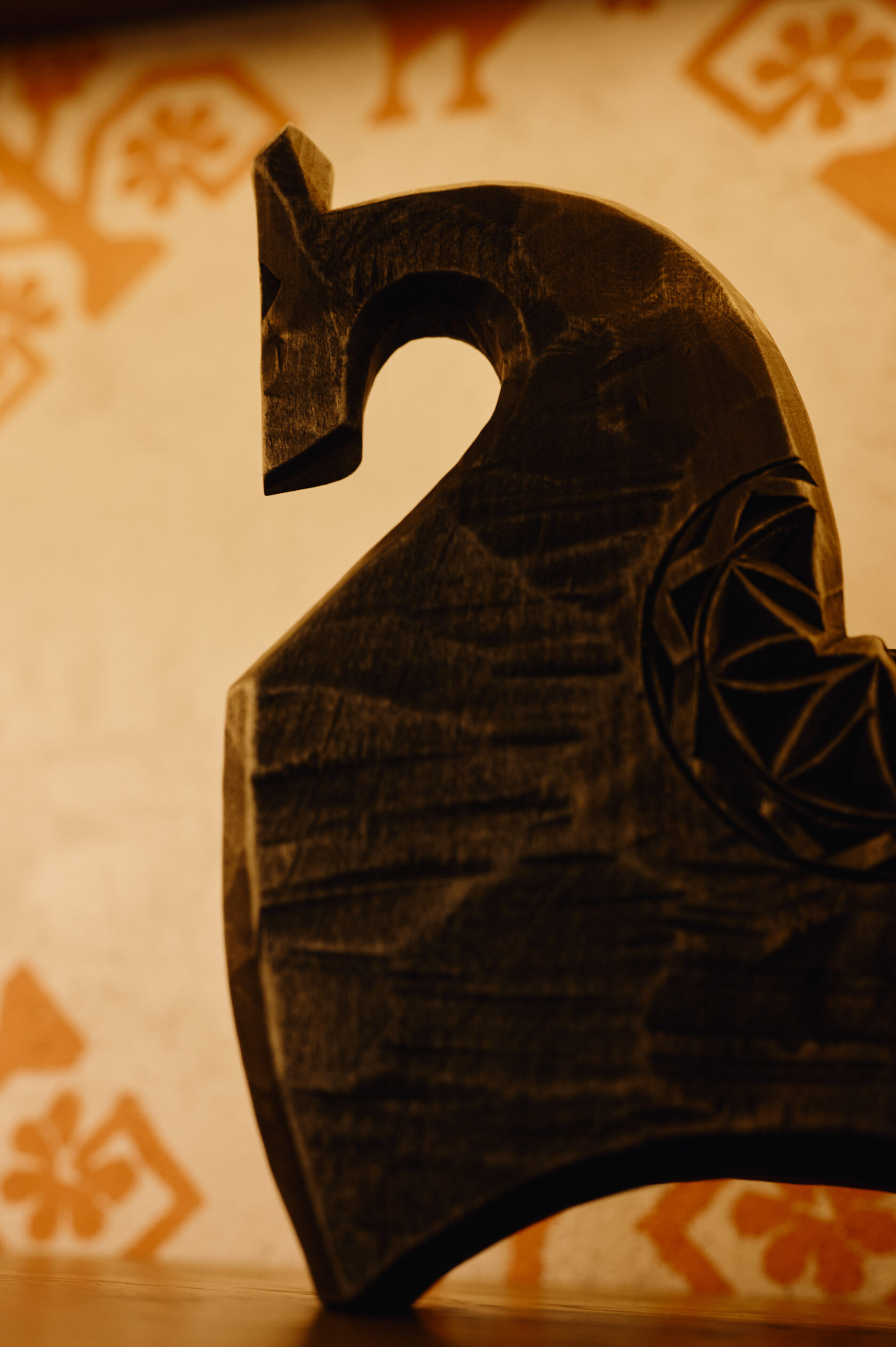 «Конь-Огонь» вобрал в себя дух древних славянских земель. Его массивная форма и резьба вдохновлены деревянным зодчеством Архангельска, где каждый орнамент имеет защитный и сакральный смысл. Грива выполнена в виде части солнечного круга — символа света, тепла и жизни. Ромбы на корпусе отсылают к образу плодородия, дома и семейного очага.