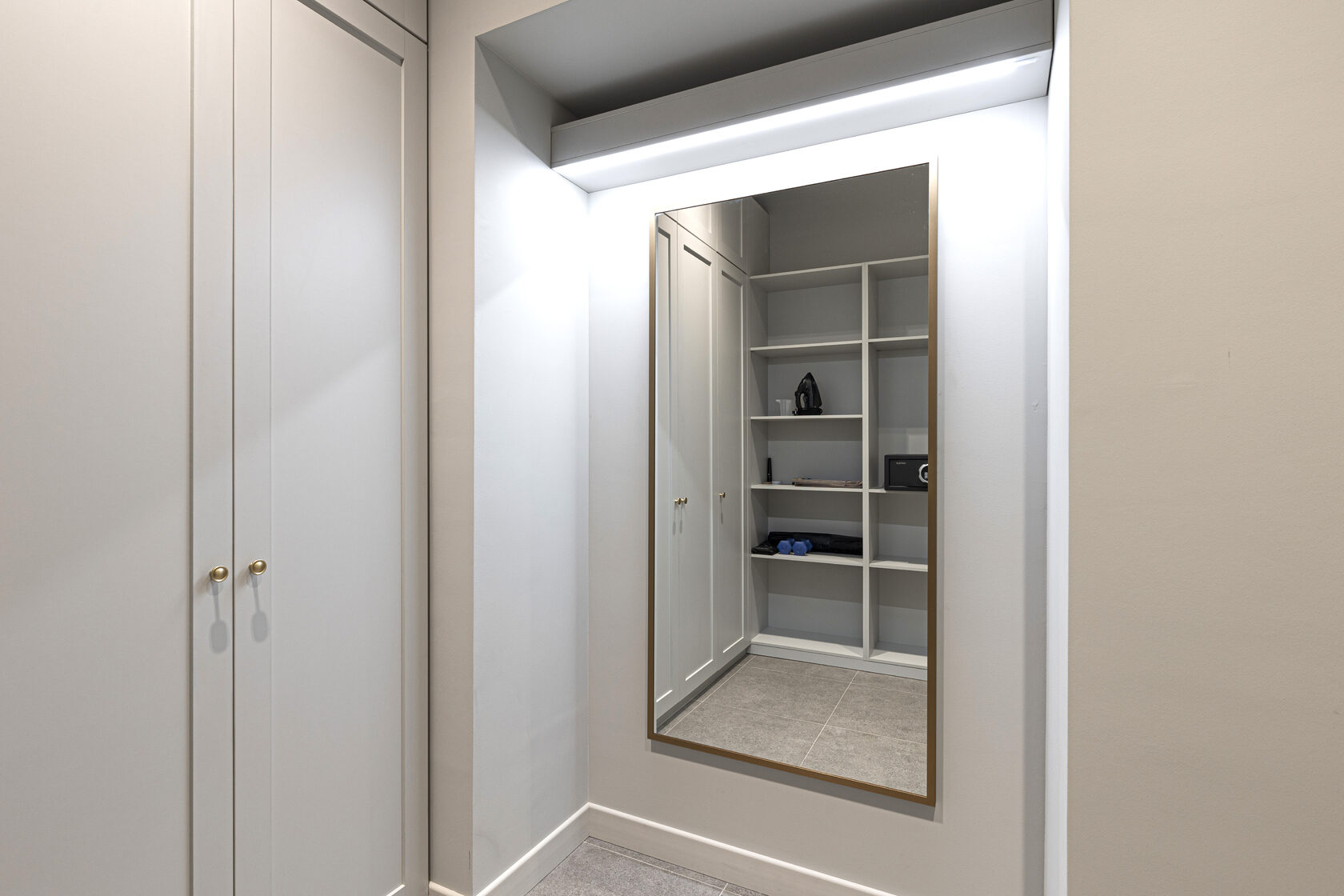 Концепция: Основная идея проекта заключалась в создании многофункционального элемента, который не только служит для хранения коллекций, но и выступает как самостоятельный арт-объект. Дизайнерское решение с использованием зеркал и стекла визуально облегчает массивность конструкции, в то время как надёжность обеспечивается металлическим каркасом. Инженерные аспекты, связанные с креплением конструкции значительного веса, были тщательно проработаны.