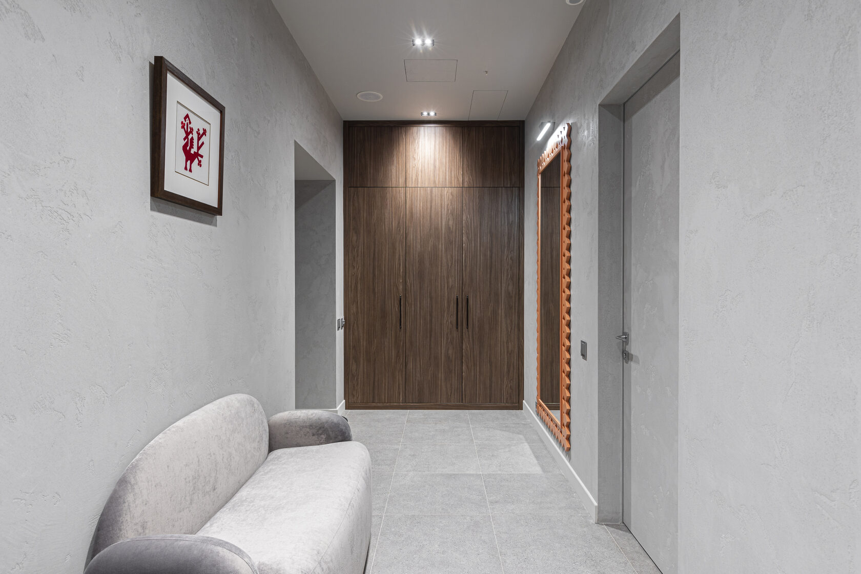 Концепция: Основная идея — создание гармоничного пространства, где высокотехнологичный алюминий и стекло встречаются с теплотой и тактильностью натурального войлока. Использование войлока толщиной 2 мм не только обеспечивает великолепные акустические свойства, но и привносит в интерьер богатую фактуру и ноту исконной русской культуры, сохраняя при этом современный и функциональный дизайн. Авторская методика крепления гарантирует долговечность и эстетику.
