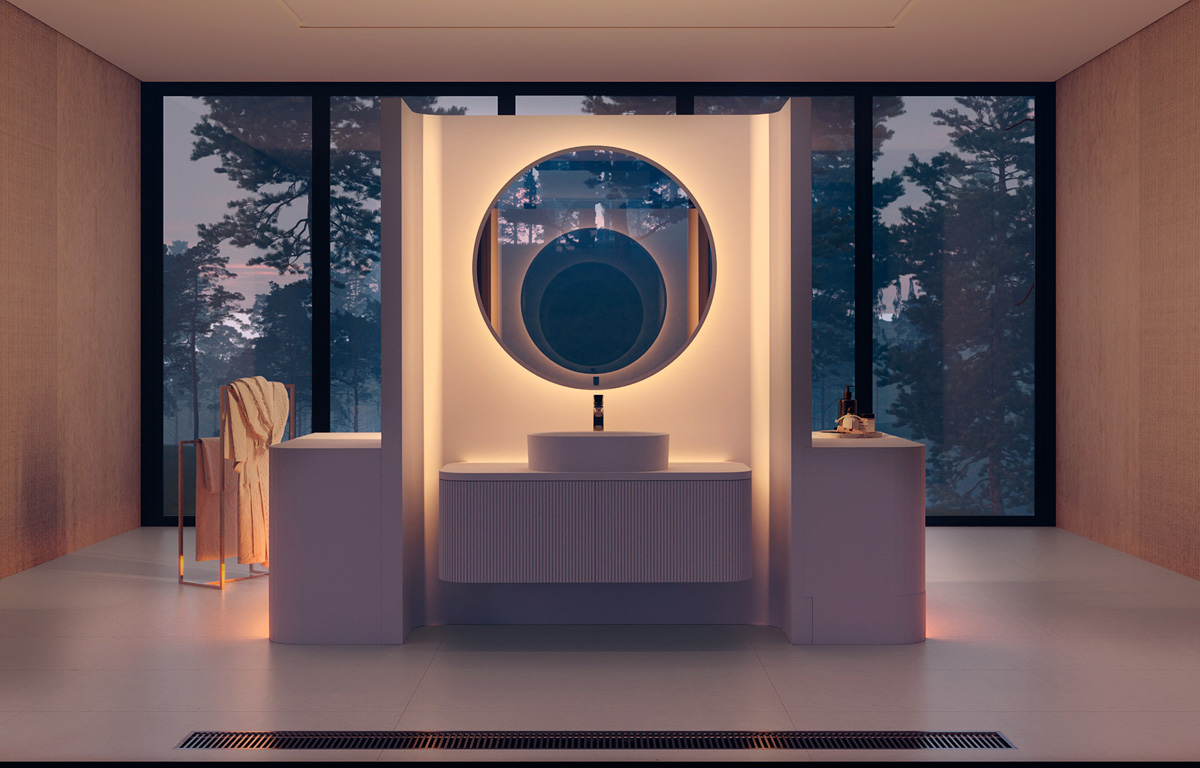 Искупайся в лучах закатного солнца Модульная система для ванной комнаты, созданная для бренда KUPALA, передаёт ощущение тёплого летнего заката — момента, когда солнце медленно погружается за горизонт, наполняя пространство мягким золотым светом. По старинным поверьям, именно в эти минуты, в день Ивана Купала, нужно успеть искупаться в лучах солнца, чтобы обрести обновление и силу. Мы упомянули этот мотив едва заметно, без прямых фольклорных отсылок, превращая его в тонкий художественный намёк. Атмосфера заката выражена в пластике плавных линий, в мягкой световой палитре и в особой игре подсветки, которая словно обнимает объект.