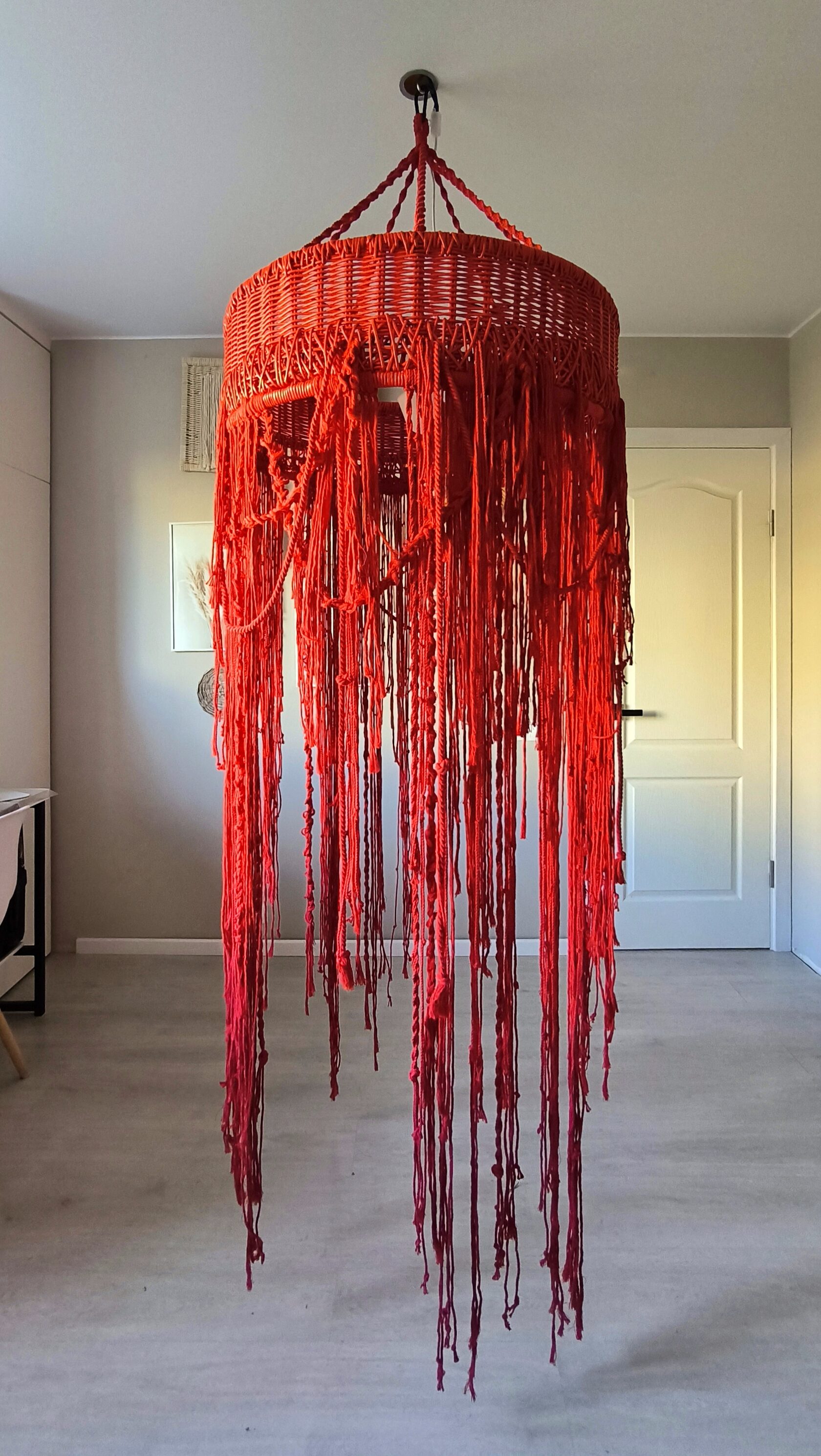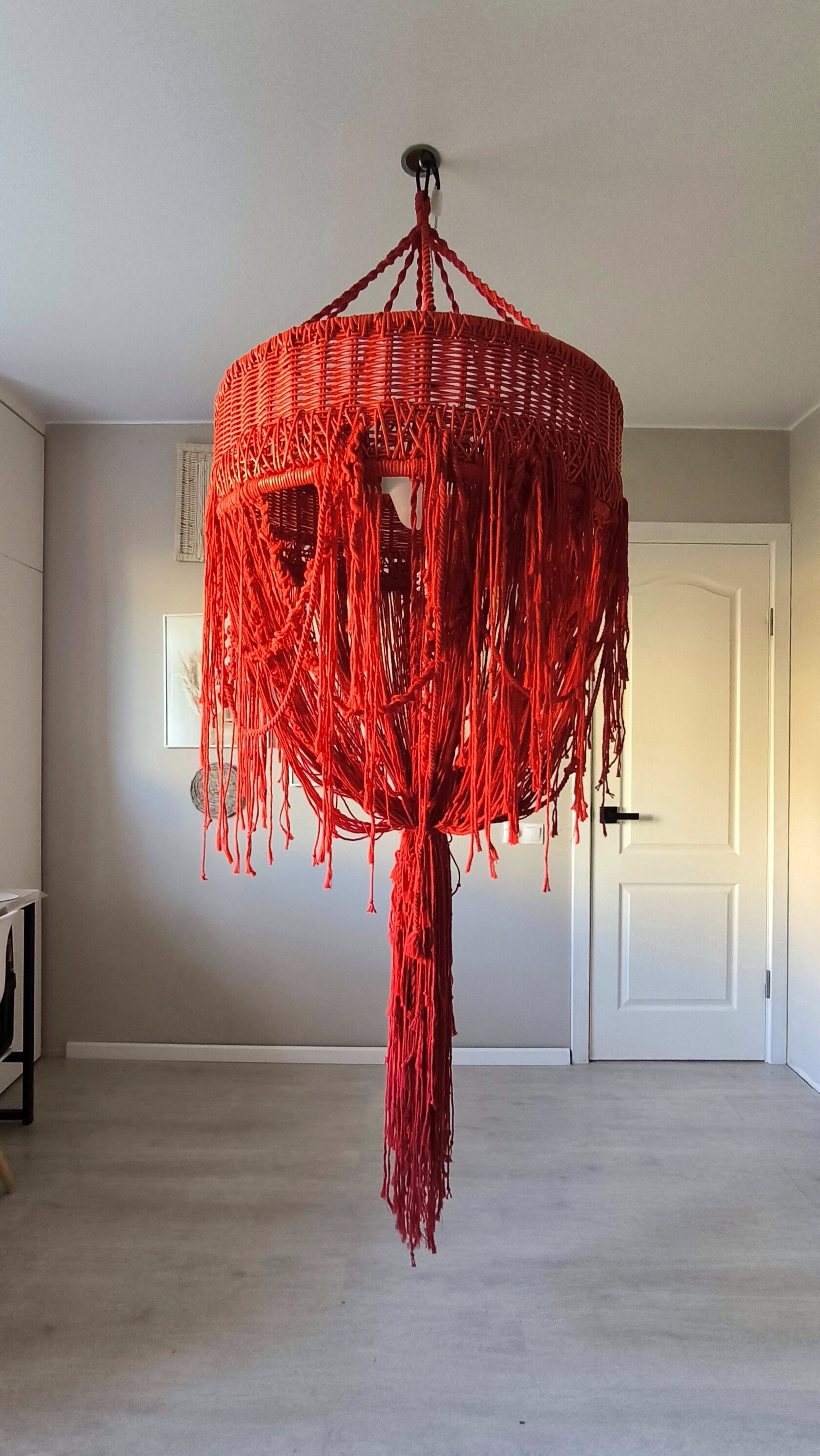 Итог: Абажур «Очаг» можно использовать в двух вариантах: собранном и распущенном виде. Размеры: диаметр 80 см, высота 240 см, вес 6,5 кг. Материалы: влагостойкая имитация лозы, металлический каркас, хлопковые верёвки и шпагат. Этот предмет становится уникальным элементом интерьера, объединяющим функциональность и эмоциональное наполнение.