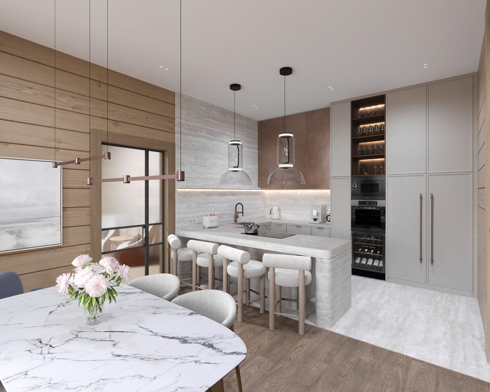 Итог: В результате был реализован подвесной бар, который стал не просто местом для хранения напитков, а центральным, выразительным элементом интерьера. Он подчёркивает индивидуальность пространства и его масштаб, гармонично сочетая в себе функциональность, эстетику и надёжность.