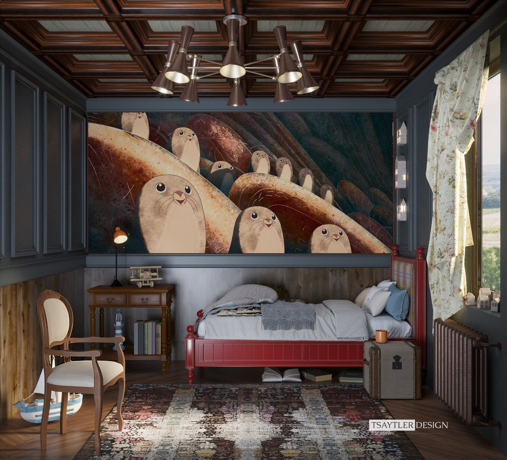 Детская комната, для фаната прекрасного художественного мультфильма "Песнь Моря" . Завораживающие и трогательные мотивы сказки о невероятных существах и приключениях отображены в панно на стене и атмосфере комнаты.
