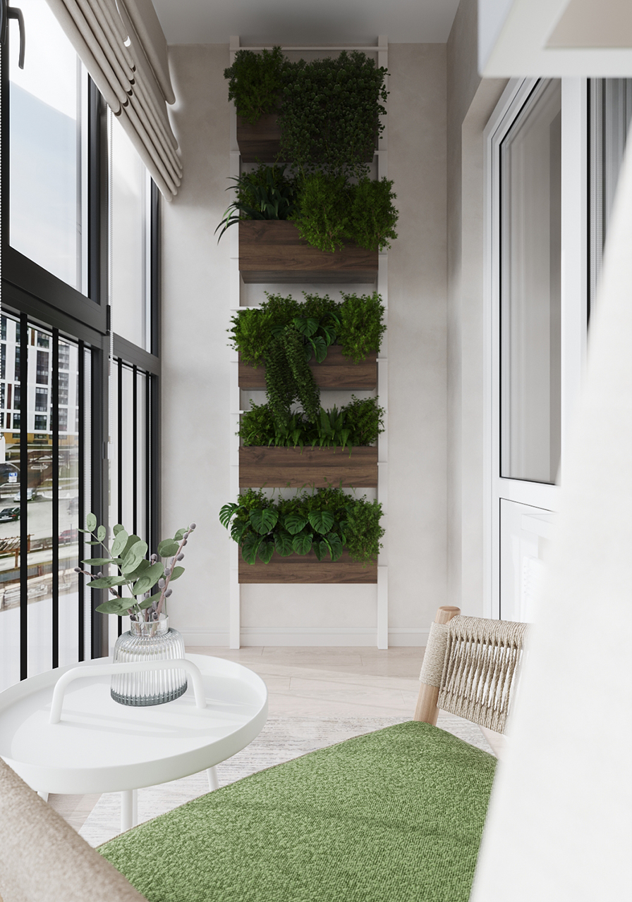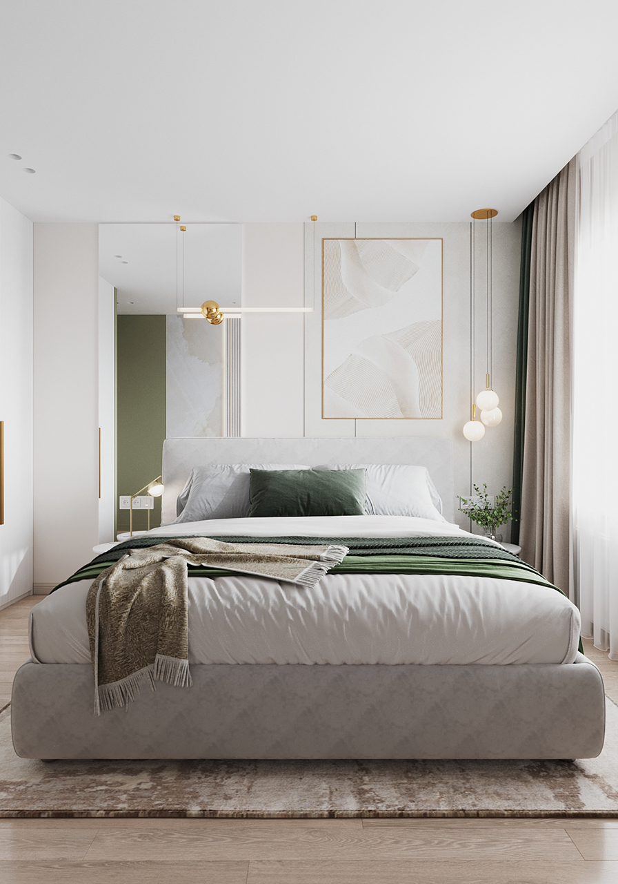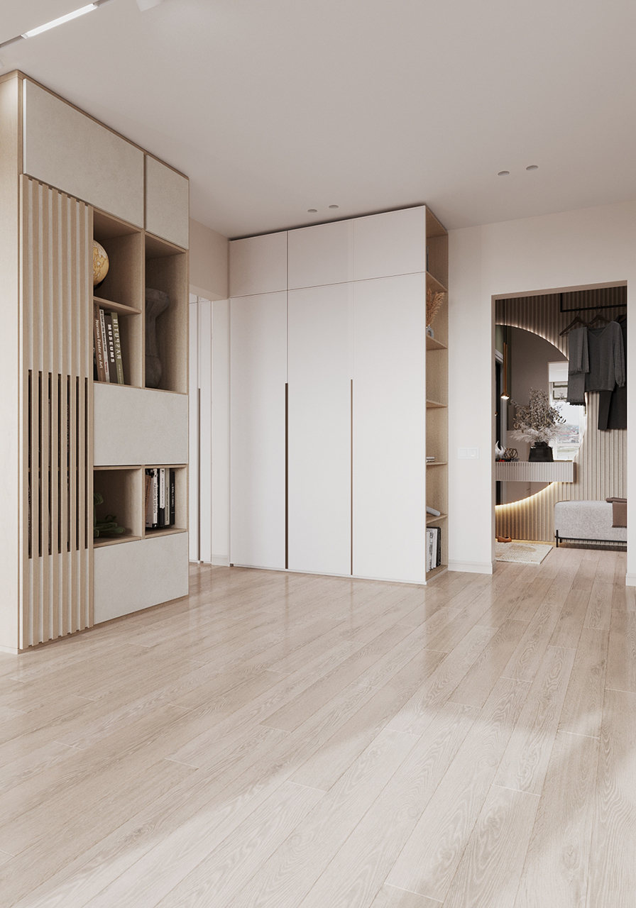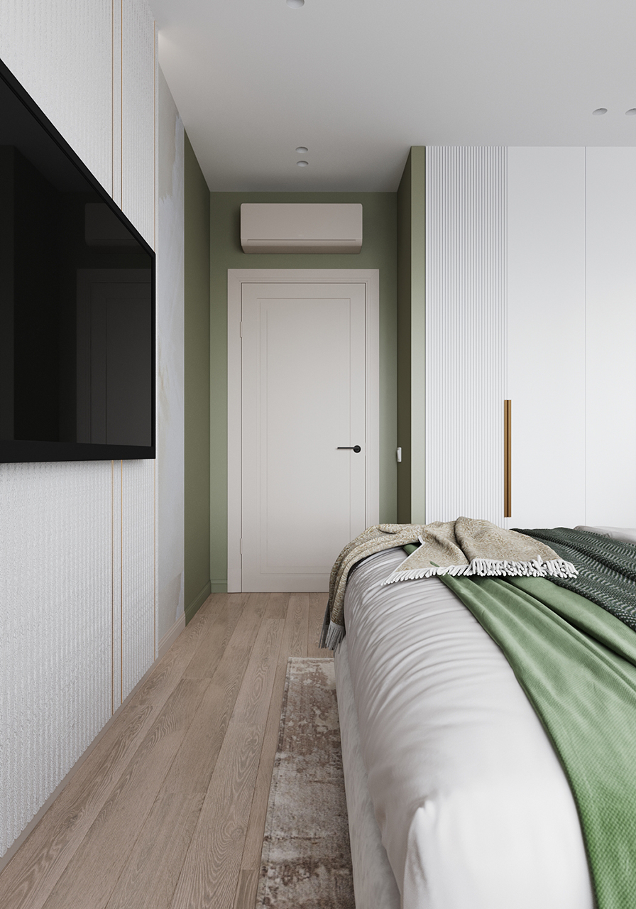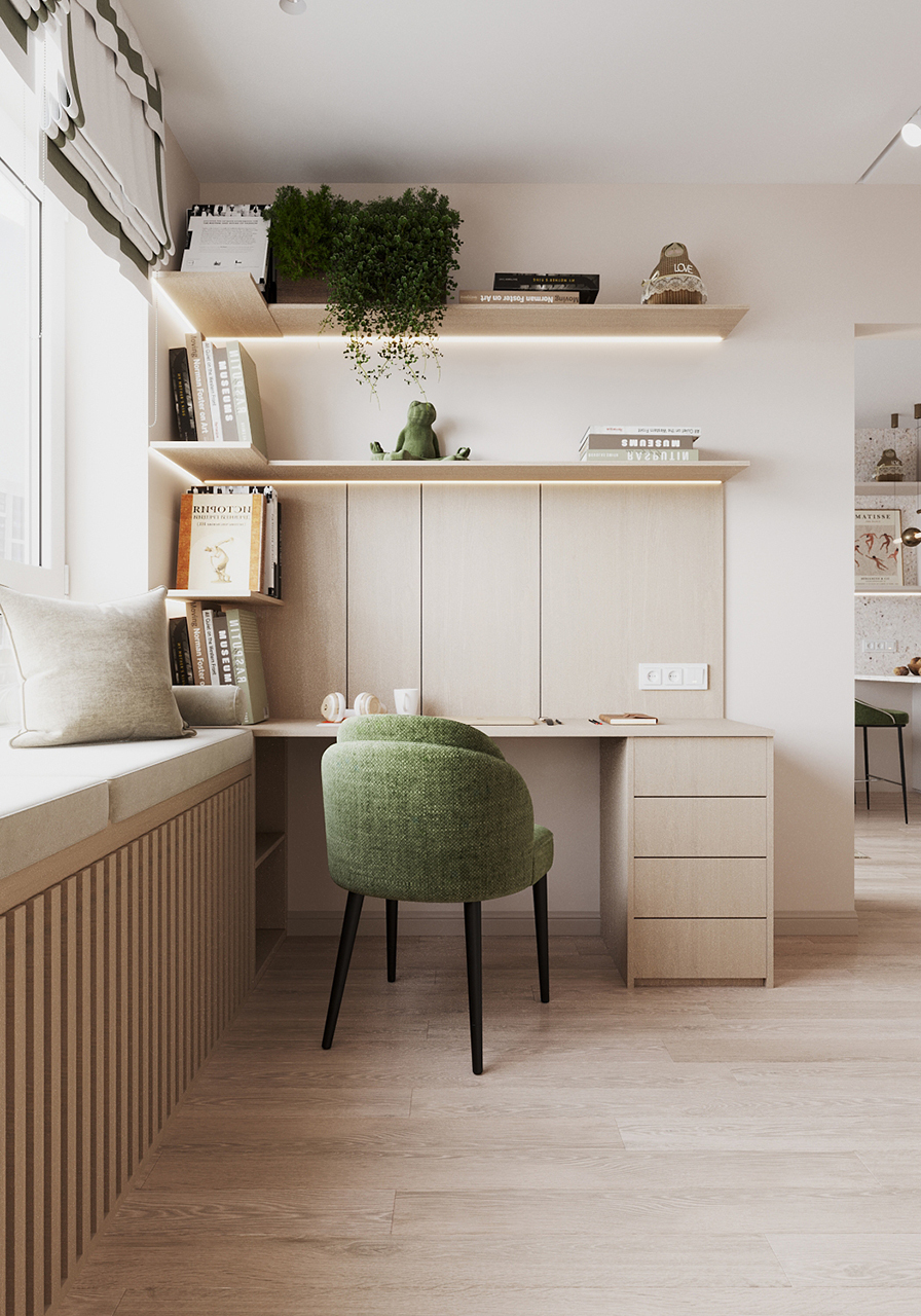Концепция: Основная идея проекта — создание гармоничного и функционального пространства, полностью отвечающего потребностям и страстям владелицы. Дизайн строится на элегантном сочетании спокойных, приглушенных тонов, дополненных выразительными зелеными акцентами, что придает интерьеру свежесть и утонченность, одновременно поддерживая атмосферу спокойствия и сосредоточенности.
