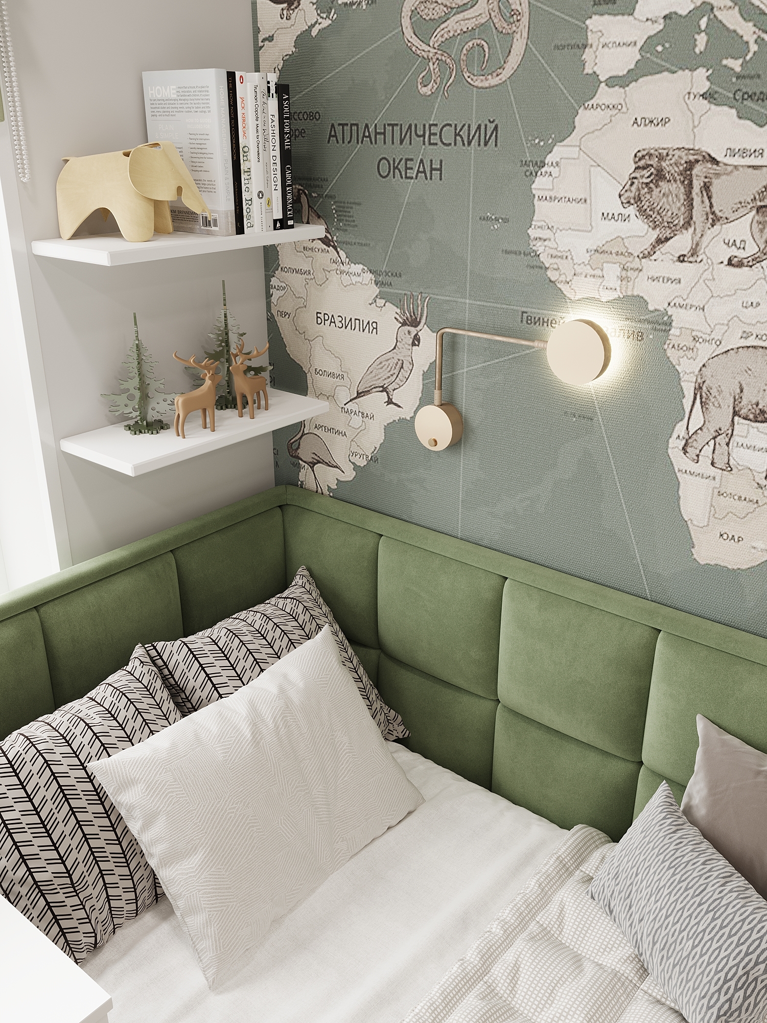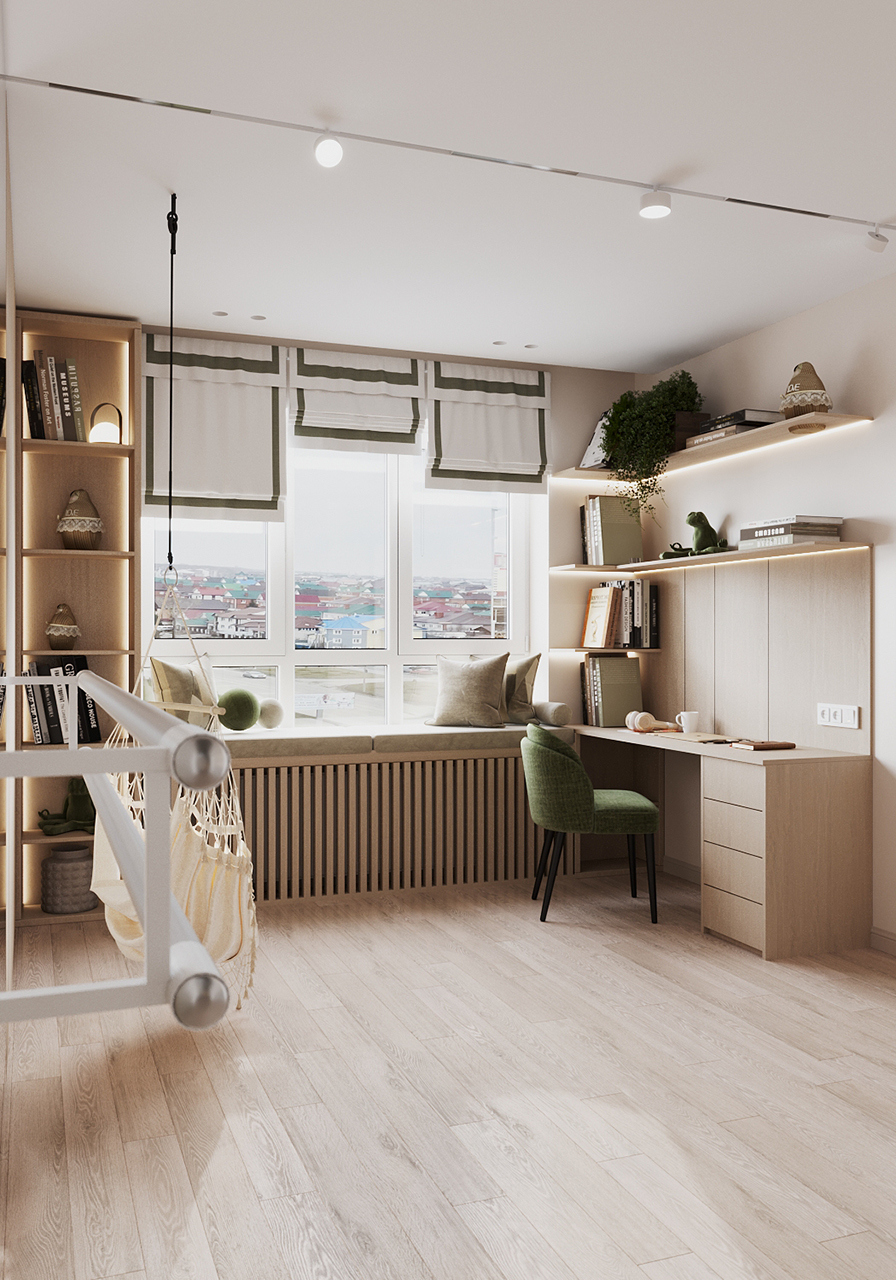 Отдельная комната для няни выполнена в теплых песочных тонах с успокаивающими зелеными и розовыми акцентами, создающими комфортную атмосферу для отдыха. В будущем это помещение может быть преобразовано в гостевую комнату или гардеробную.