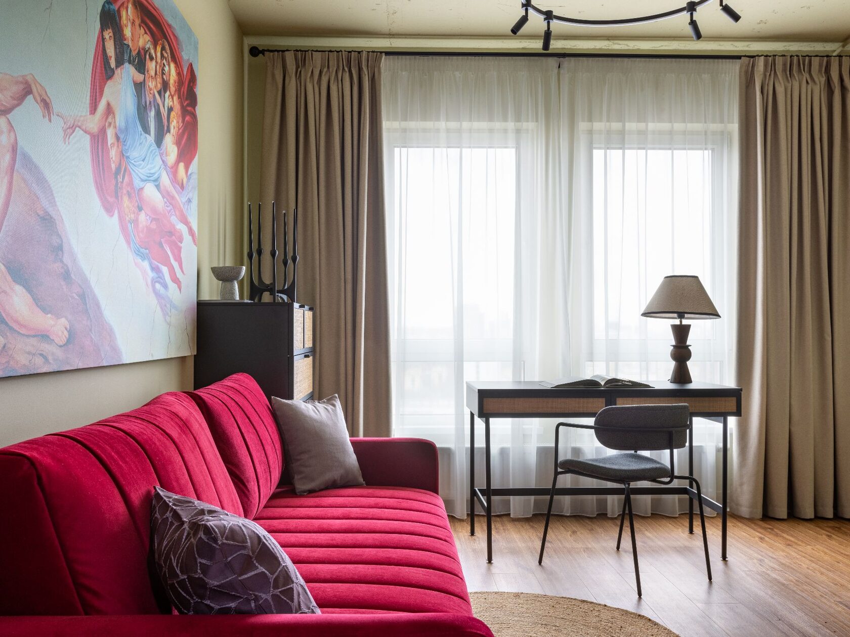 Концепция: Ключевой подход заключался в отказе от избыточных декоративных элементов в пользу чистых поверхностей, отделанных высококачественной покраской и декоративной штукатуркой. Чтобы избежать монотонности и придать стенам «голос», были искусно введены акцентные зоны. Это достигалось за счет смелых вкраплений сложных красно-бордовых оттенков, применения теневых профилей, создания рельефных поверхностей с помощью панелей и стратегического размещения зеркал. Такой ансамбль приемов не только обогащает визуальное восприятие, но и придает интерьеру особую тактильную и объемную выразительность.