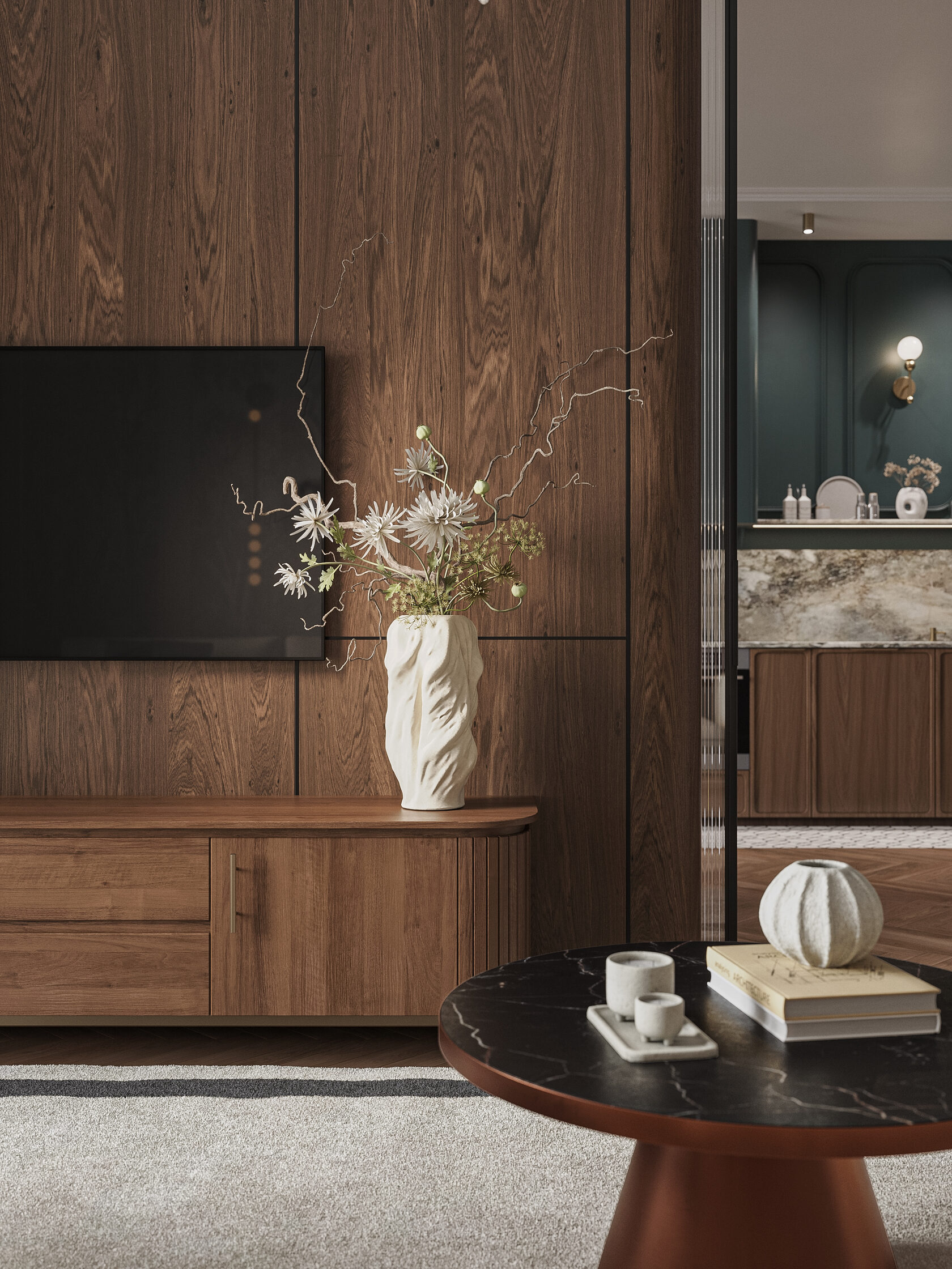 Особенности дизайна Пространство и свет: Стеклянная перегородка между кухней-гостиной и спальней делает интерьер воздушным, а панорамные окна наполняют его естественным светом. Элегантные текстуры и цвет: Сочетание насыщенной палитры, роскошных материалов и тактильных рифленых фасадов создаёт изысканный образ интерьера. Индивидуальные акценты: Растительное панно в спальне и уникальное керамогранитное панно в ванной комнате придают интерьеру выразительность. Функциональность: Компактная прихожая, вместительная гардеробная и удобное зонирование делают пространство практичным и комфортным.