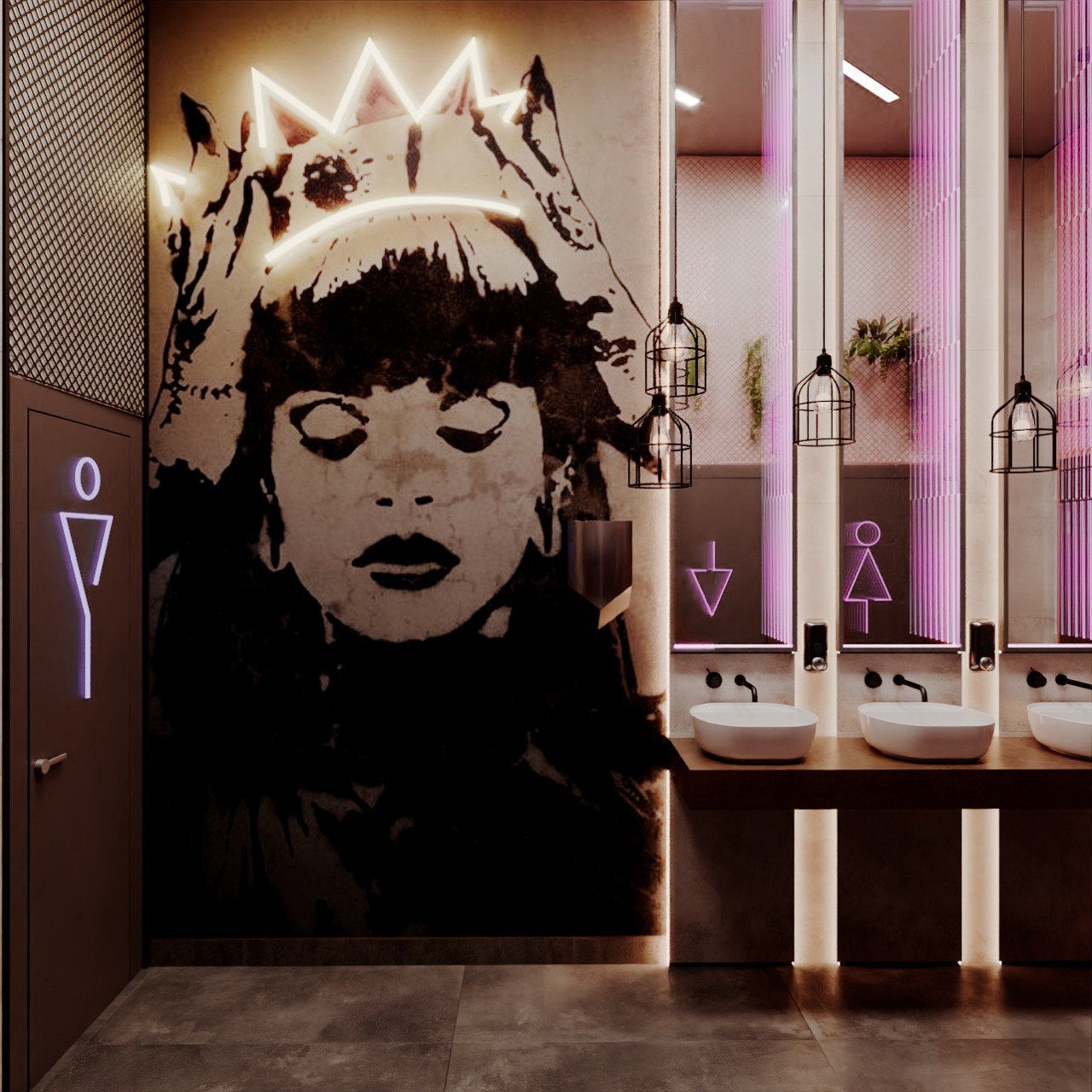 Проект трансформирует стандартное помещение санузла в уникальное пространство, призывающее к активному взаимодействию. Основная цель — создать интерьер, где каждый элемент становится фоном для незабываемых фотографий и отметок геолокации. Особое внимание уделено решению проблемы проходного помещения, разделяющего мужскую и женскую зоны: разработаны яркие, мгновенно считываемые индикаторы, обеспечивающие безупречную навигацию.