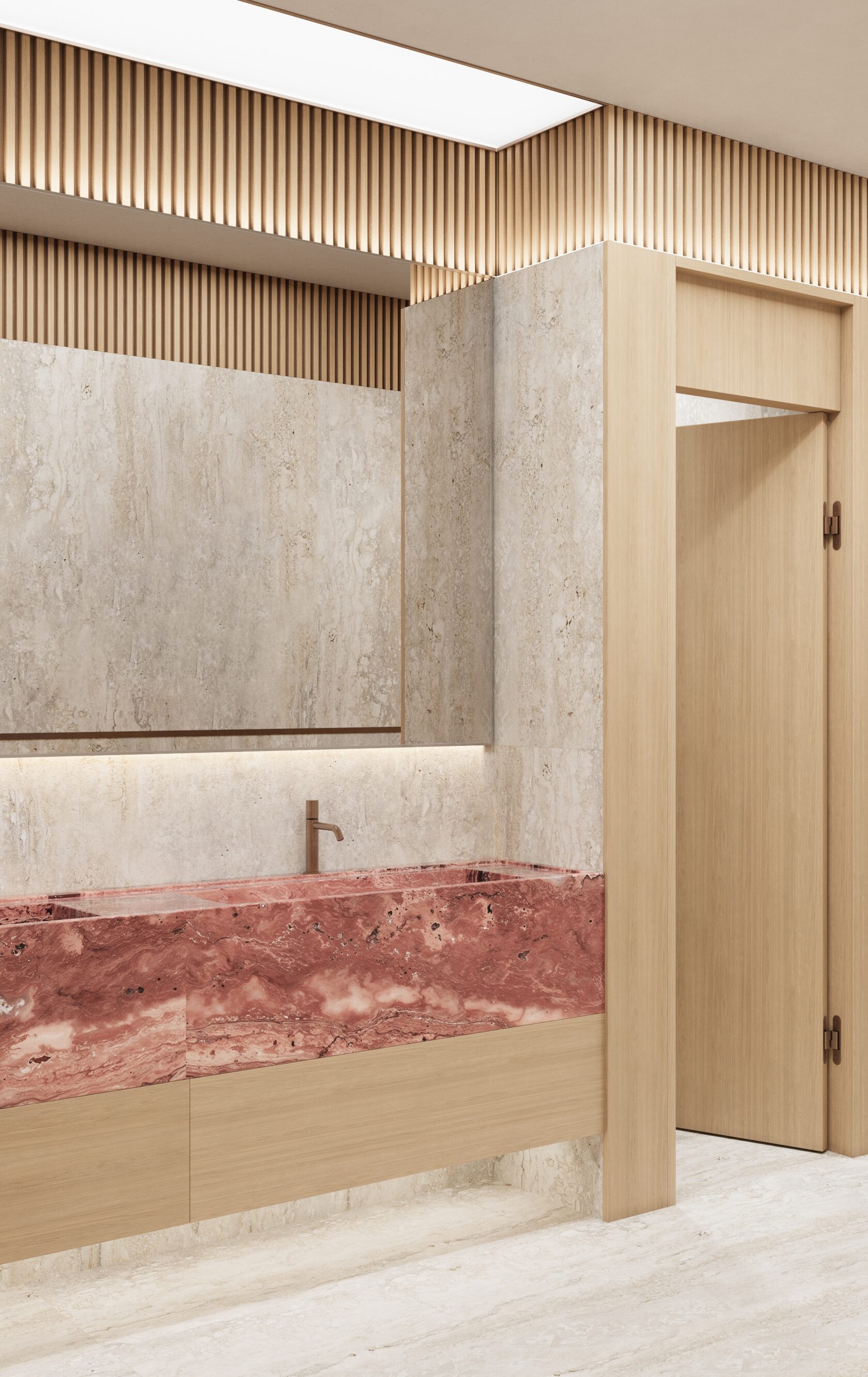 Концепция: В основе концепции лежит идея превращения утилитарной зоны в эмоциональный и визуальный центр. Дизайн ориентирован на создание впечатлений, где функциональность гармонично переплетается с высокой эстетикой. Принцип 'каждая деталь — фотозона' дополняется инновационными решениями в навигации, что делает пространство не только красивым, но и идеально понятным для каждого посетителя.