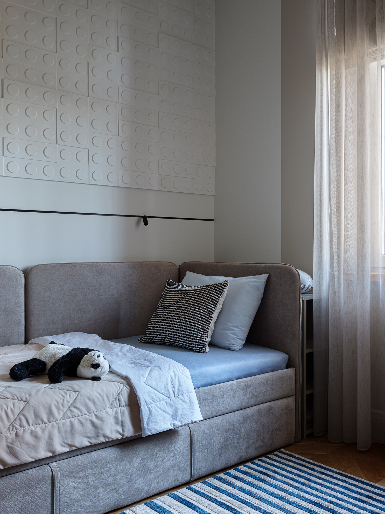 Концепция: Ключевой идеей проекта стало превращение стен в центральный элемент интерьера, способный задавать настроение и транслировать характер. Примененные техники, такие как динамичные Lego-панели в детской, смелые колор-блоки, изысканное оформление изголовья в спальне и художественная роспись в прихожей, возвели стены в ранг арт-объектов. Эта философия, названная автором 'шедеврированием стен', позволяет каждой поверхности 'ожить' и рассказать свою неповторимую историю, создавая диалог с обитателями.