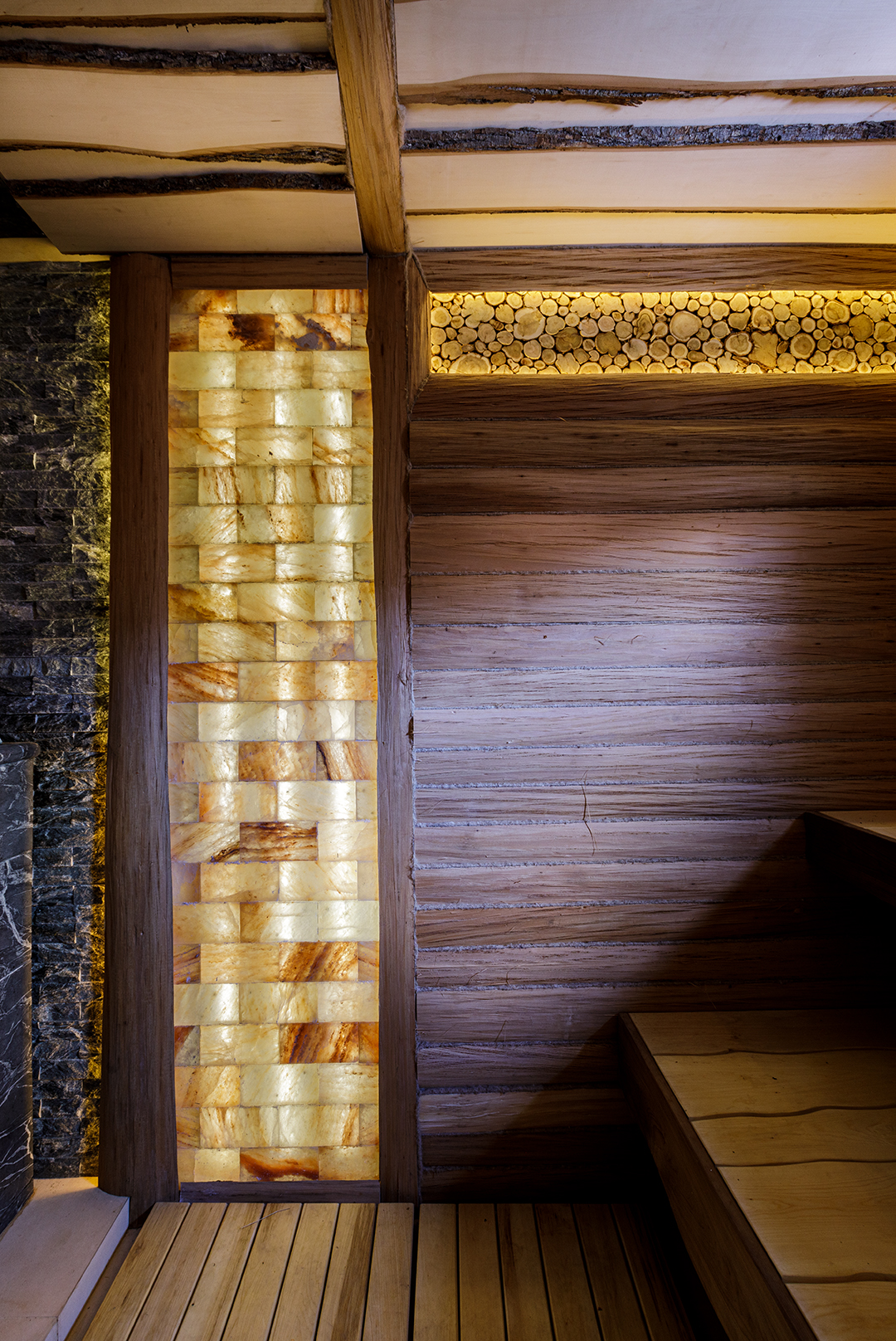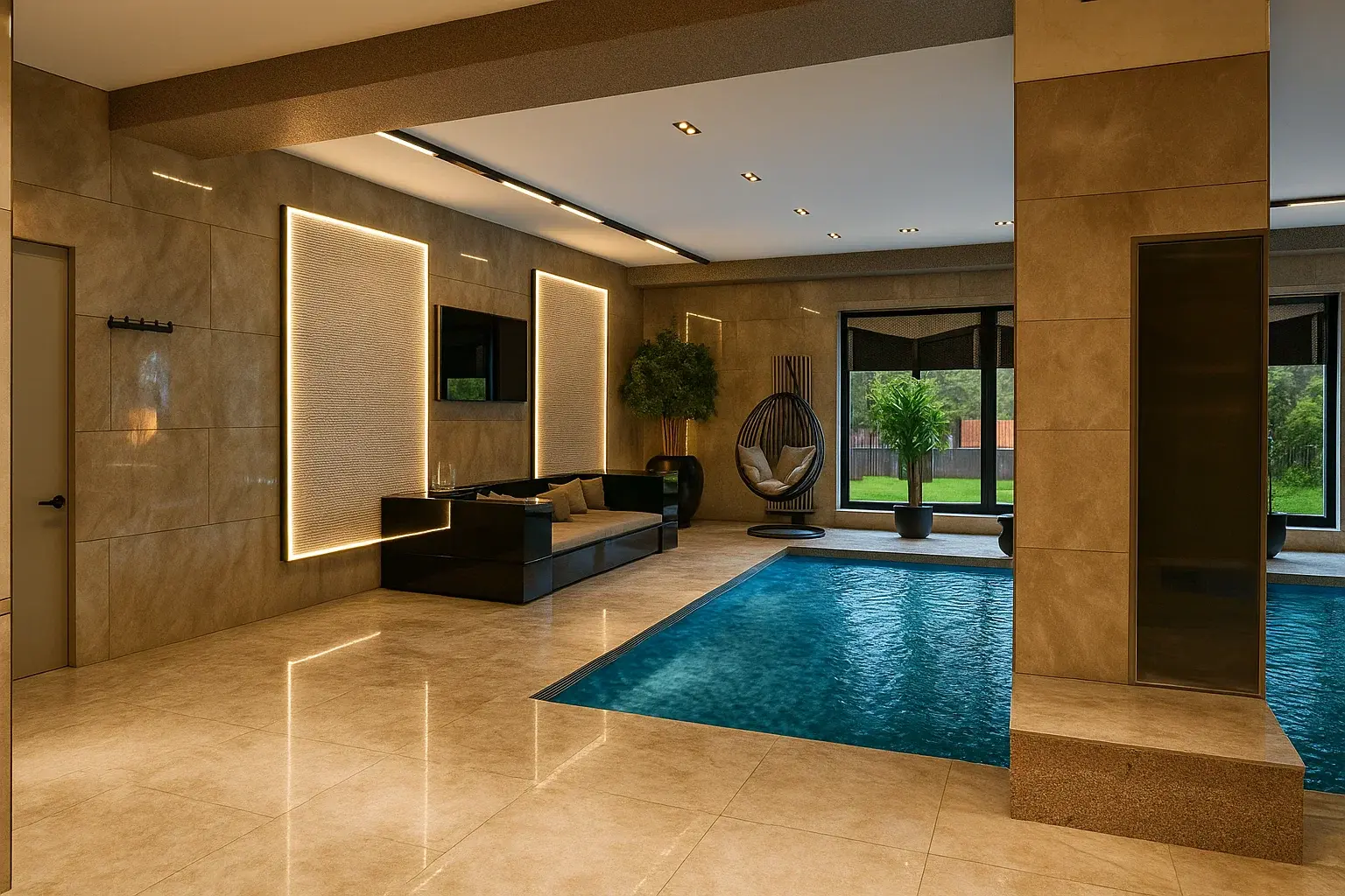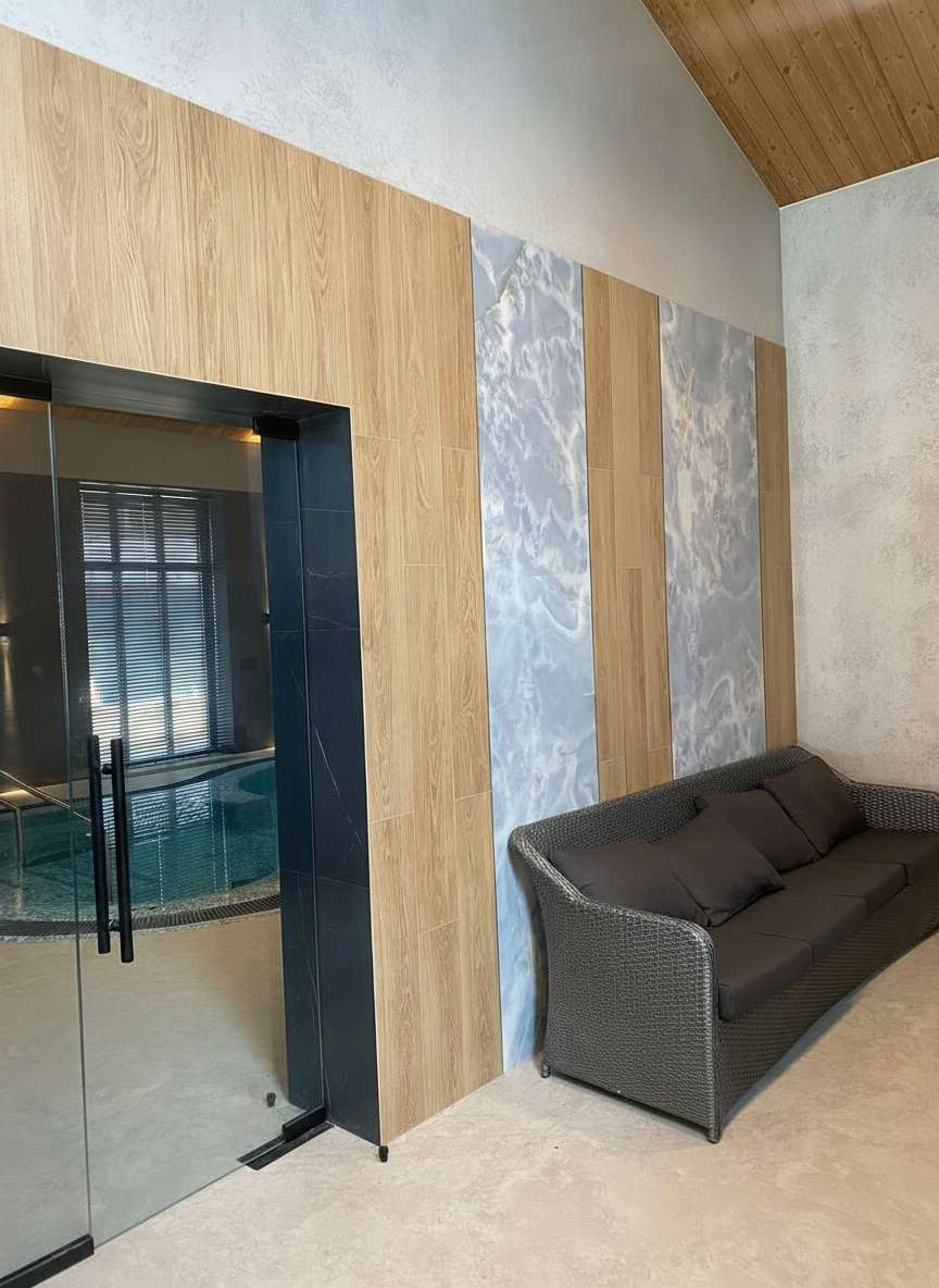 1. Видовая точка: Оникс как сердце композиции Центром притяжения и главным арт-объектом зоны бассейна стала монументальная стена, облицованная крупноформатной керамикой с рисунком под оникс. Мы сознательно выбрали этот материал за его визуальную мощь и игру света. Полупрозрачные прожилки и мерцающие переливы камня оживают в отражении водной глади, создавая эффект бесконечного пространства и сияющего простора. Это не просто стена, это живая картина, которая меняется в зависимости от времени дня и характера освещения, придавая интерьеру драматизм и благородство.