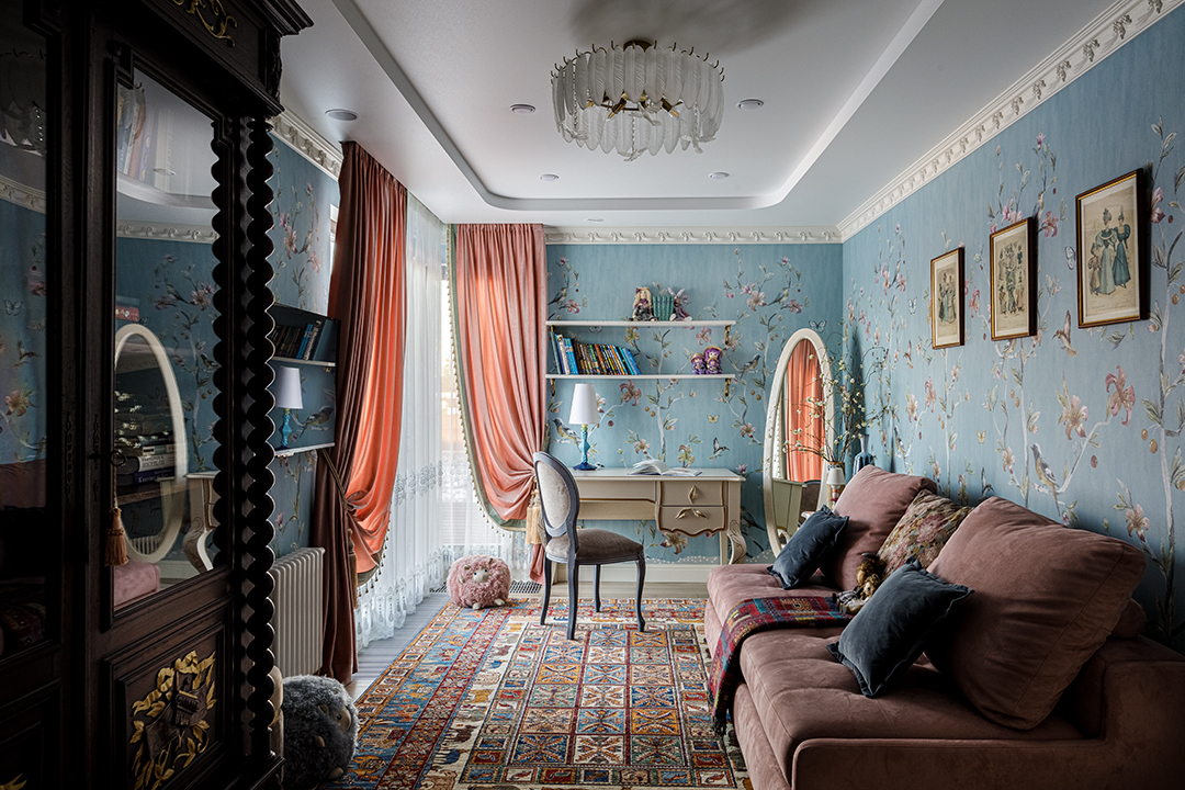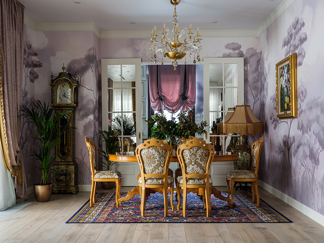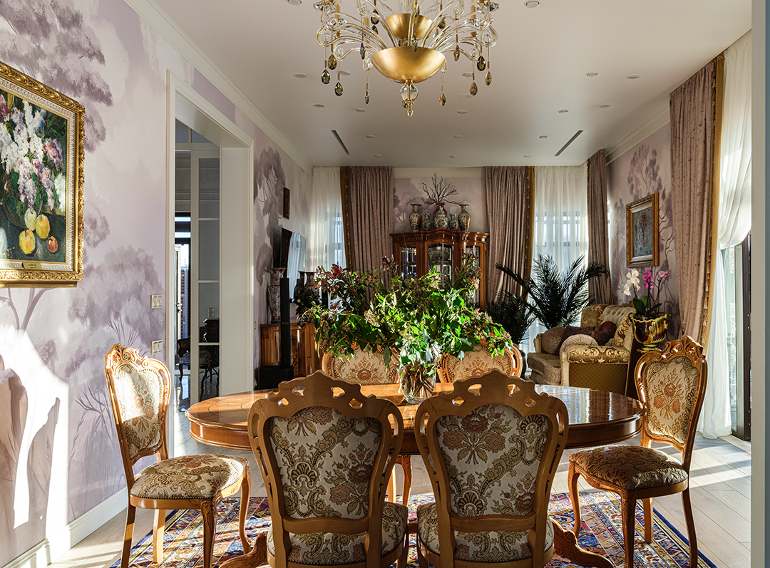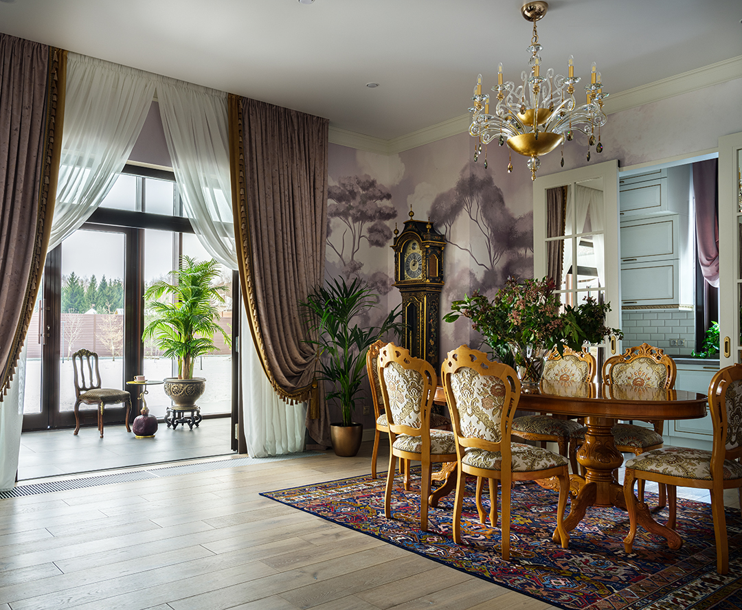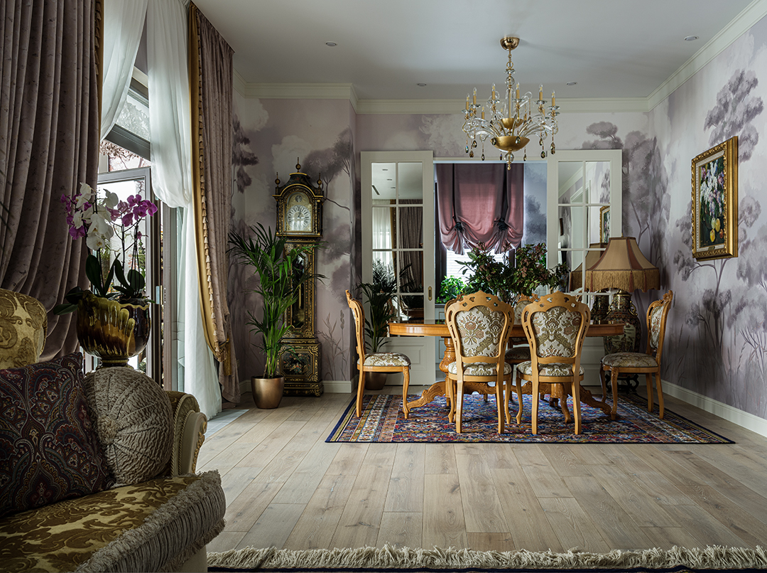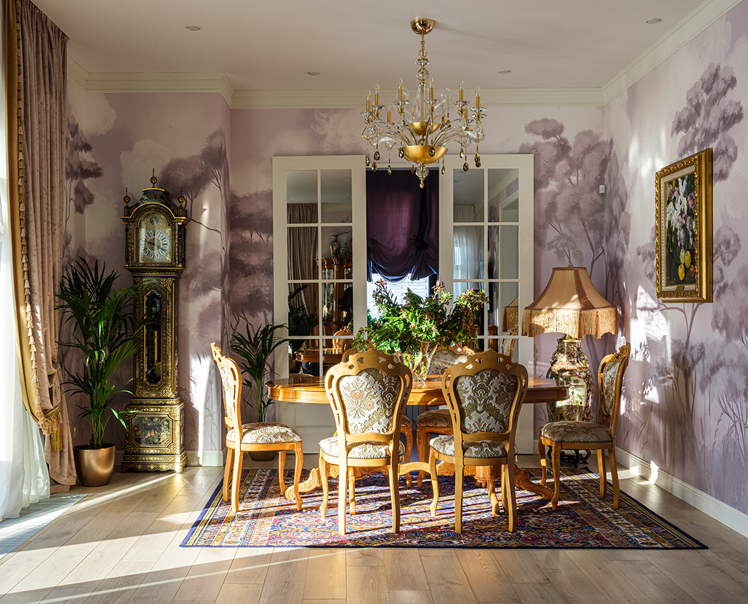 Проект преображения уже построенного загородного дома площадью 425 кв. м, начавшийся с решения проблемы неудобной входной зоны. Столкнувшись с готовыми коммуникациями и изменившимся стилевым направлением заказчиков, от дизайнера потребовались точные и креативные решения. Основной задачей стало создание гармоничного интерьера, объединяющего элементы классики, винтажа и шинуазри, при этом максимально сохраняя существующую структуру. Высота потолков варьируется от 2.5 до 3.4 метров, добавляя пространству объем и уникальность.
