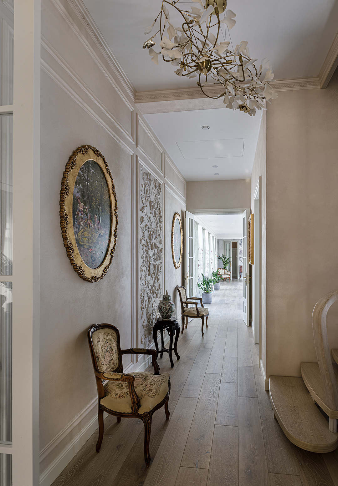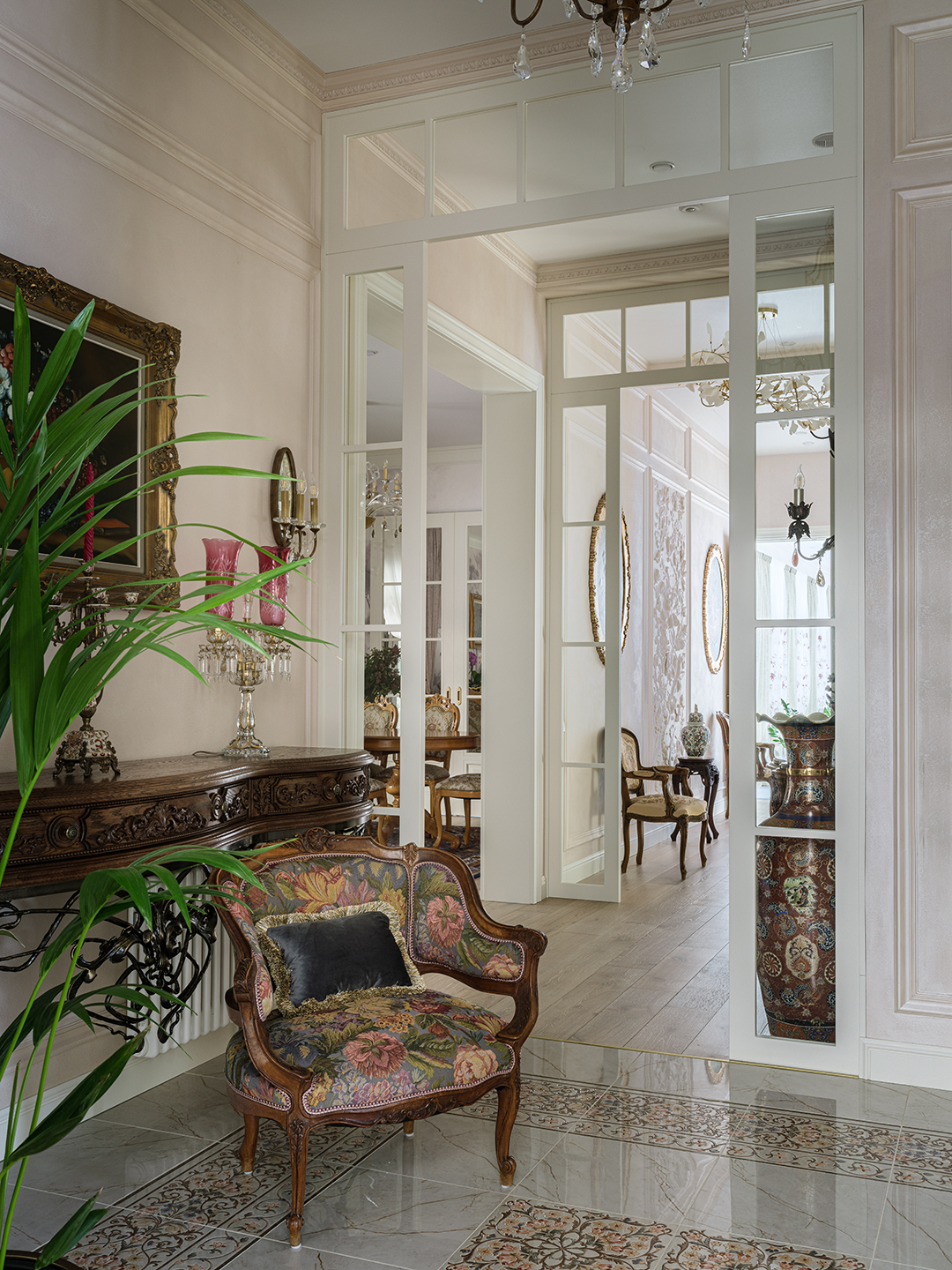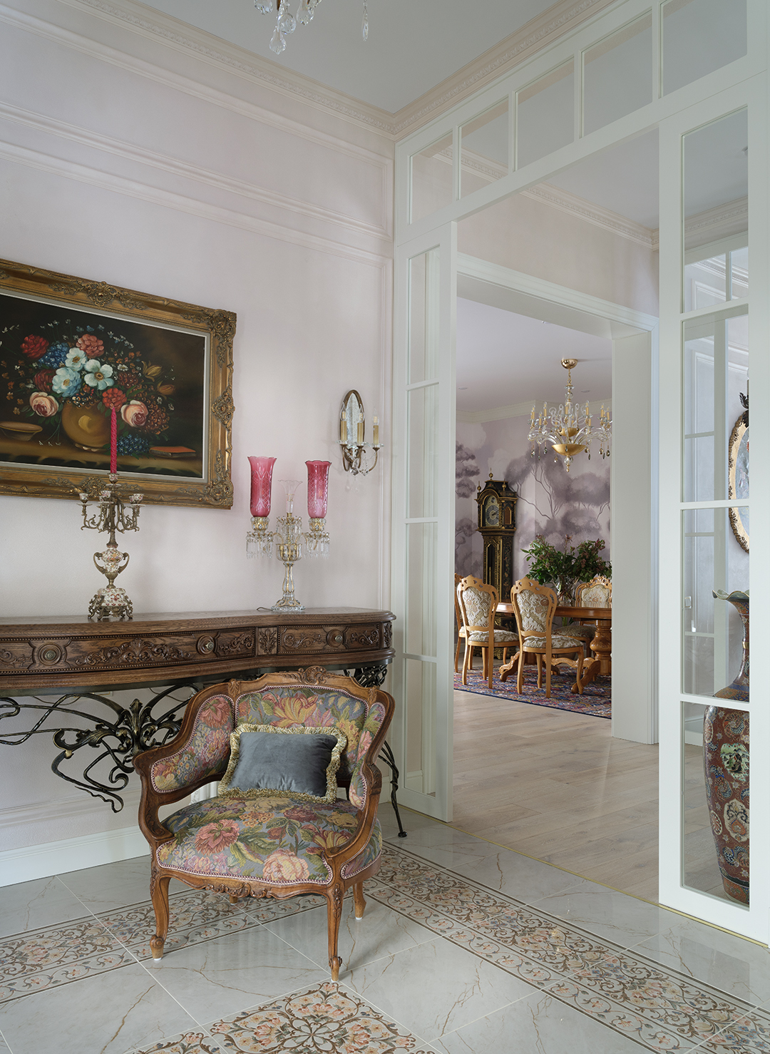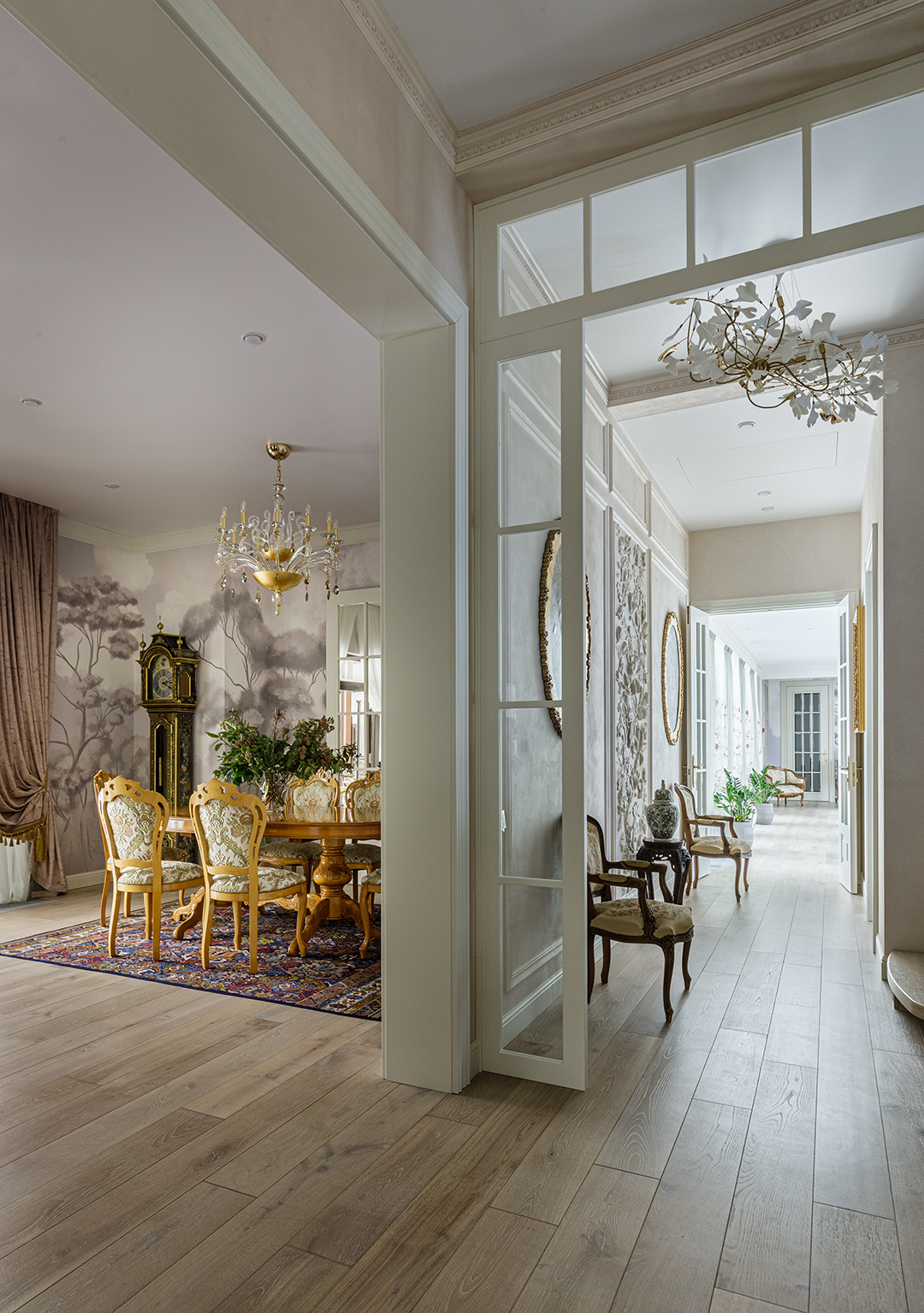 Проект преображения уже построенного загородного дома площадью 425 кв. м, начавшийся с решения проблемы неудобной входной зоны. Столкнувшись с готовыми коммуникациями и изменившимся стилевым направлением заказчиков, от дизайнера потребовались точные и креативные решения. Основной задачей стало создание гармоничного интерьера, объединяющего элементы классики, винтажа и шинуазри, при этом максимально сохраняя существующую структуру. Высота потолков варьируется от 2.5 до 3.4 метров, добавляя пространству объем и уникальность.