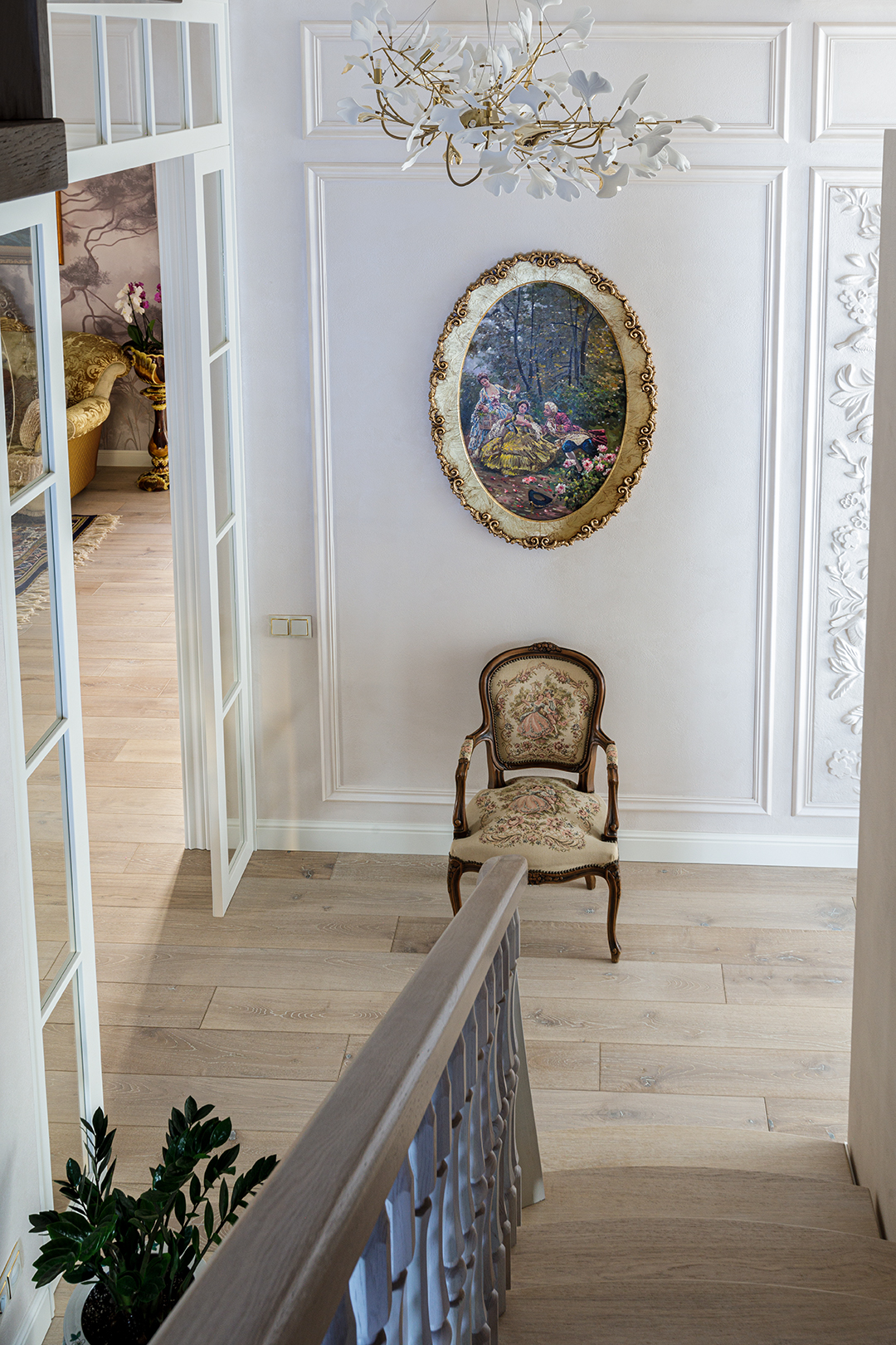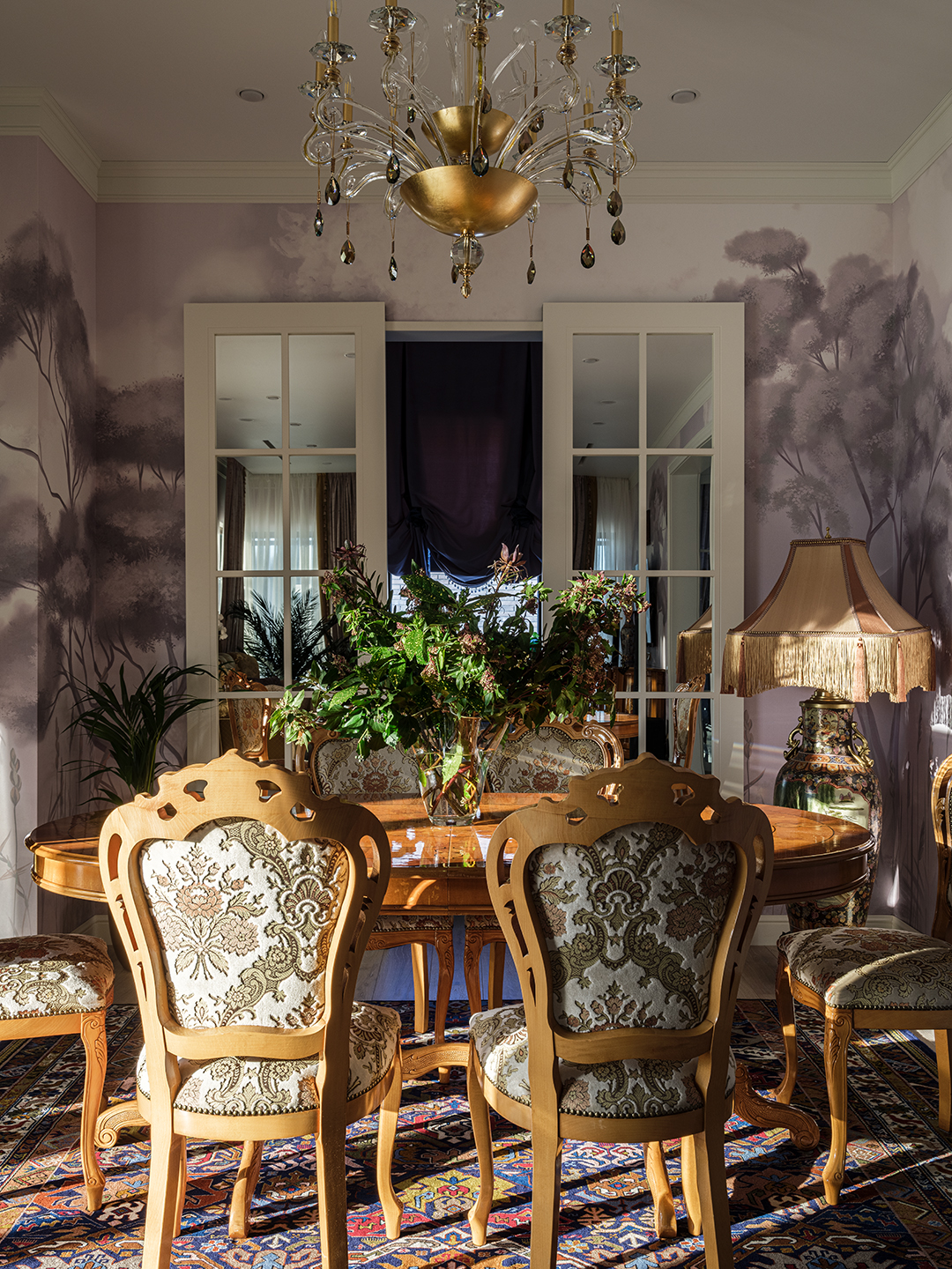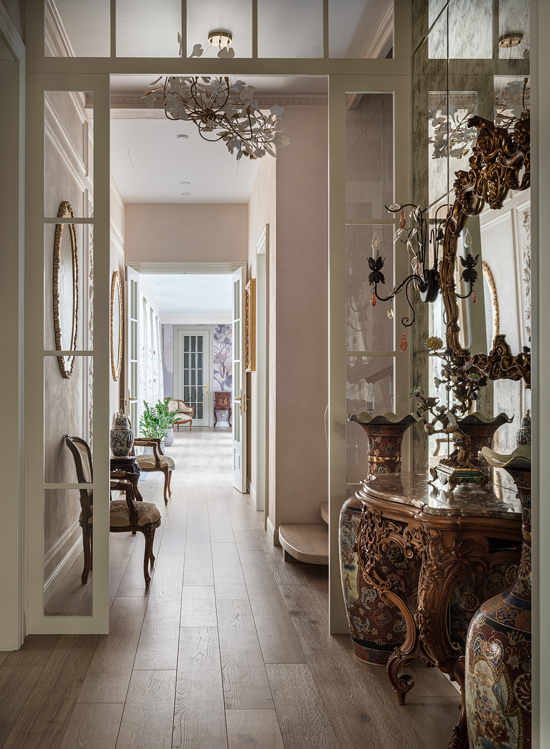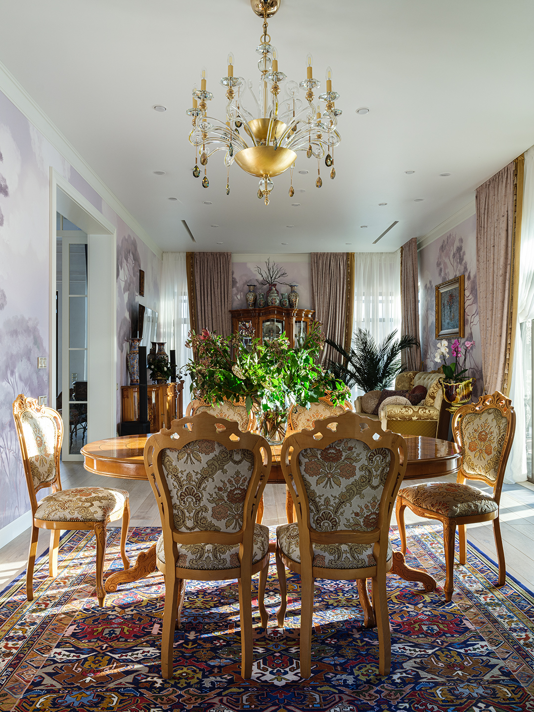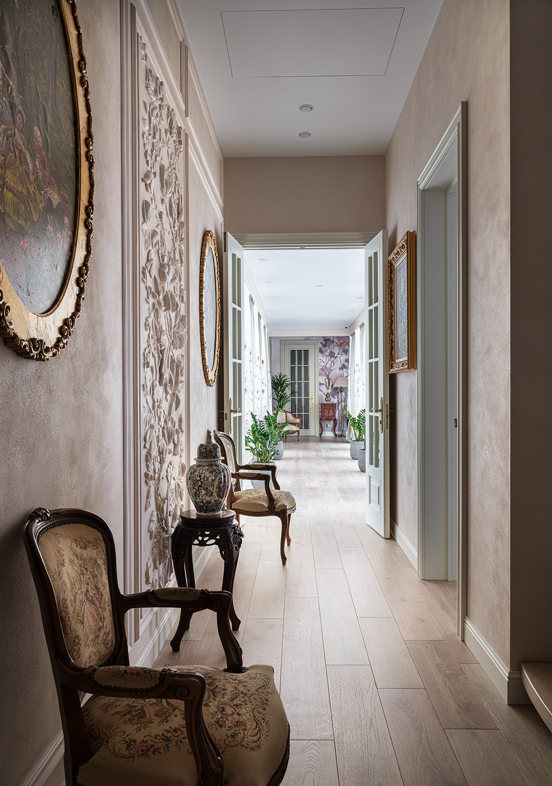 Проект преображения уже построенного загородного дома площадью 425 кв. м, начавшийся с решения проблемы неудобной входной зоны. Столкнувшись с готовыми коммуникациями и изменившимся стилевым направлением заказчиков, от дизайнера потребовались точные и креативные решения. Основной задачей стало создание гармоничного интерьера, объединяющего элементы классики, винтажа и шинуазри, при этом максимально сохраняя существующую структуру. Высота потолков варьируется от 2.5 до 3.4 метров, добавляя пространству объем и уникальность.