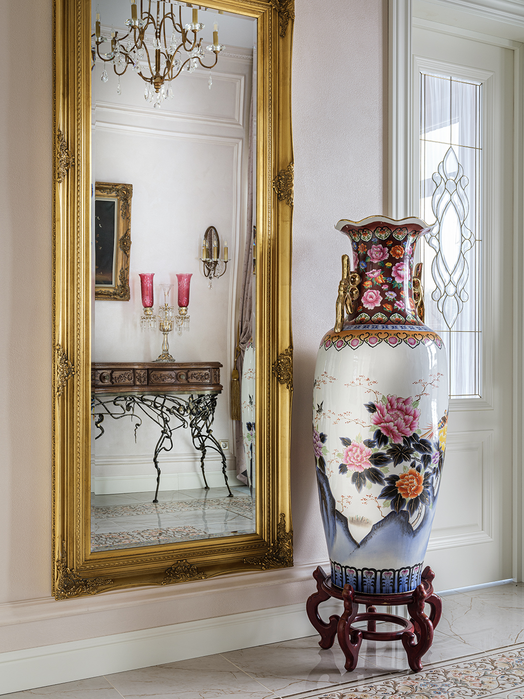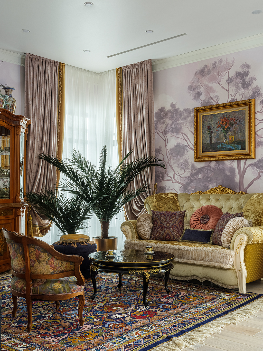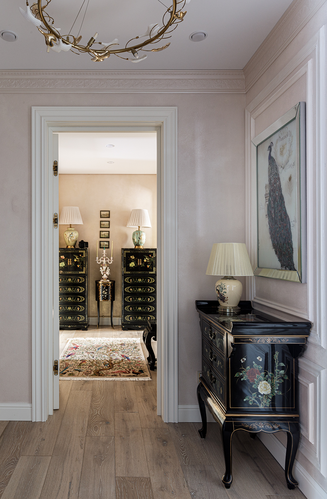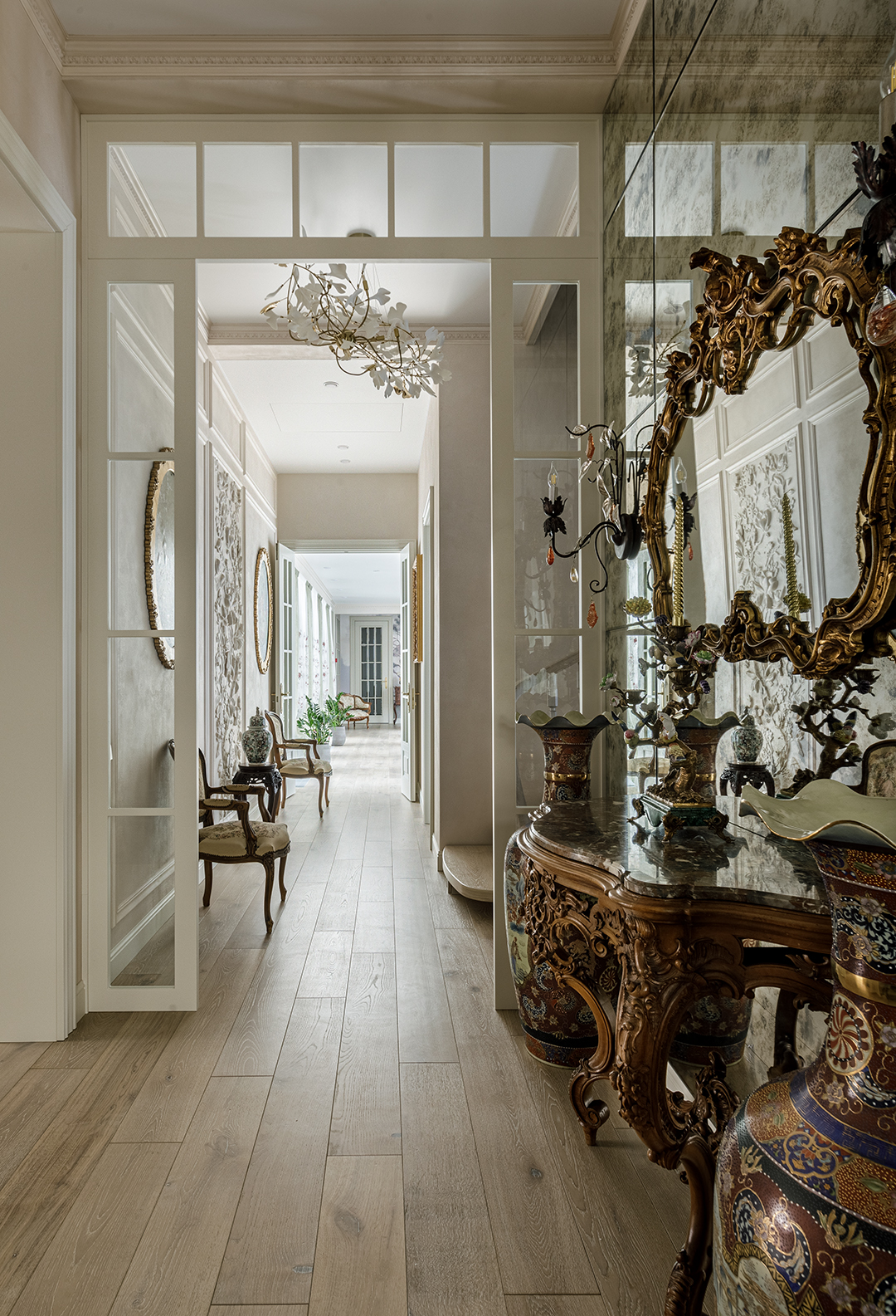 Проект преображения уже построенного загородного дома площадью 425 кв. м, начавшийся с решения проблемы неудобной входной зоны. Столкнувшись с готовыми коммуникациями и изменившимся стилевым направлением заказчиков, от дизайнера потребовались точные и креативные решения. Основной задачей стало создание гармоничного интерьера, объединяющего элементы классики, винтажа и шинуазри, при этом максимально сохраняя существующую структуру. Высота потолков варьируется от 2.5 до 3.4 метров, добавляя пространству объем и уникальность.