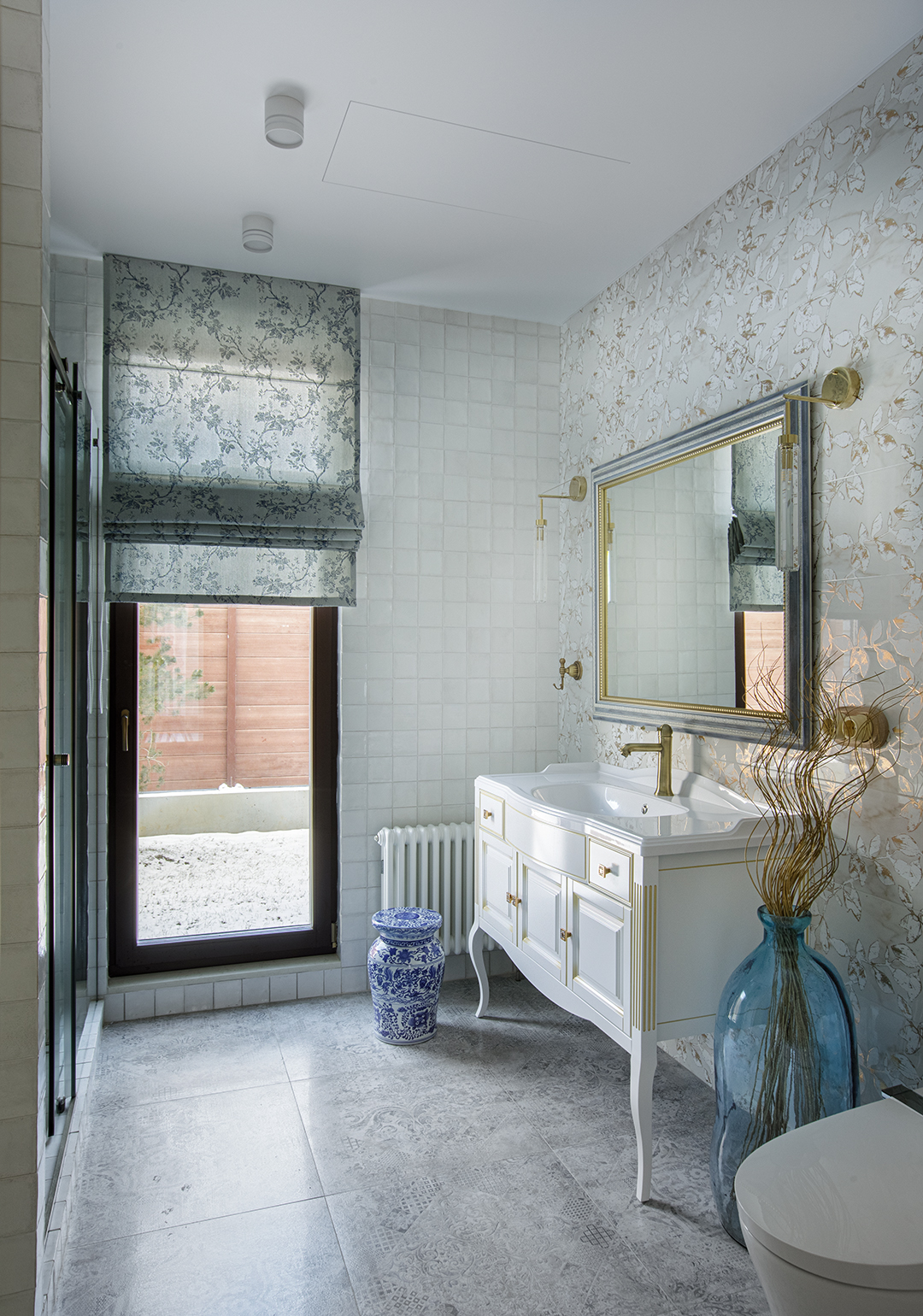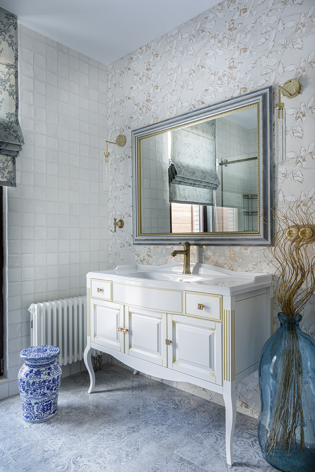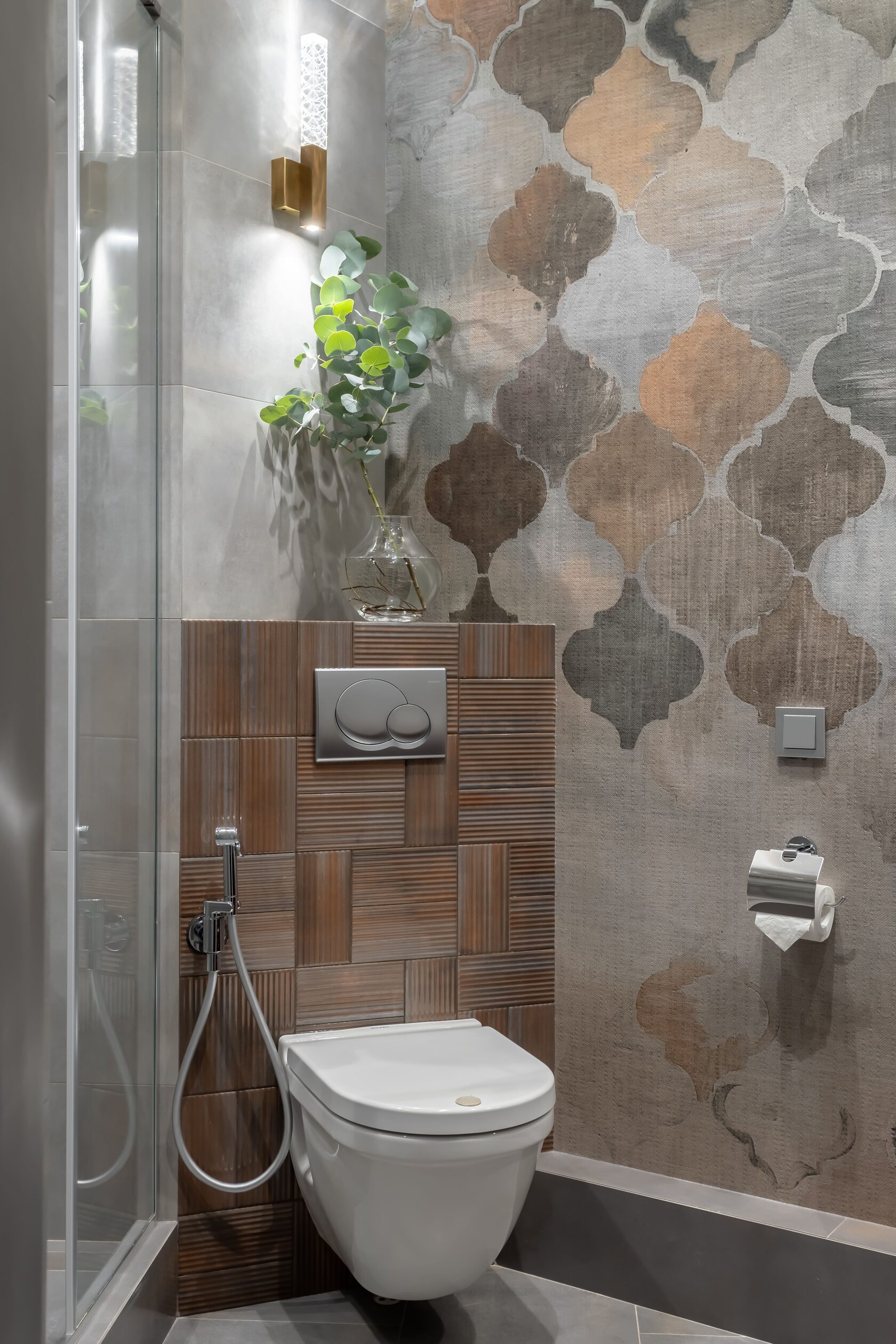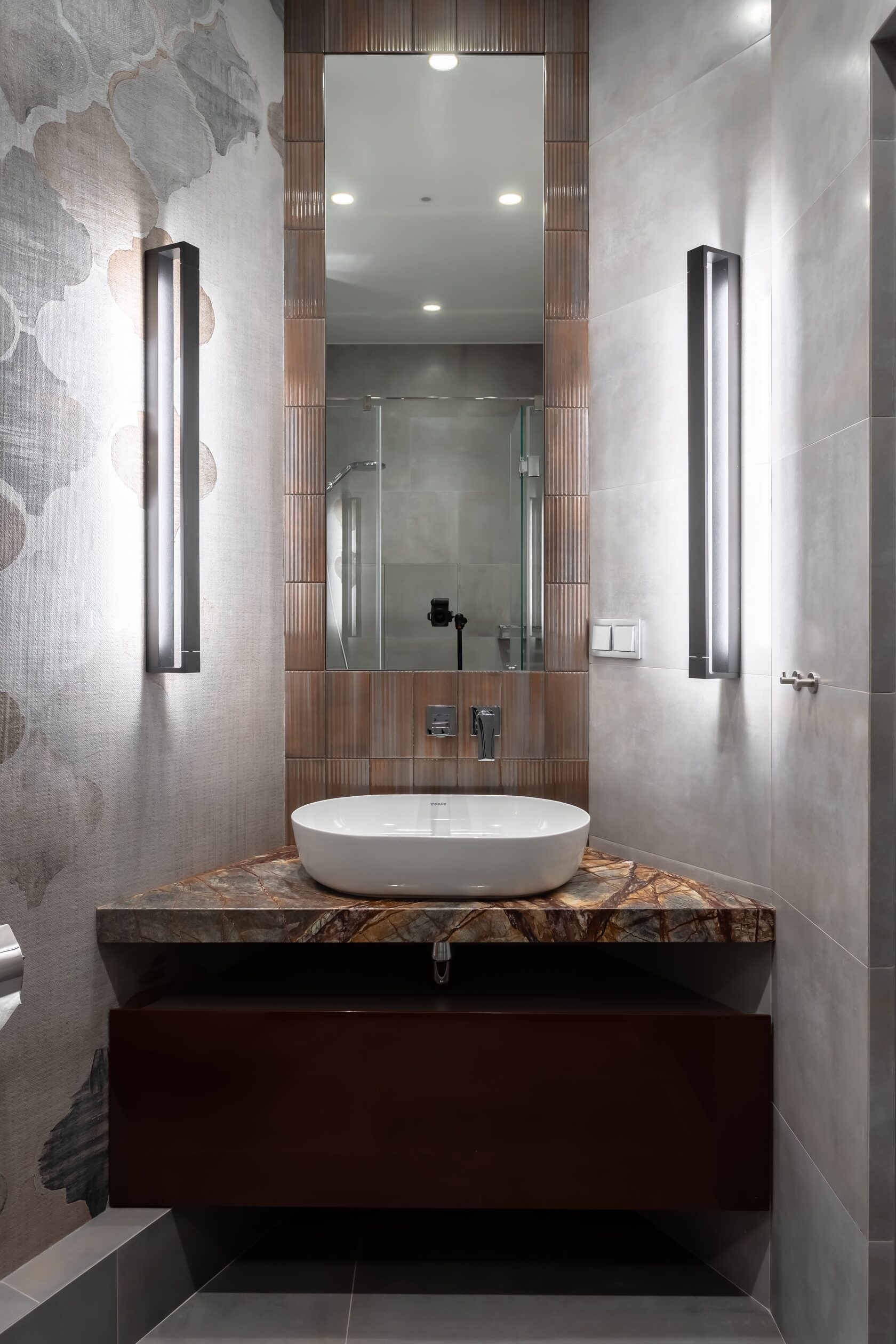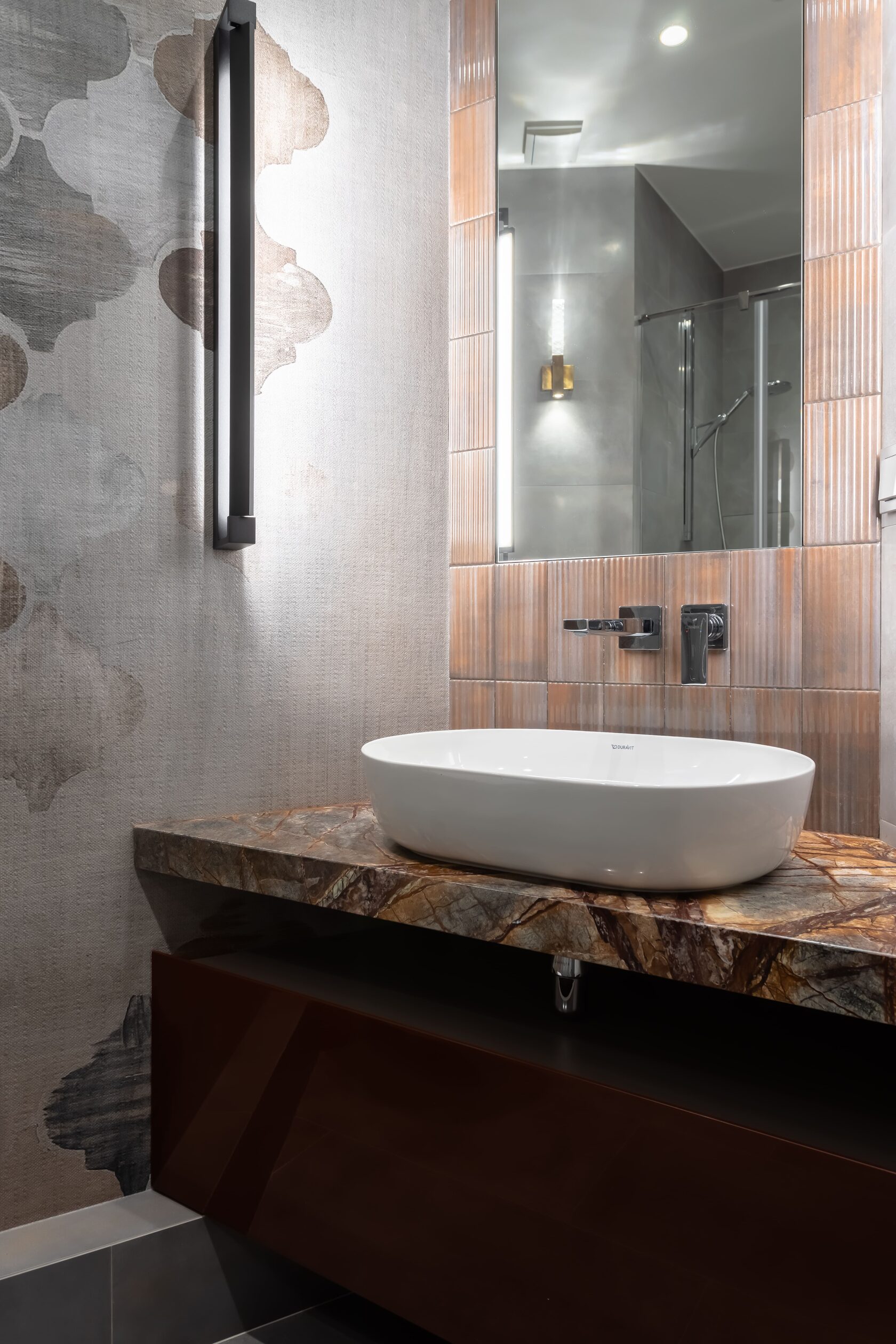 В этих интерьерах использованы мои любимые обои Wet System от Wall&Deco — их можно безопасно применять даже в душевых. Чтобы подчеркнуть красоту рисунка, я всегда подбираю к ним плитку с характером, но не перегружающую пространство.