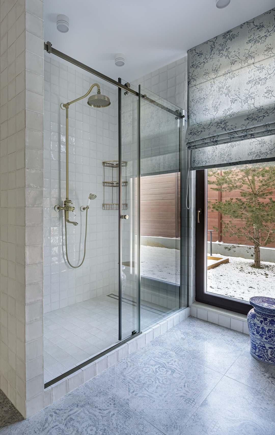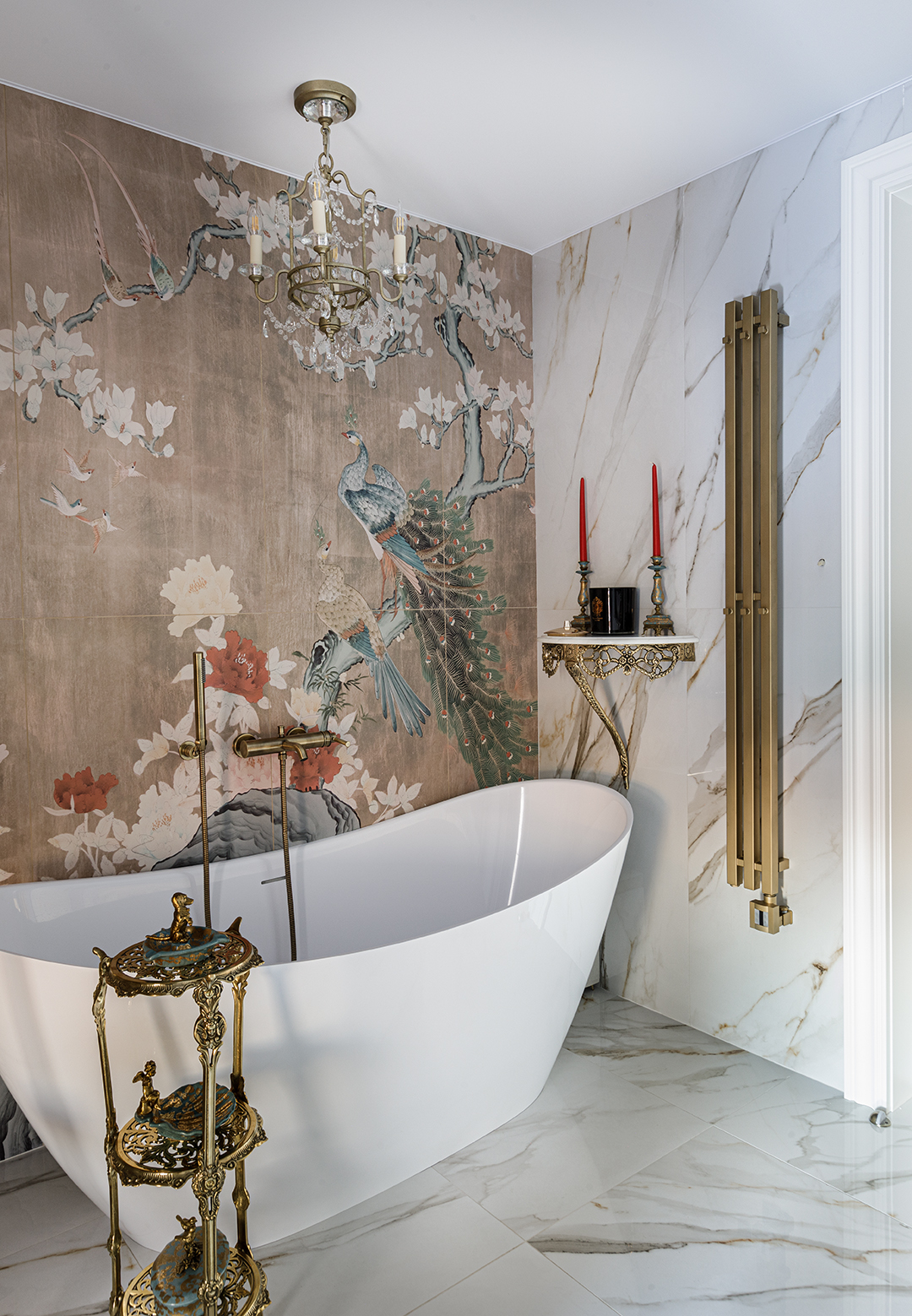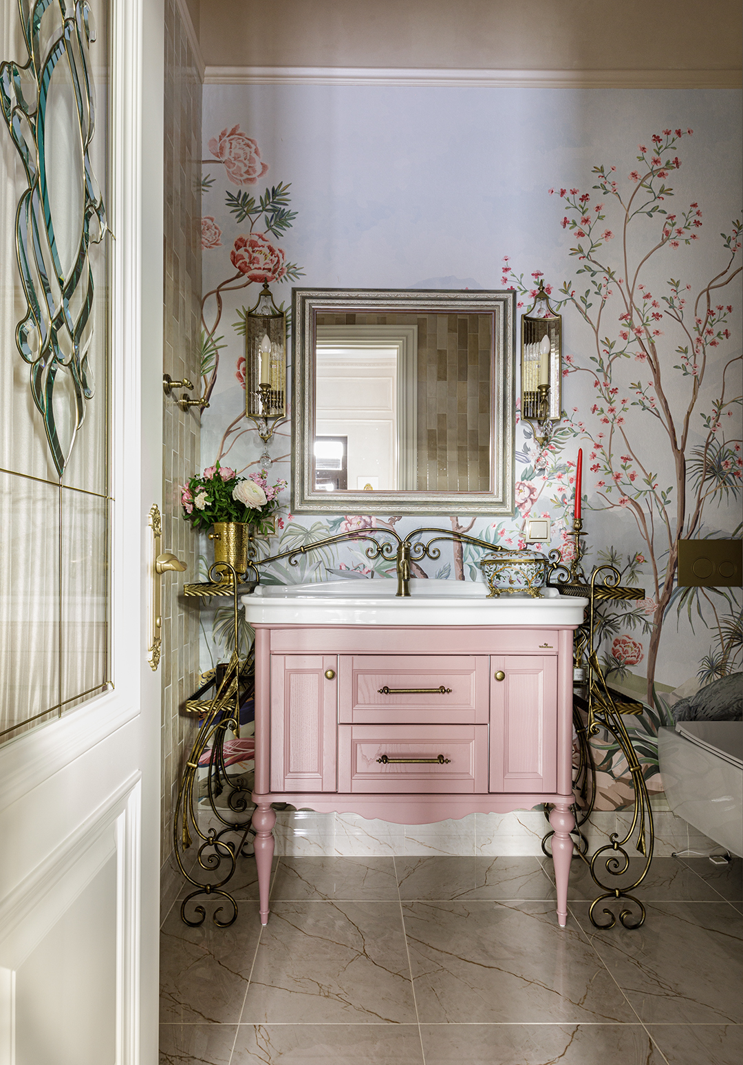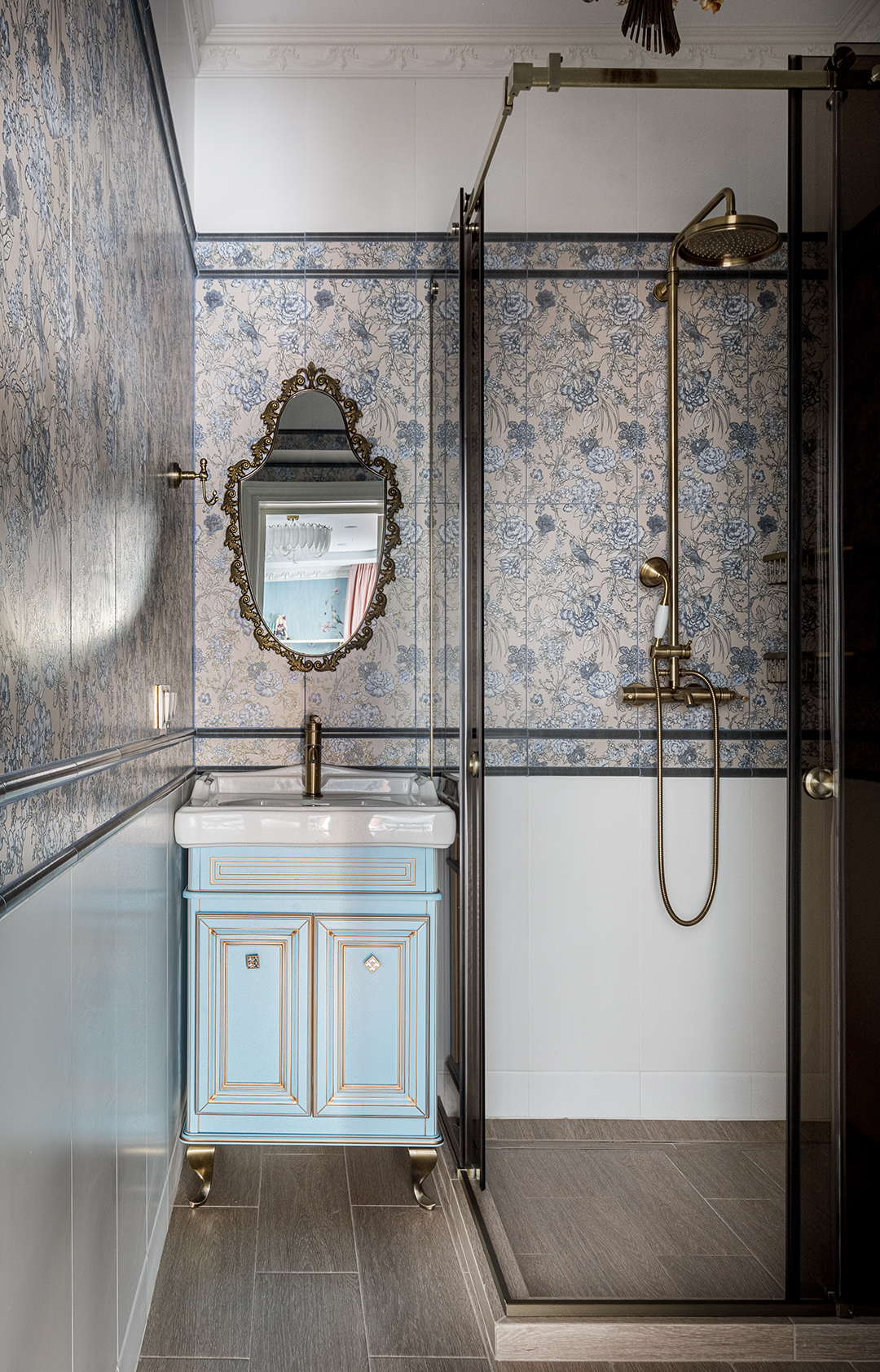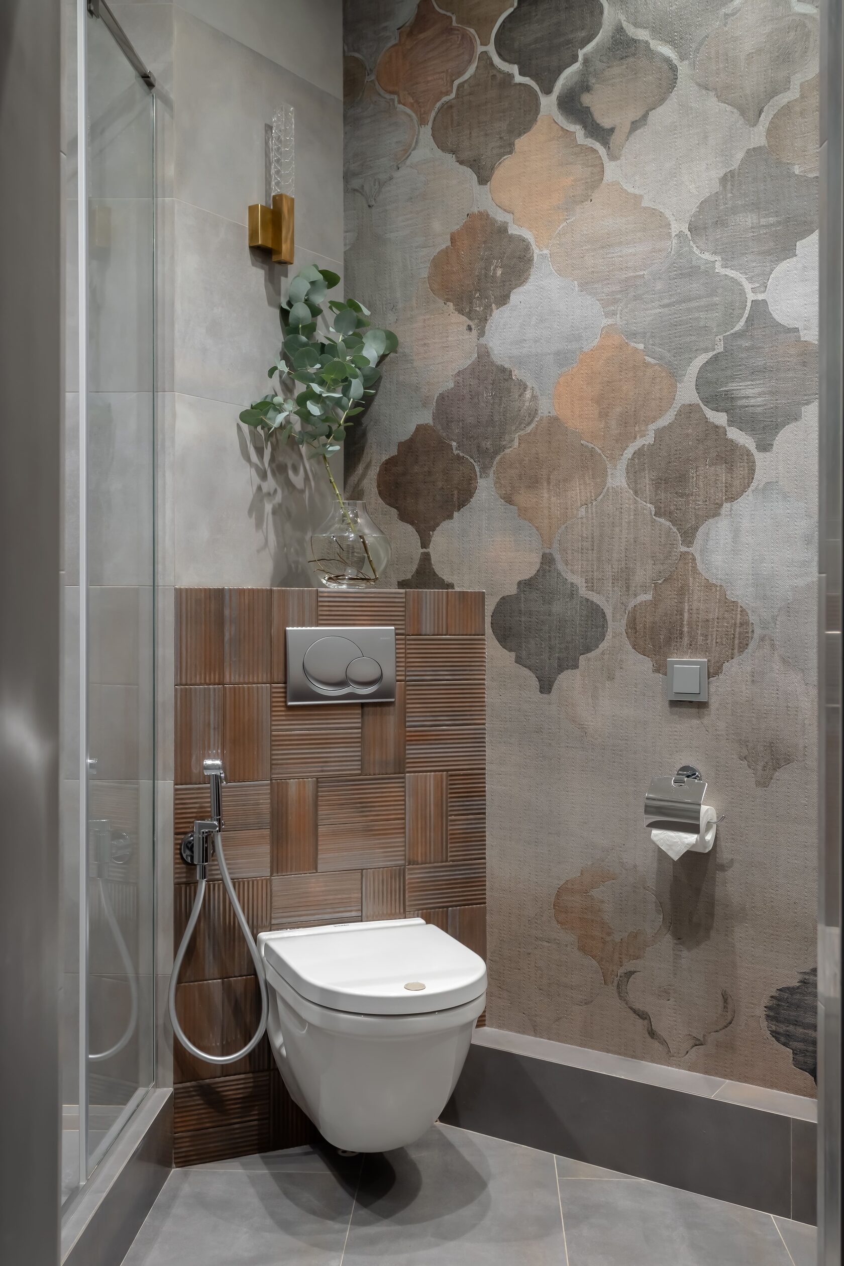 В этих интерьерах использованы мои любимые обои Wet System от Wall&Deco — их можно безопасно применять даже в душевых. Чтобы подчеркнуть красоту рисунка, я всегда подбираю к ним плитку с характером, но не перегружающую пространство.