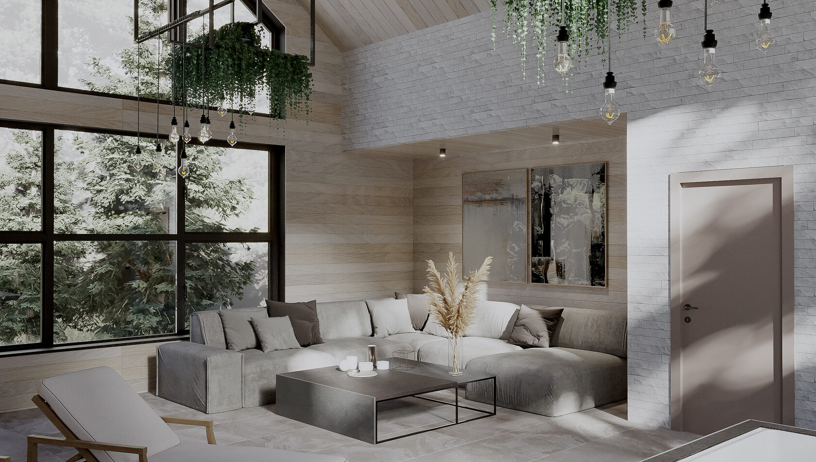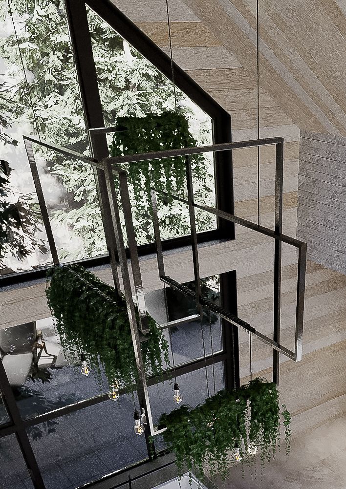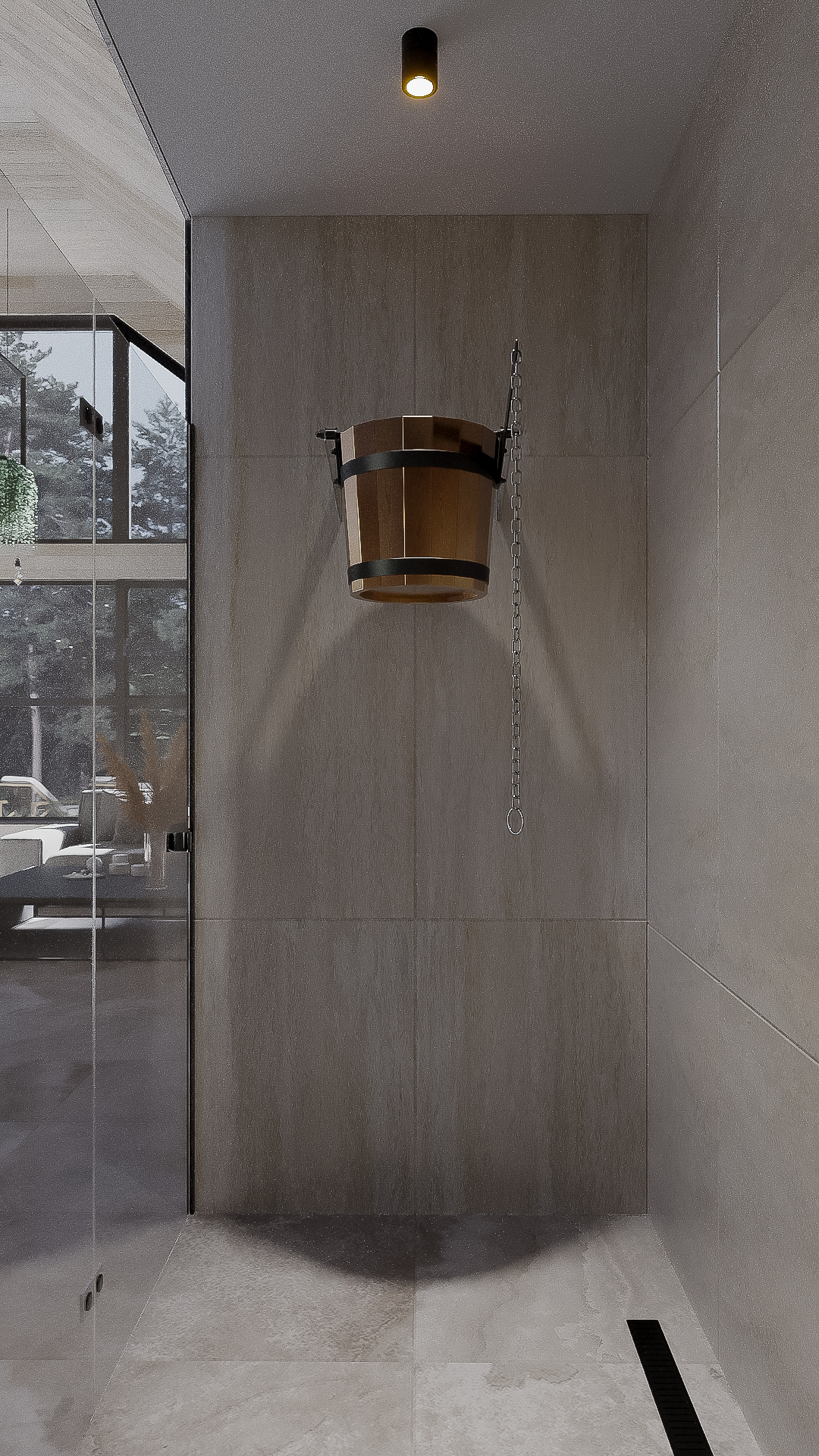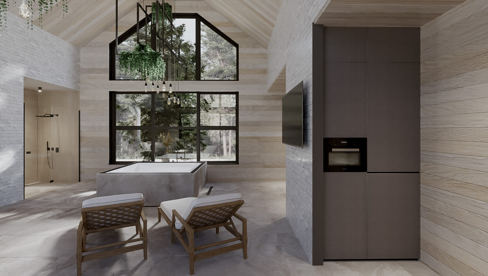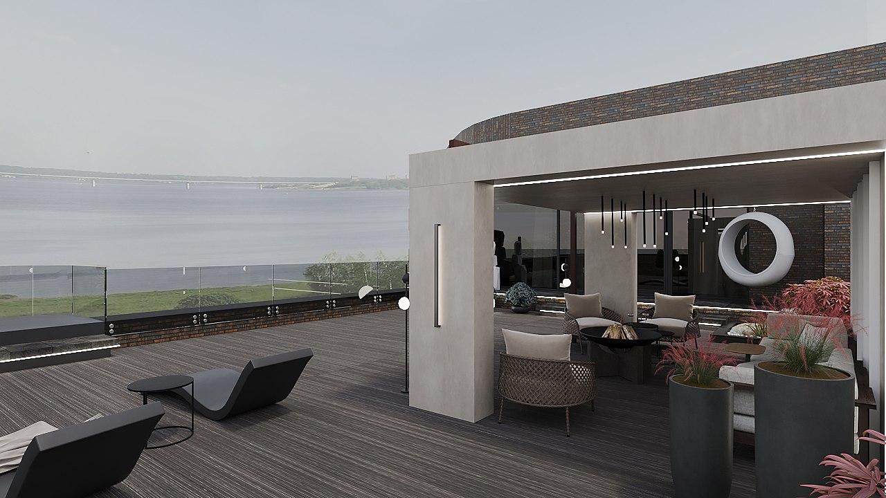 Концепция: Основная концепция проекта — создание единого, эстетически привлекательного пространства, где границы между интерьером и экстерьером стираются. Это достигается за счет применения декоративного покрытия «арт-бетон» с защитным лаком. Данный материал, отличающийся приятной природной текстурой и высокой влагостойкостью, используется как во влажных зонах интерьера (кухня-гостиная, ванные комнаты, СПА), так и на внешней террасе, включая летний навес и арт-объекты, такие как вазоны и шезлонги. Такая универсальность и тактильно-приятные поверхности формируют общее стилевое решение и поддерживают интеграцию с природой.