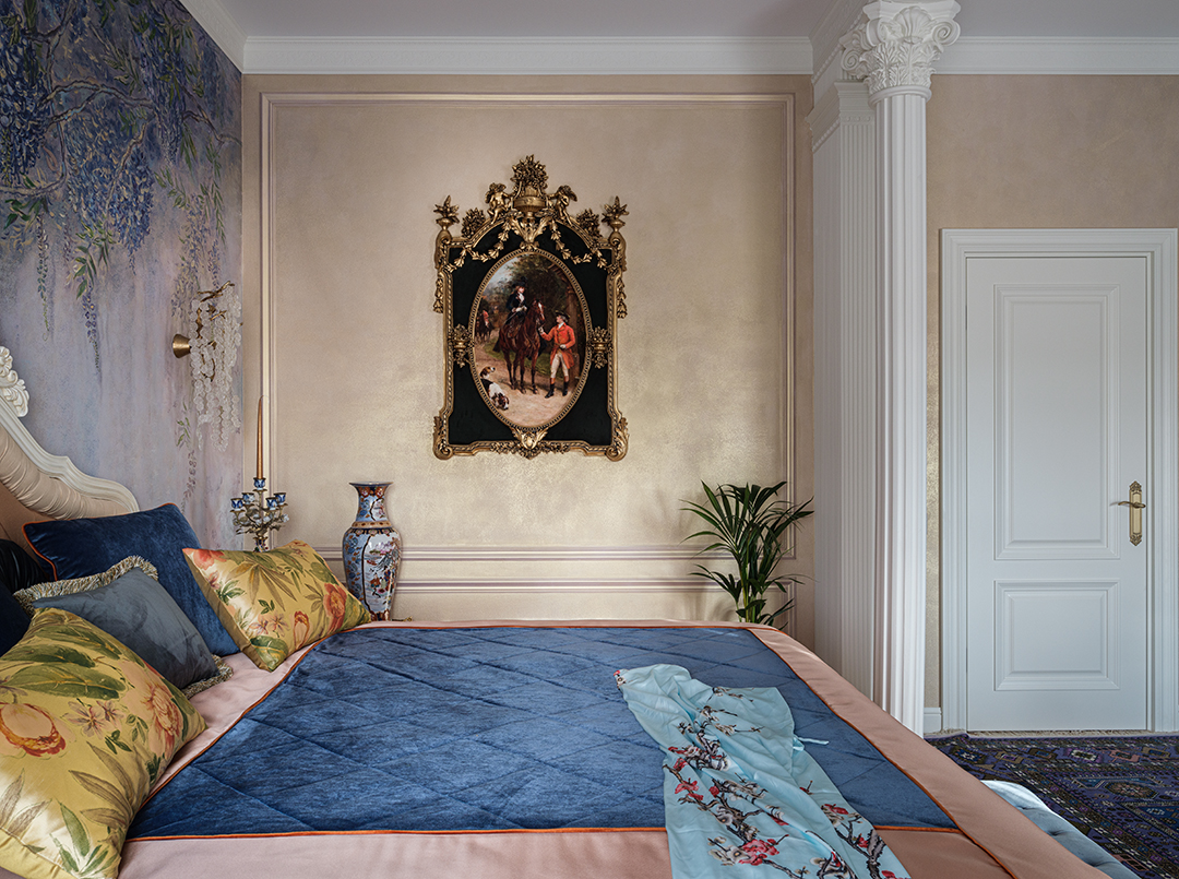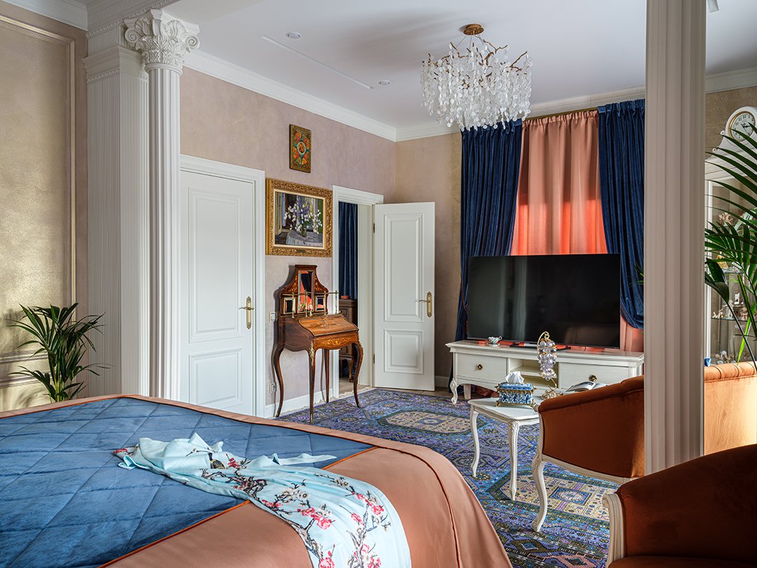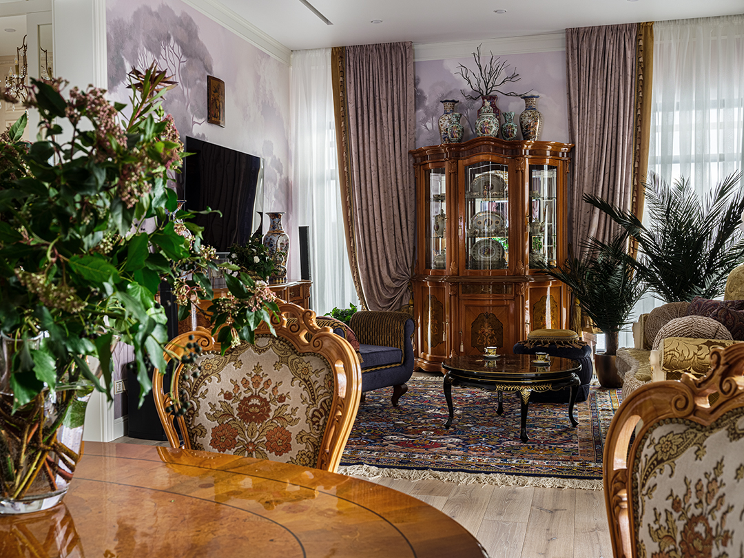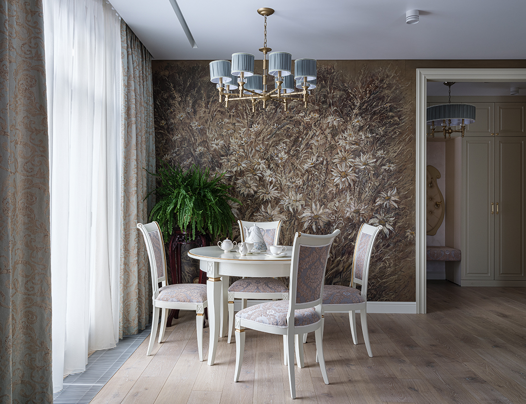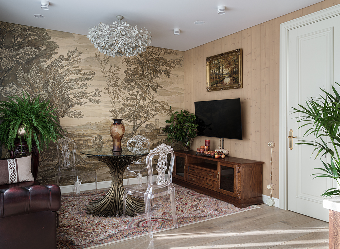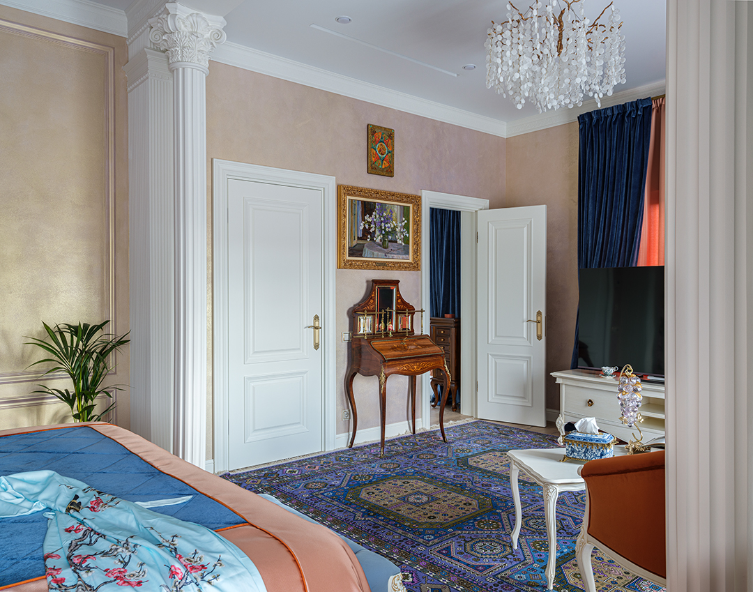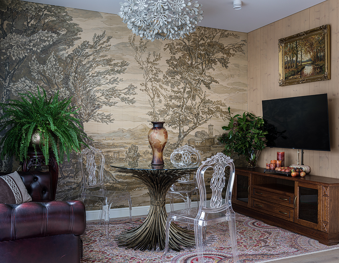 Концепция: Основная концепция проекта — виртуозное переосмысление существующего пространства и тонкая интеграция разнообразных стилевых элементов. Отталкиваясь от уже приобретенной винтажной мебели в классическом стиле и шинуазри, был разработан интерьер, где каждый элемент находит свое место. Ключевые изменения включали трансформацию продуваемой террасы в уютную отапливаемую веранду, скрытие кухни за раздвижной дверью с созданием нового оконного проема, а также прорубание окна в ванной комнате для максимального света и комфорта. Важной частью стало решение по декорированию технических дверей и акцентная художественная роспись по декоративной штукатурке в спальне, выполненная художником Геннадием Львовым.