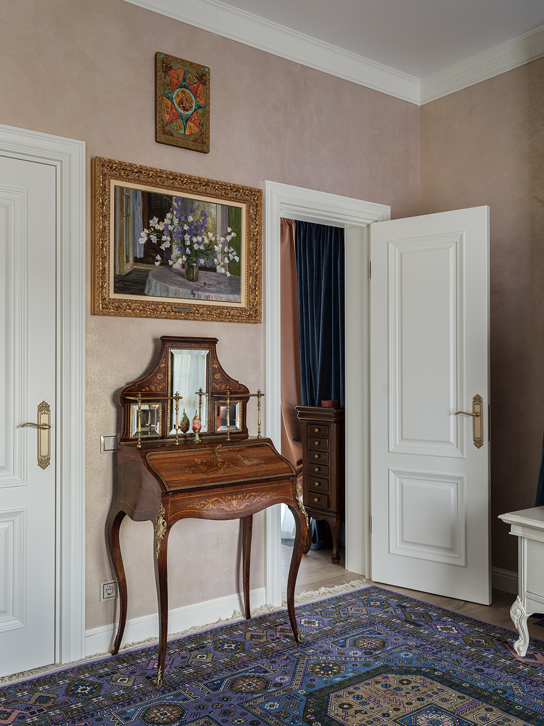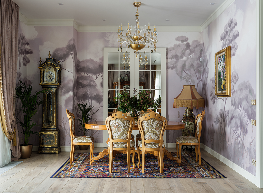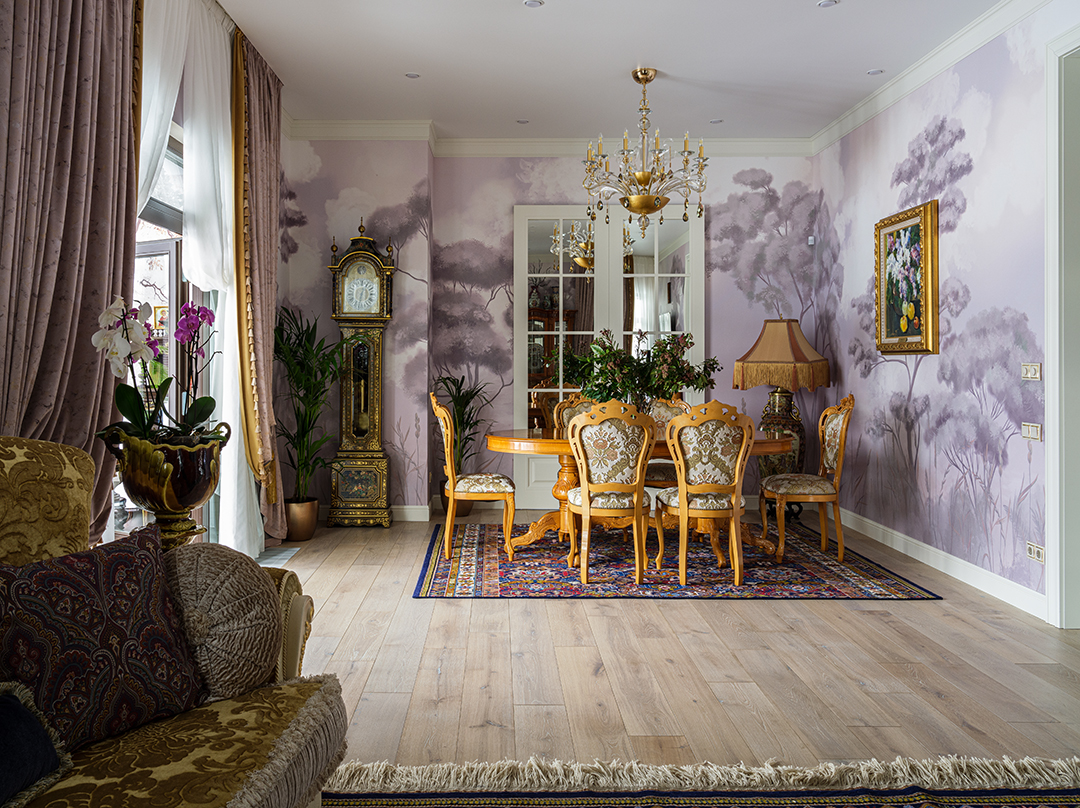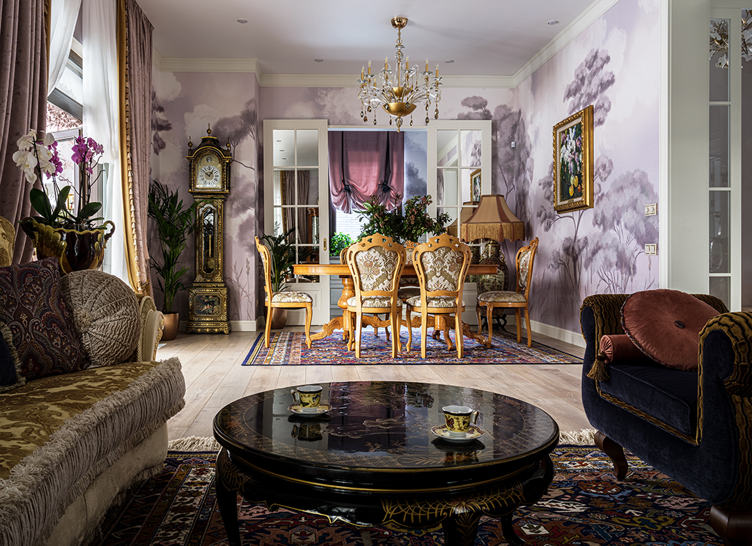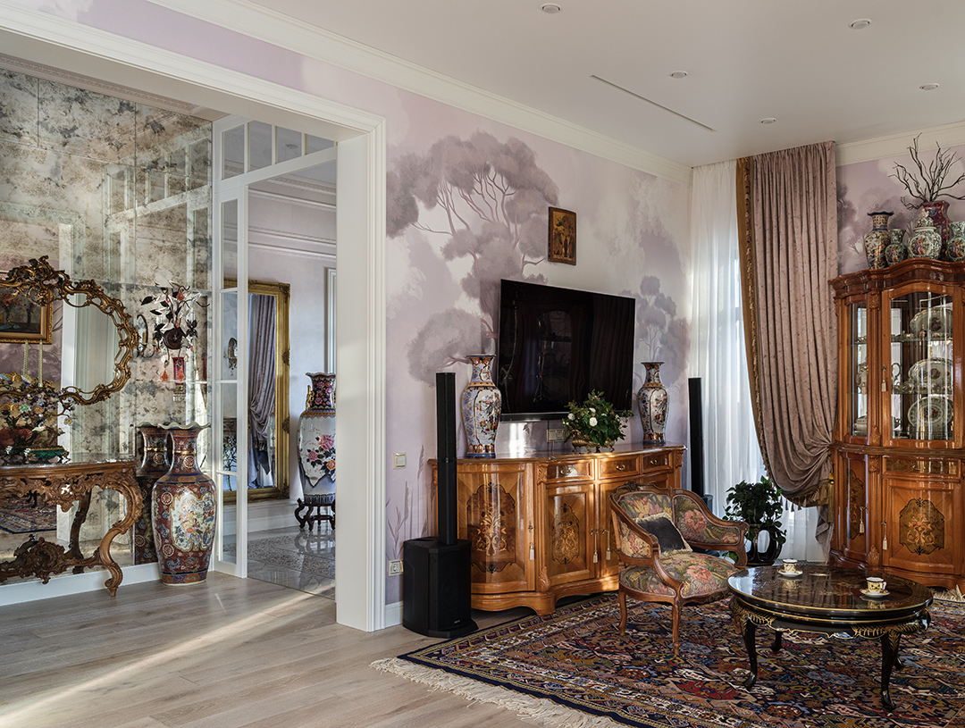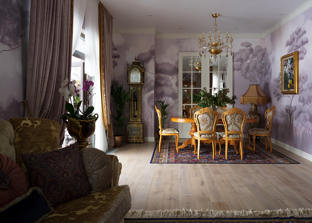 Концепция: Основная концепция проекта — виртуозное переосмысление существующего пространства и тонкая интеграция разнообразных стилевых элементов. Отталкиваясь от уже приобретенной винтажной мебели в классическом стиле и шинуазри, был разработан интерьер, где каждый элемент находит свое место. Ключевые изменения включали трансформацию продуваемой террасы в уютную отапливаемую веранду, скрытие кухни за раздвижной дверью с созданием нового оконного проема, а также прорубание окна в ванной комнате для максимального света и комфорта. Важной частью стало решение по декорированию технических дверей и акцентная художественная роспись по декоративной штукатурке в спальне, выполненная художником Геннадием Львовым.