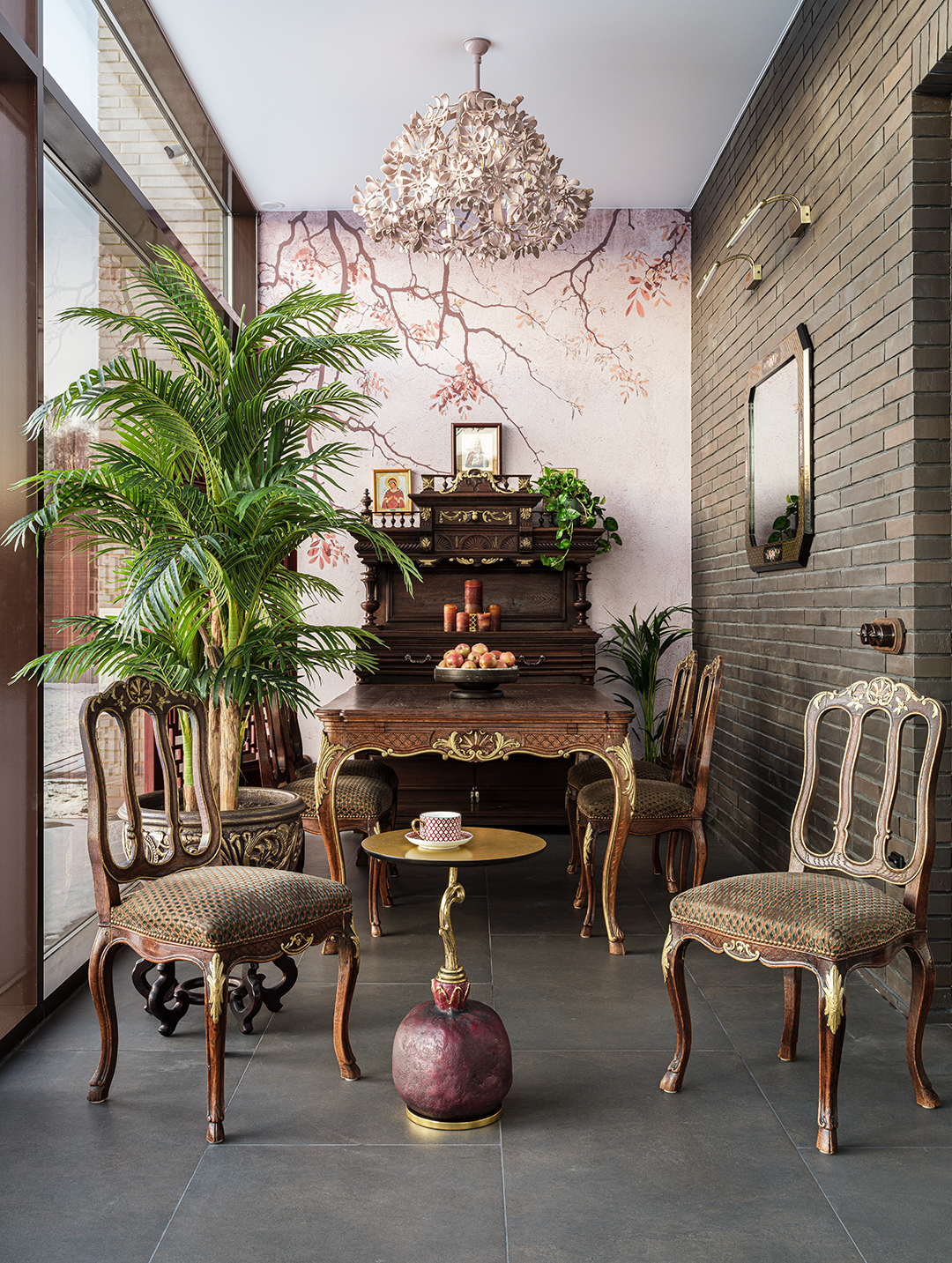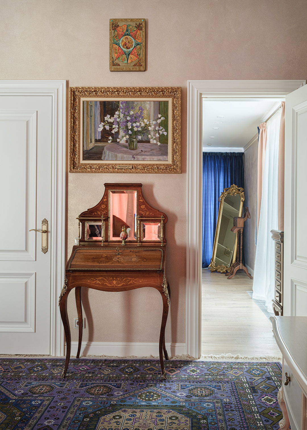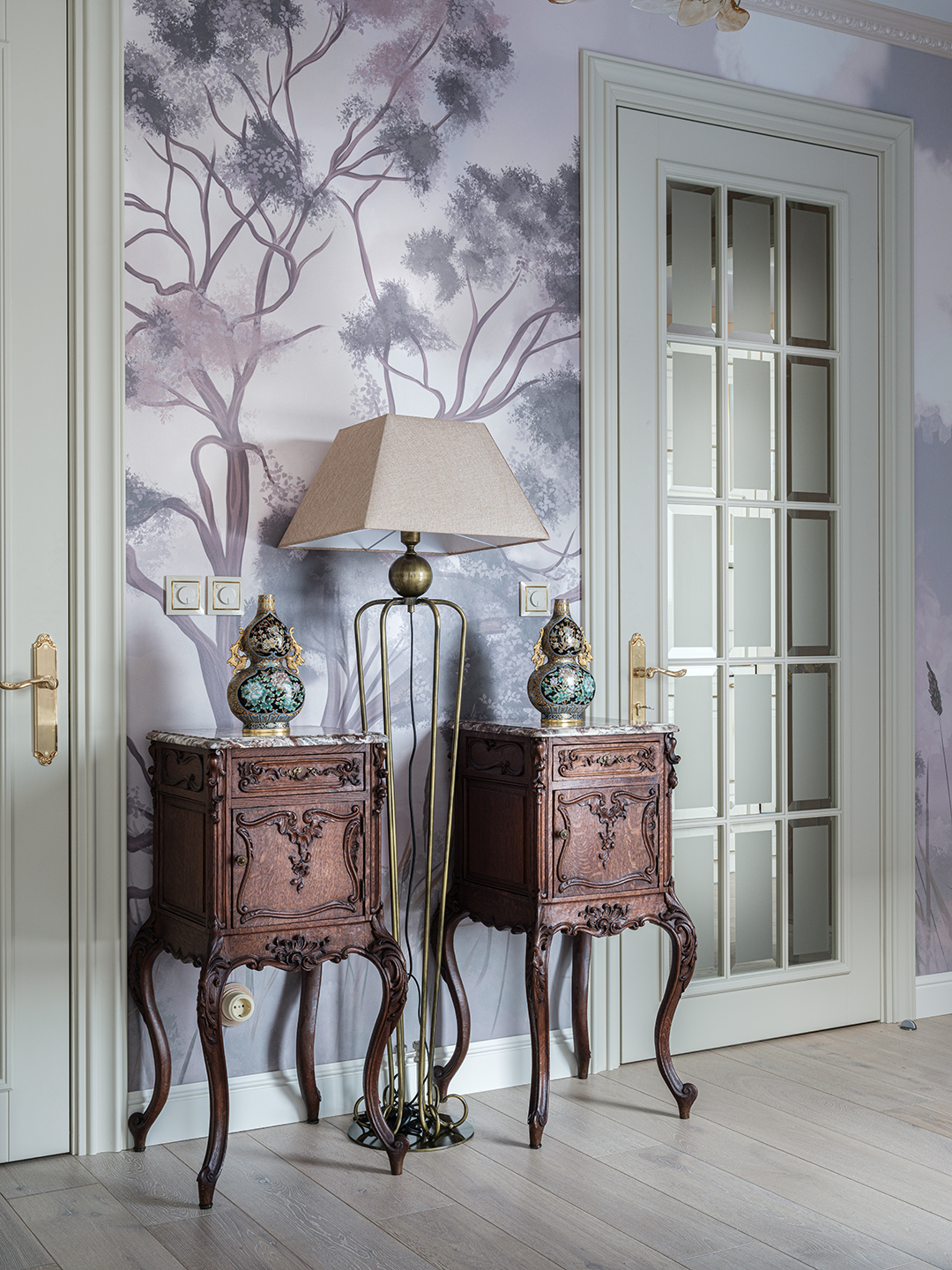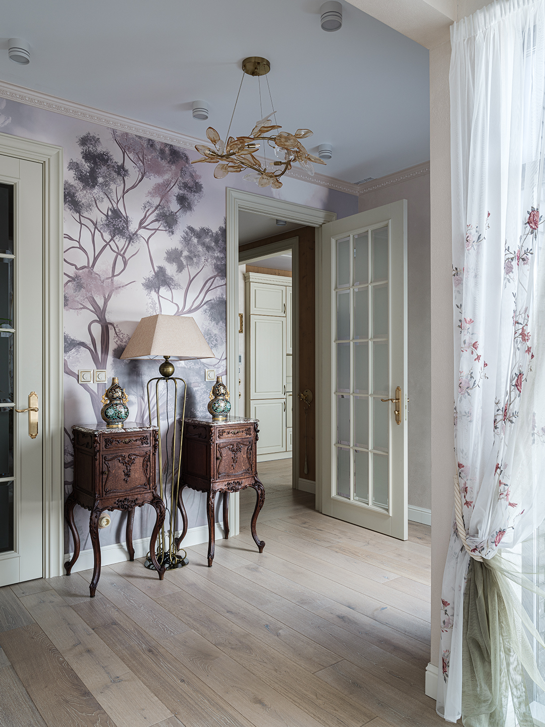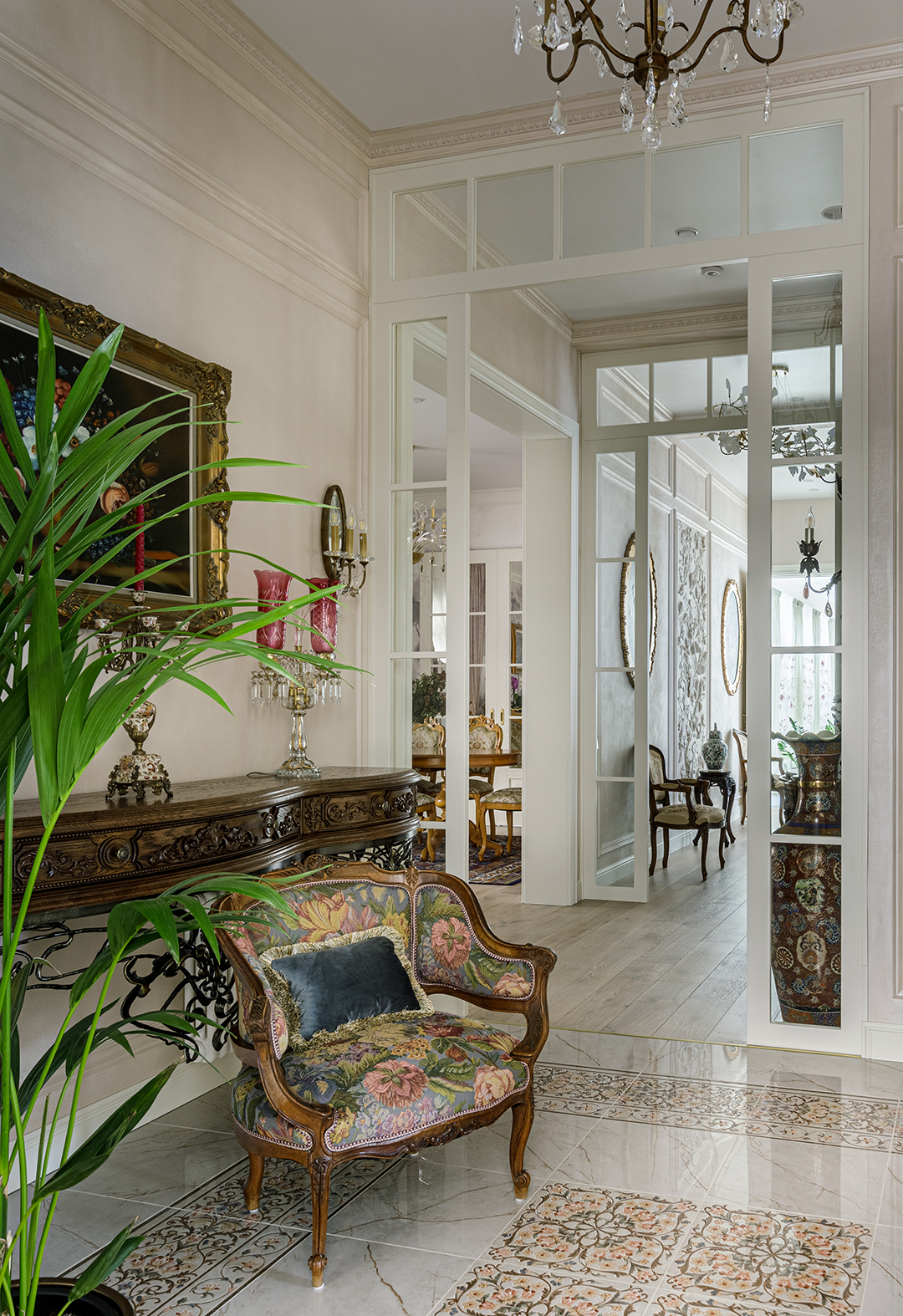 Концепция: Основная концепция проекта — виртуозное переосмысление существующего пространства и тонкая интеграция разнообразных стилевых элементов. Отталкиваясь от уже приобретенной винтажной мебели в классическом стиле и шинуазри, был разработан интерьер, где каждый элемент находит свое место. Ключевые изменения включали трансформацию продуваемой террасы в уютную отапливаемую веранду, скрытие кухни за раздвижной дверью с созданием нового оконного проема, а также прорубание окна в ванной комнате для максимального света и комфорта. Важной частью стало решение по декорированию технических дверей и акцентная художественная роспись по декоративной штукатурке в спальне, выполненная художником Геннадием Львовым.