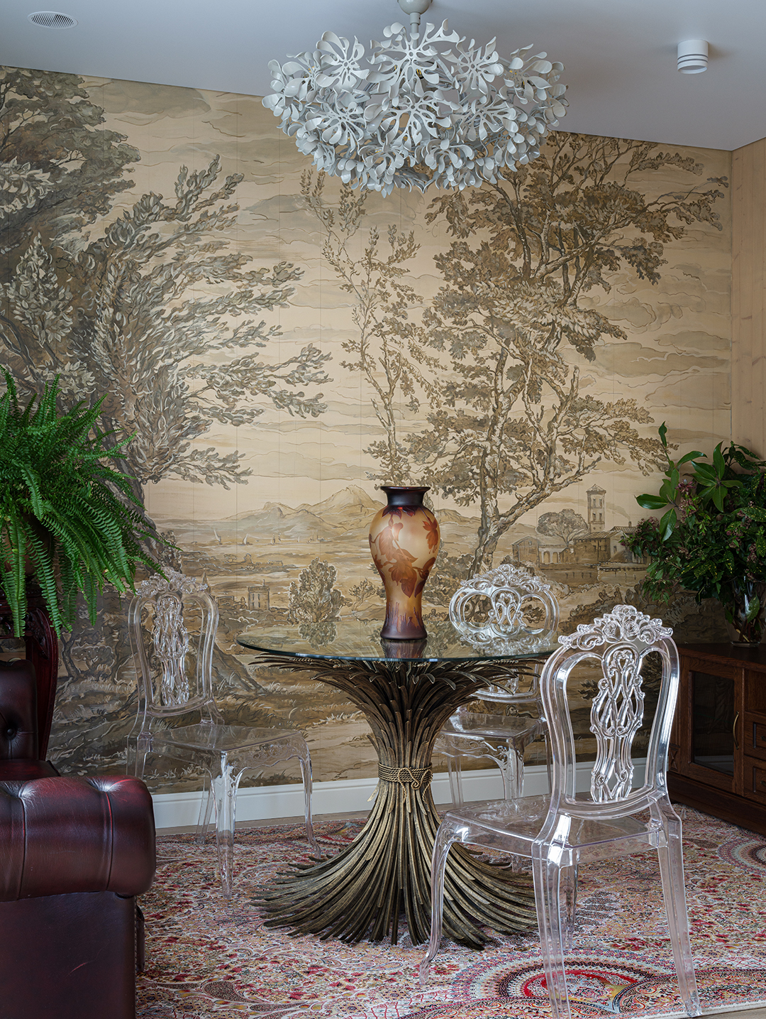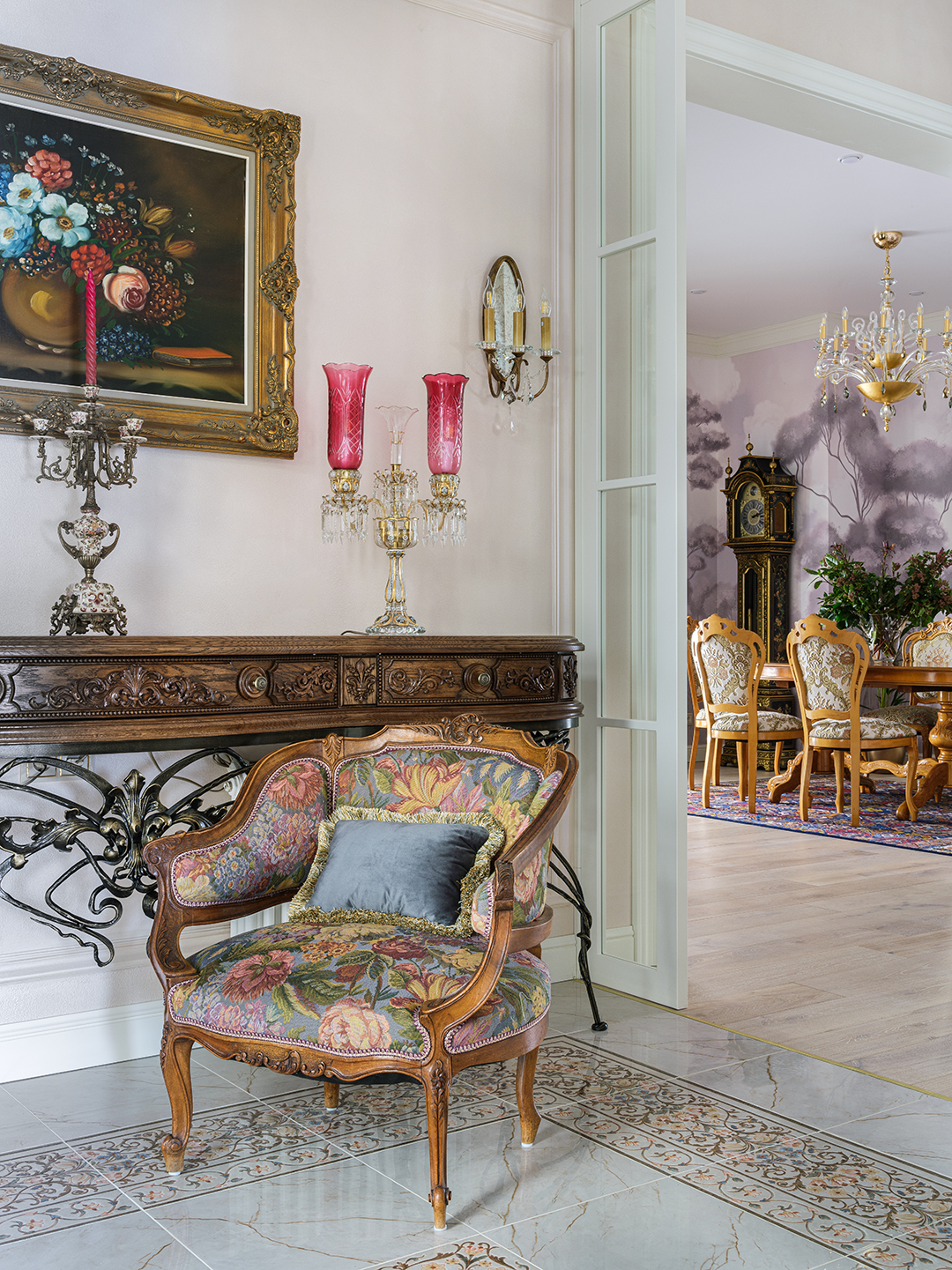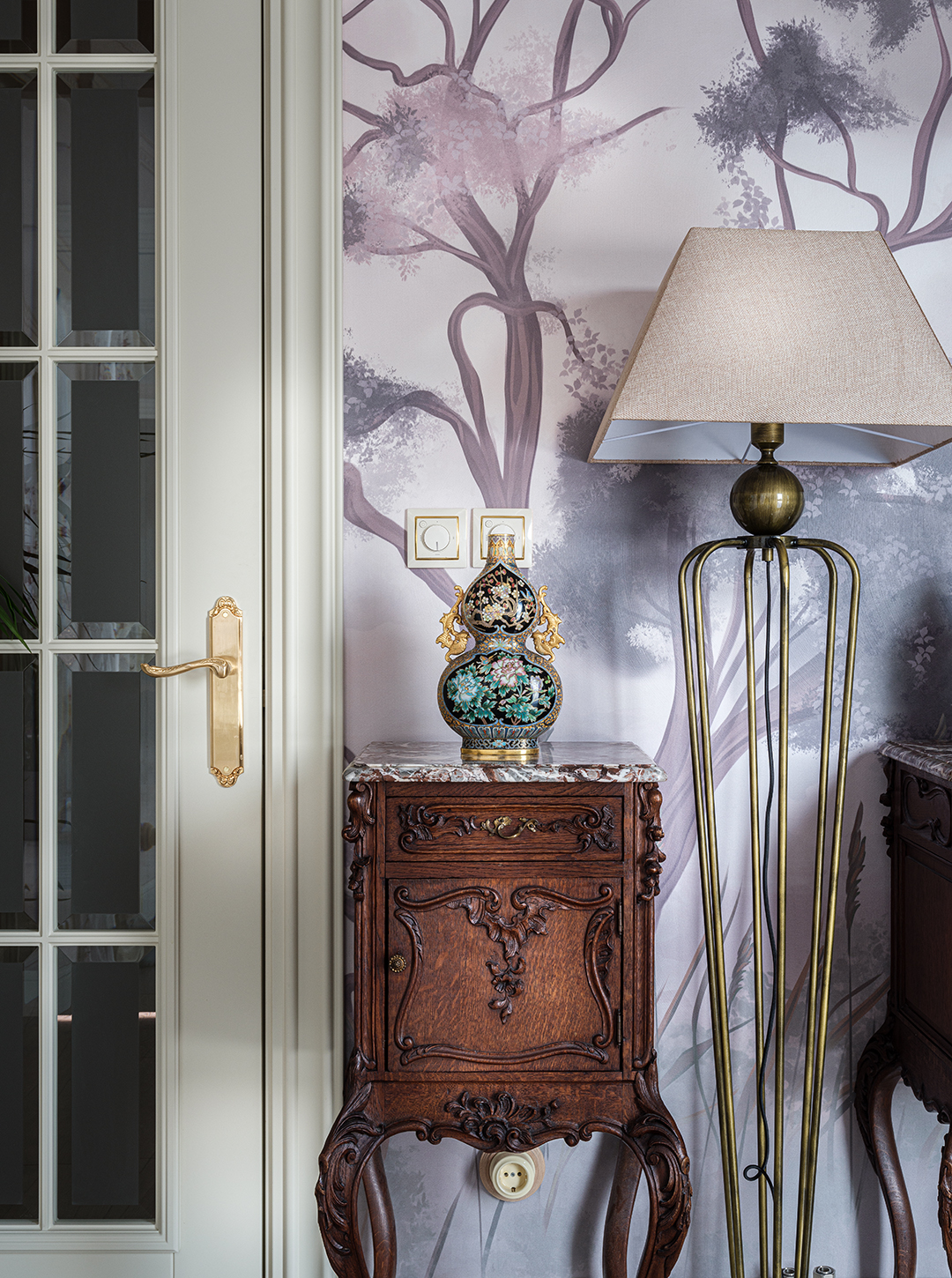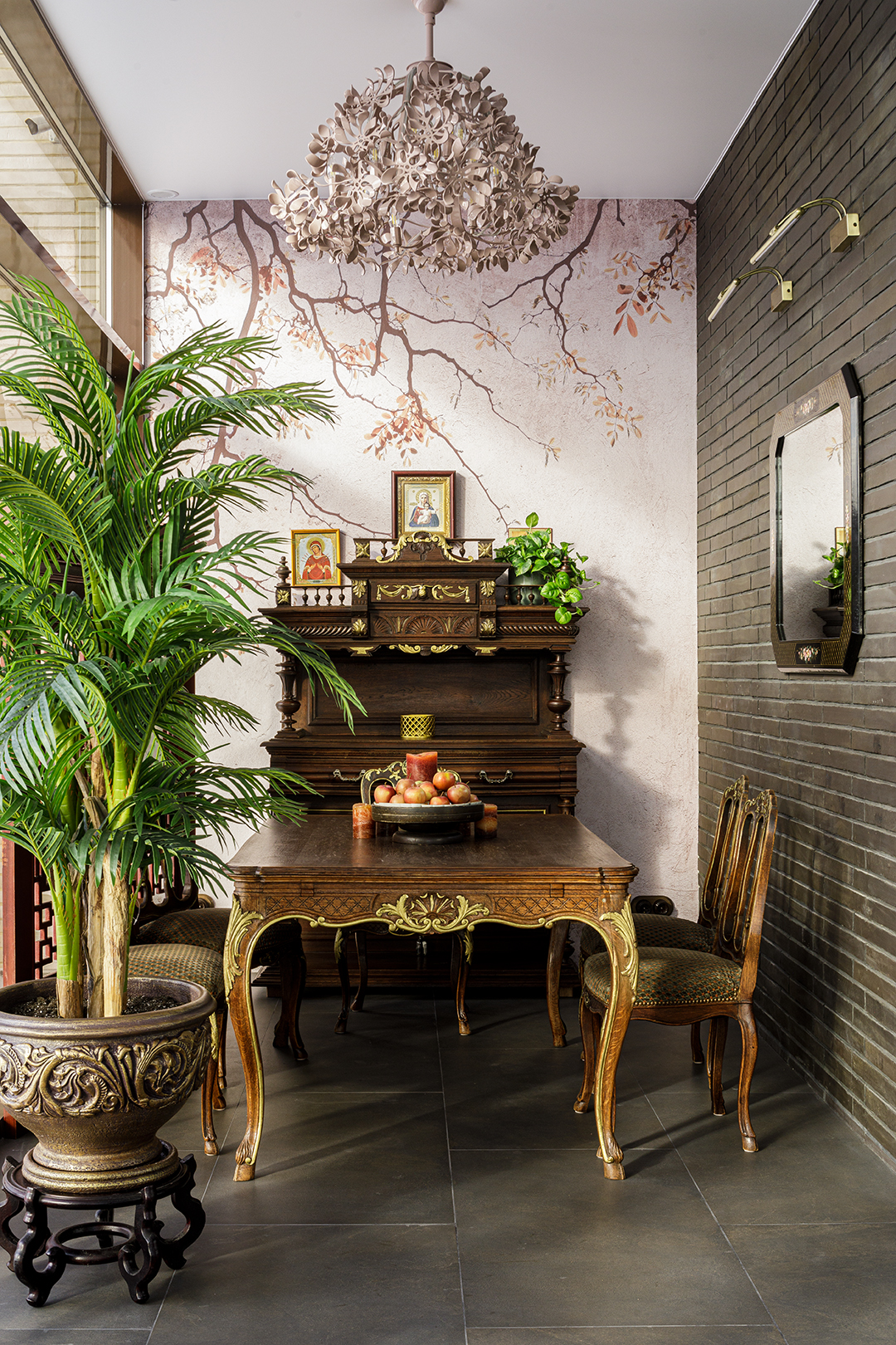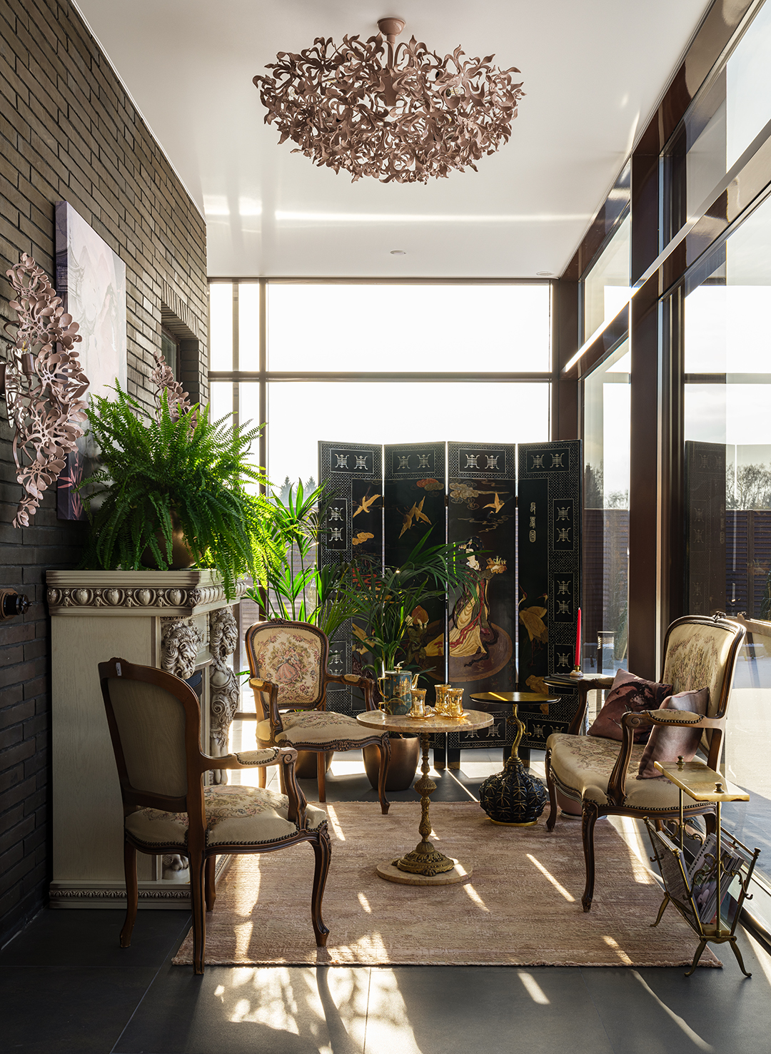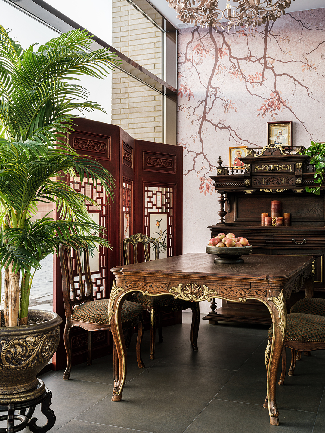 Концепция: Основная концепция проекта — виртуозное переосмысление существующего пространства и тонкая интеграция разнообразных стилевых элементов. Отталкиваясь от уже приобретенной винтажной мебели в классическом стиле и шинуазри, был разработан интерьер, где каждый элемент находит свое место. Ключевые изменения включали трансформацию продуваемой террасы в уютную отапливаемую веранду, скрытие кухни за раздвижной дверью с созданием нового оконного проема, а также прорубание окна в ванной комнате для максимального света и комфорта. Важной частью стало решение по декорированию технических дверей и акцентная художественная роспись по декоративной штукатурке в спальне, выполненная художником Геннадием Львовым.