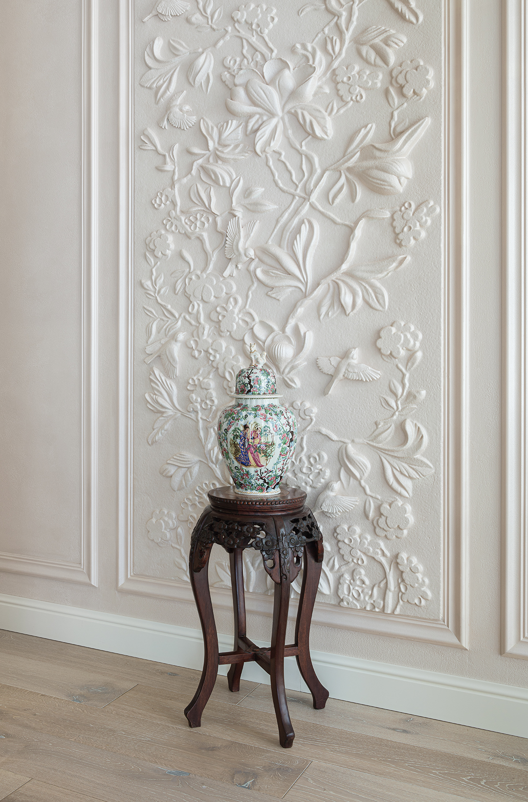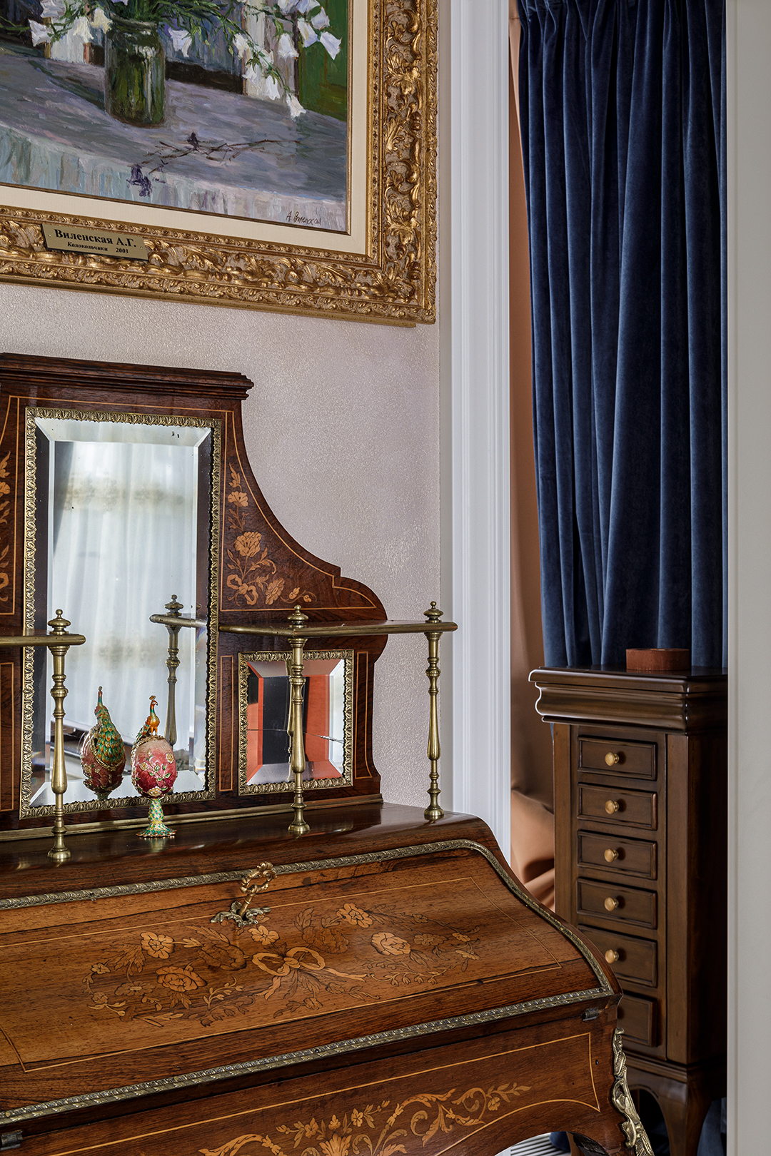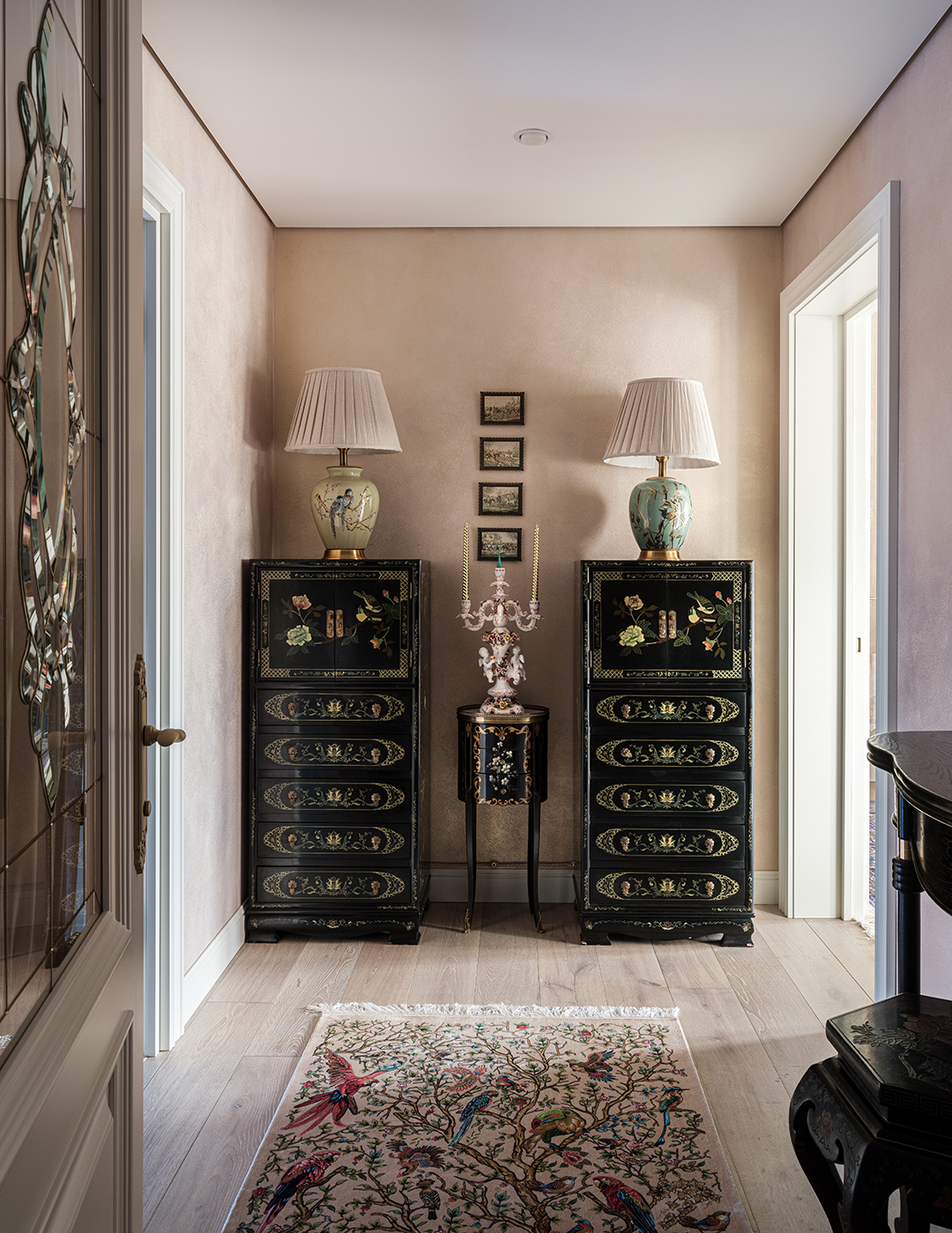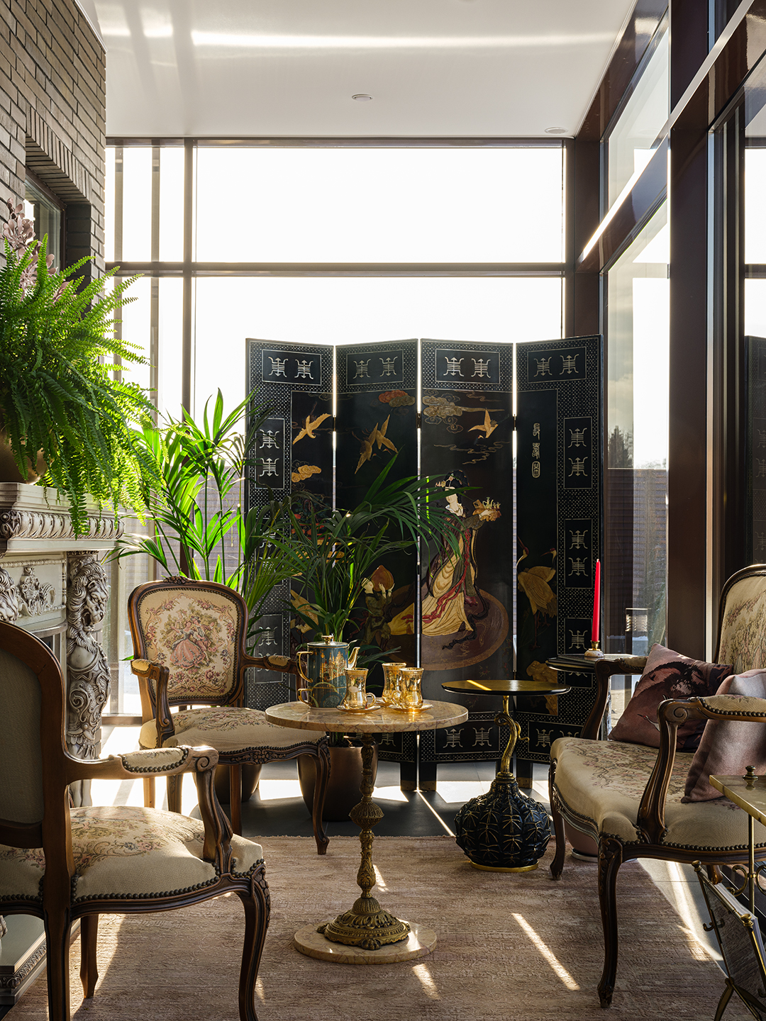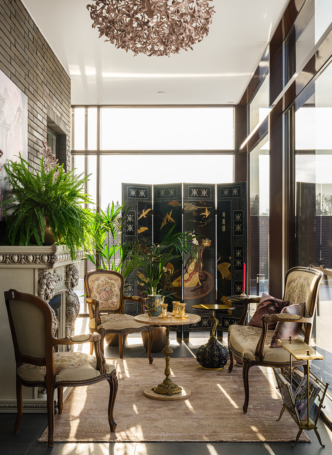 Концепция: Основная концепция проекта — виртуозное переосмысление существующего пространства и тонкая интеграция разнообразных стилевых элементов. Отталкиваясь от уже приобретенной винтажной мебели в классическом стиле и шинуазри, был разработан интерьер, где каждый элемент находит свое место. Ключевые изменения включали трансформацию продуваемой террасы в уютную отапливаемую веранду, скрытие кухни за раздвижной дверью с созданием нового оконного проема, а также прорубание окна в ванной комнате для максимального света и комфорта. Важной частью стало решение по декорированию технических дверей и акцентная художественная роспись по декоративной штукатурке в спальне, выполненная художником Геннадием Львовым.