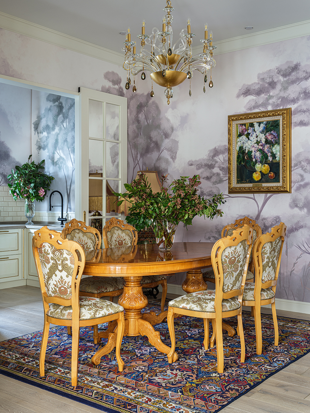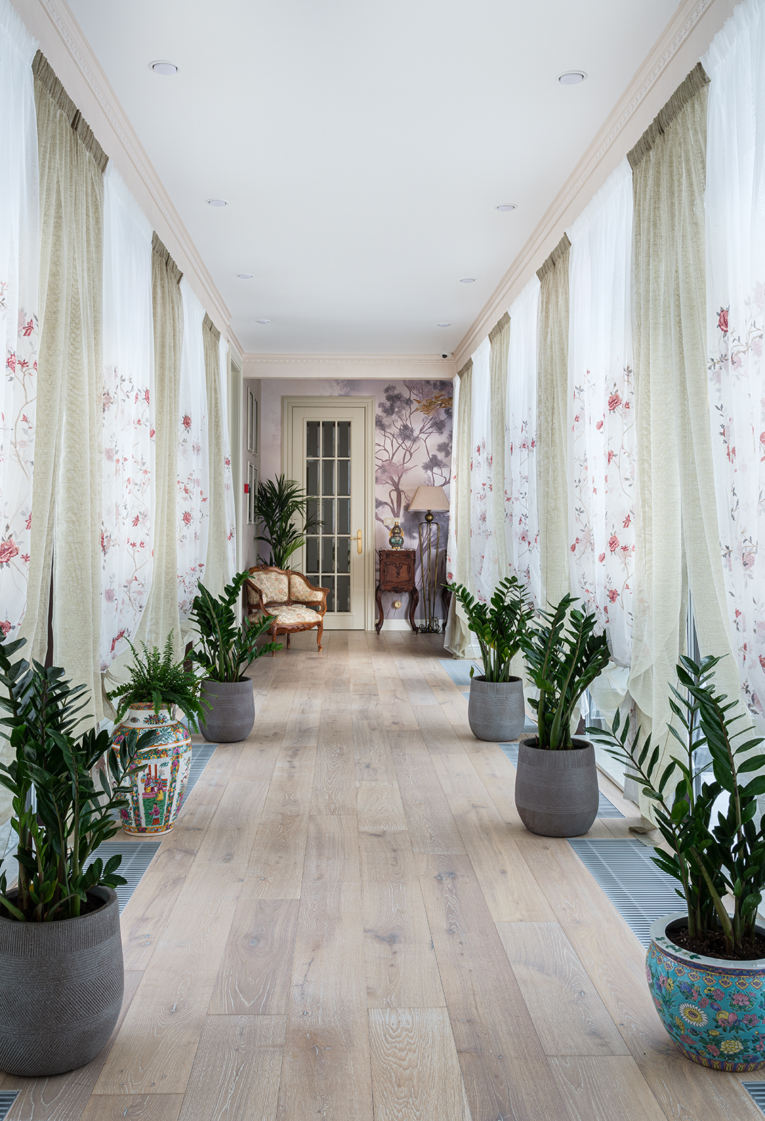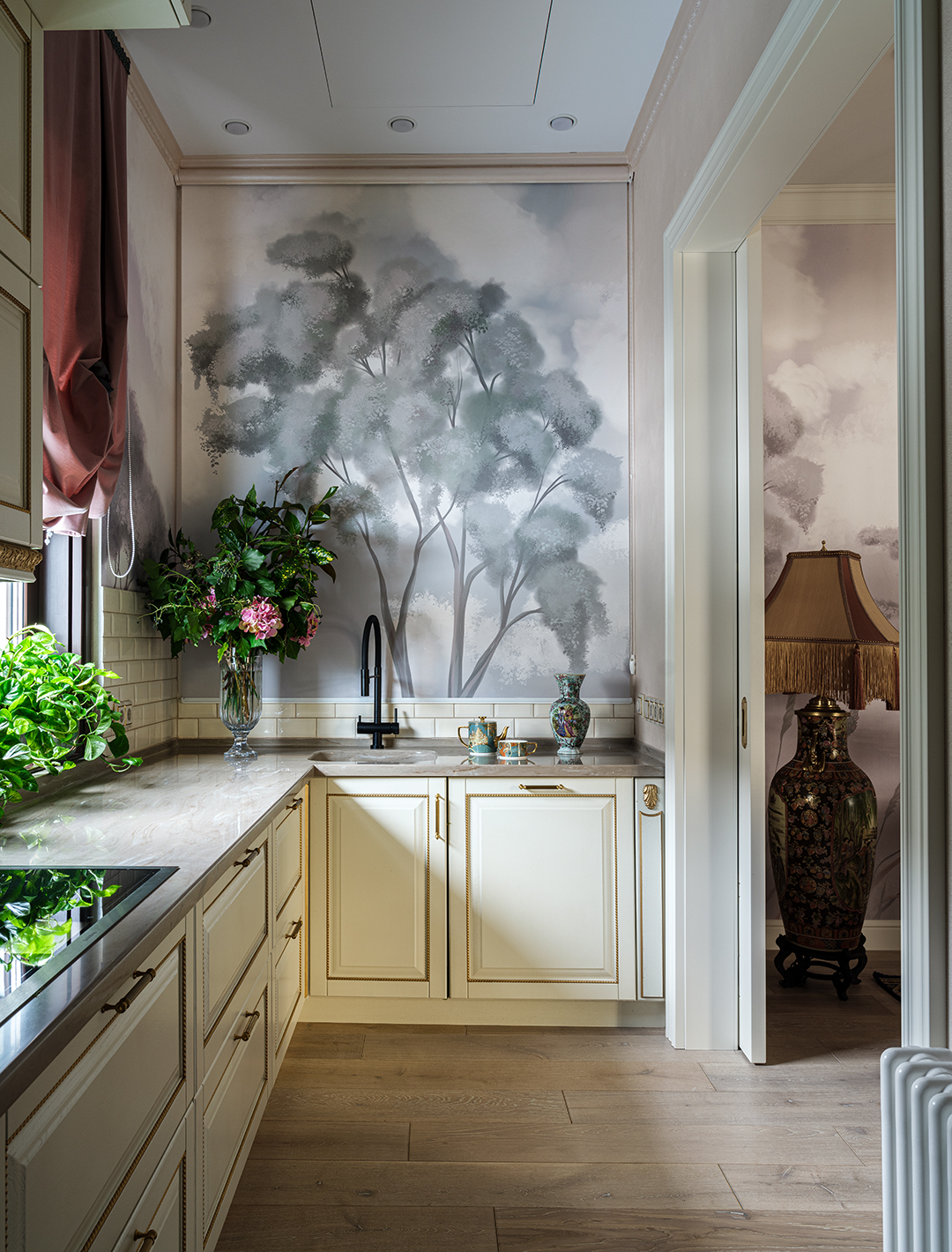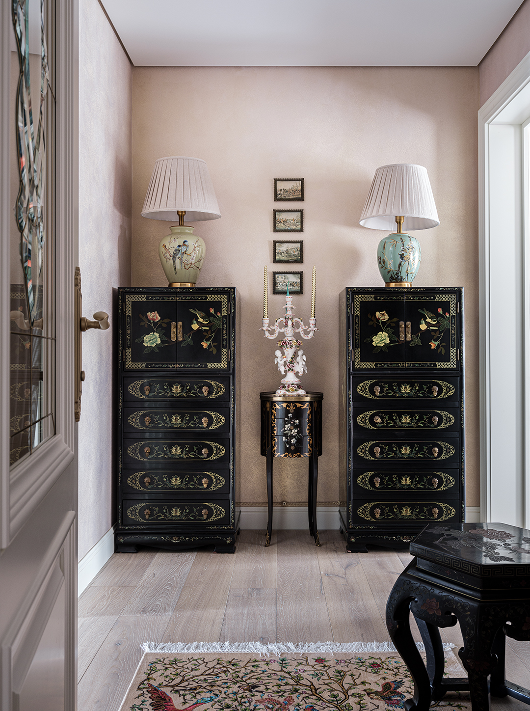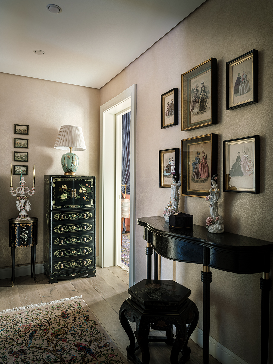 Концепция: Основная концепция проекта — виртуозное переосмысление существующего пространства и тонкая интеграция разнообразных стилевых элементов. Отталкиваясь от уже приобретенной винтажной мебели в классическом стиле и шинуазри, был разработан интерьер, где каждый элемент находит свое место. Ключевые изменения включали трансформацию продуваемой террасы в уютную отапливаемую веранду, скрытие кухни за раздвижной дверью с созданием нового оконного проема, а также прорубание окна в ванной комнате для максимального света и комфорта. Важной частью стало решение по декорированию технических дверей и акцентная художественная роспись по декоративной штукатурке в спальне, выполненная художником Геннадием Львовым.