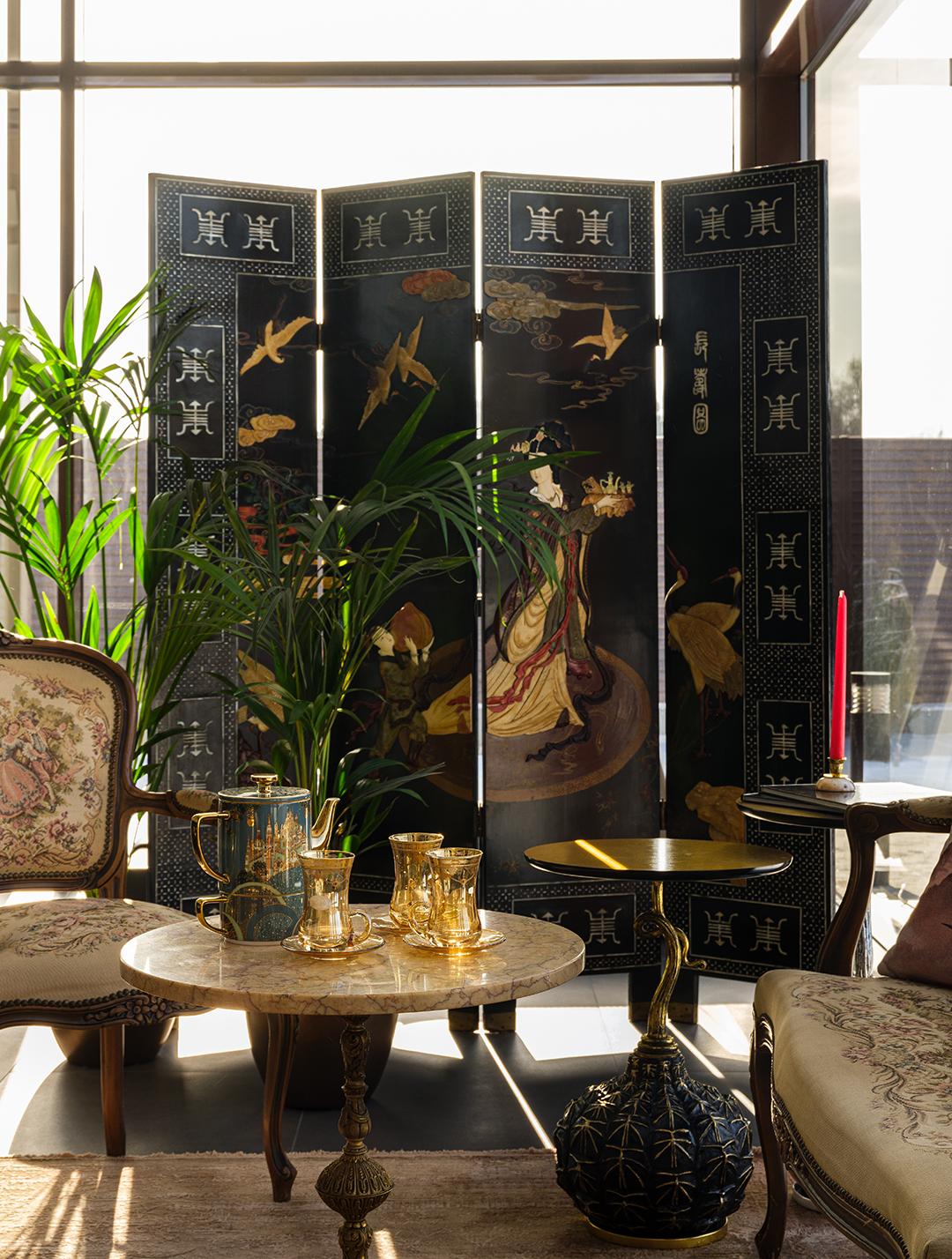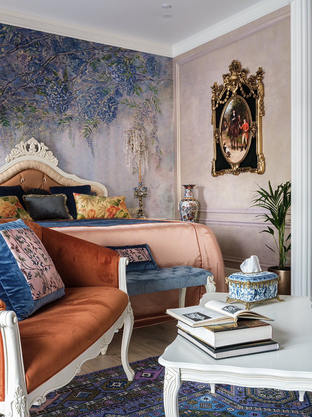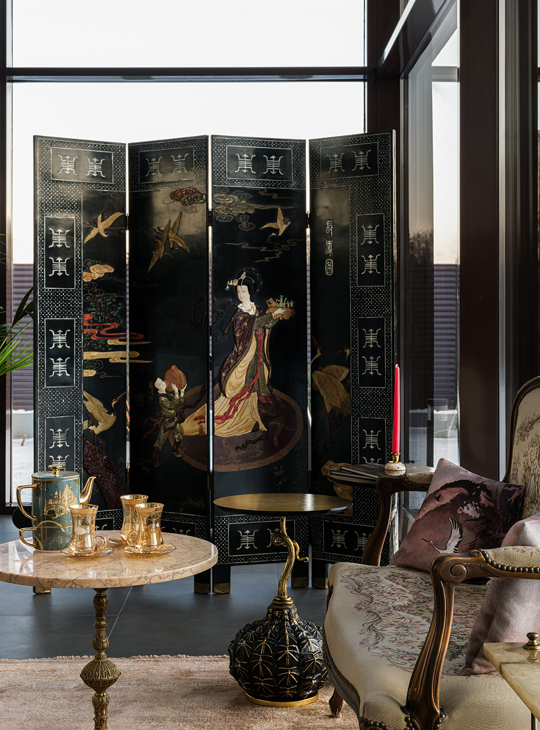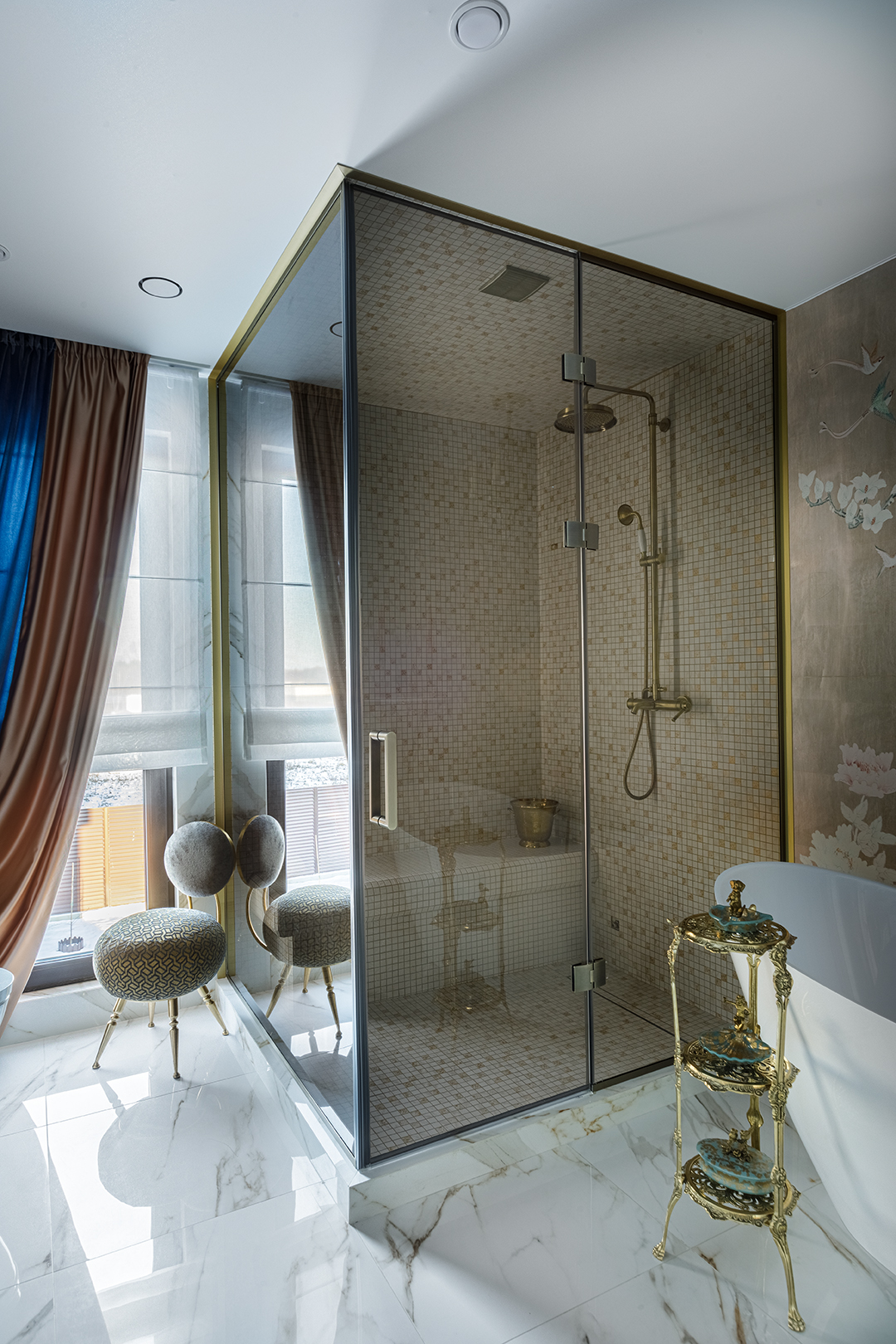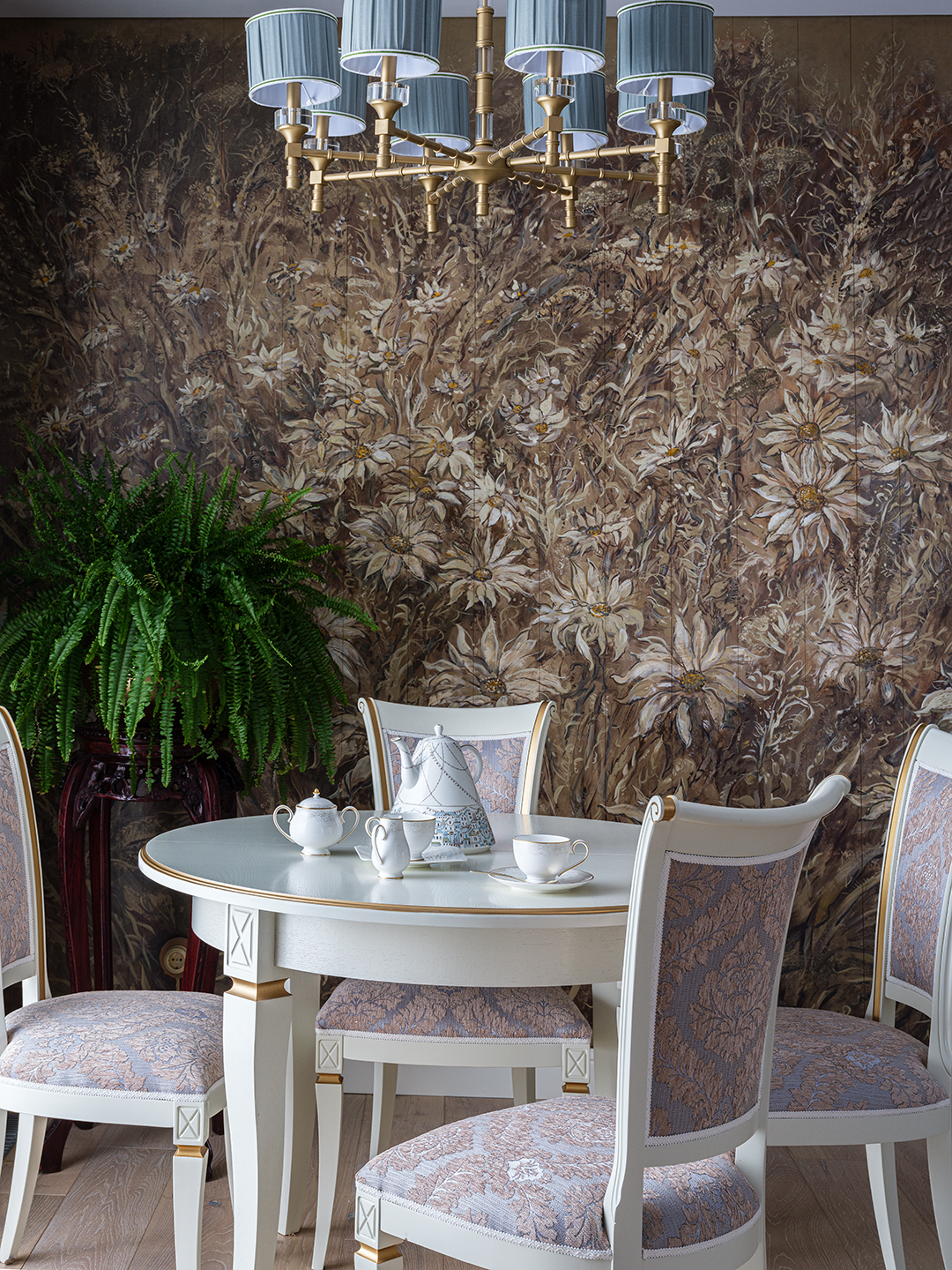 Концепция: Основная концепция проекта — виртуозное переосмысление существующего пространства и тонкая интеграция разнообразных стилевых элементов. Отталкиваясь от уже приобретенной винтажной мебели в классическом стиле и шинуазри, был разработан интерьер, где каждый элемент находит свое место. Ключевые изменения включали трансформацию продуваемой террасы в уютную отапливаемую веранду, скрытие кухни за раздвижной дверью с созданием нового оконного проема, а также прорубание окна в ванной комнате для максимального света и комфорта. Важной частью стало решение по декорированию технических дверей и акцентная художественная роспись по декоративной штукатурке в спальне, выполненная художником Геннадием Львовым.