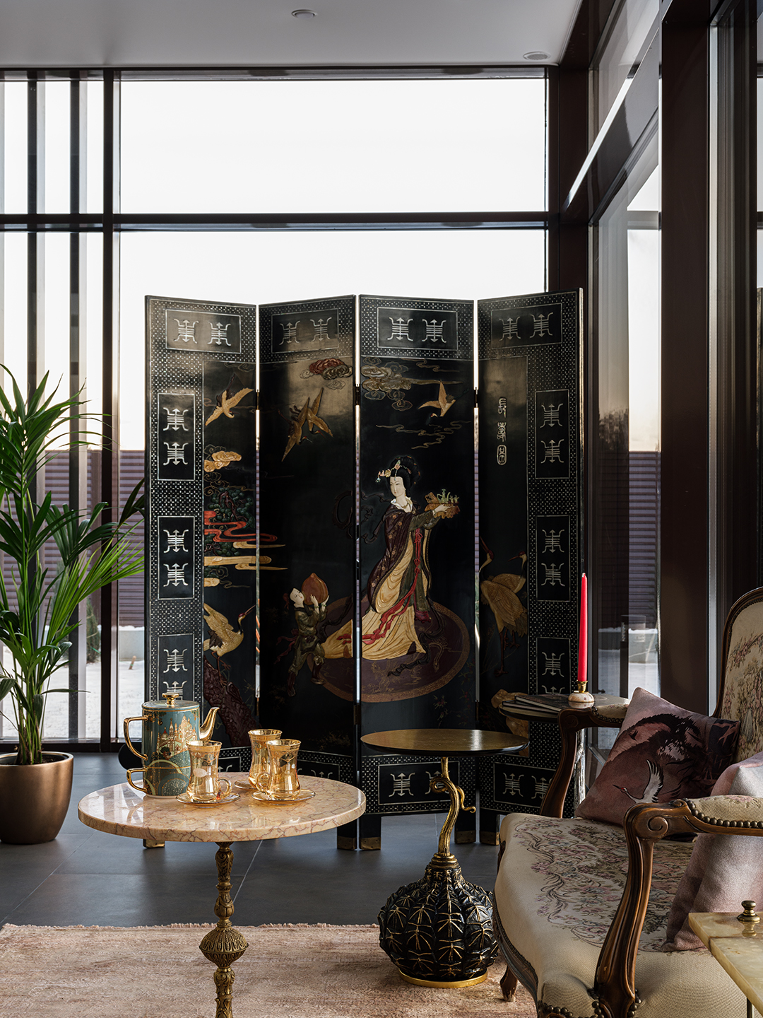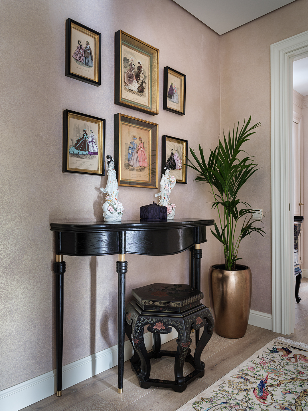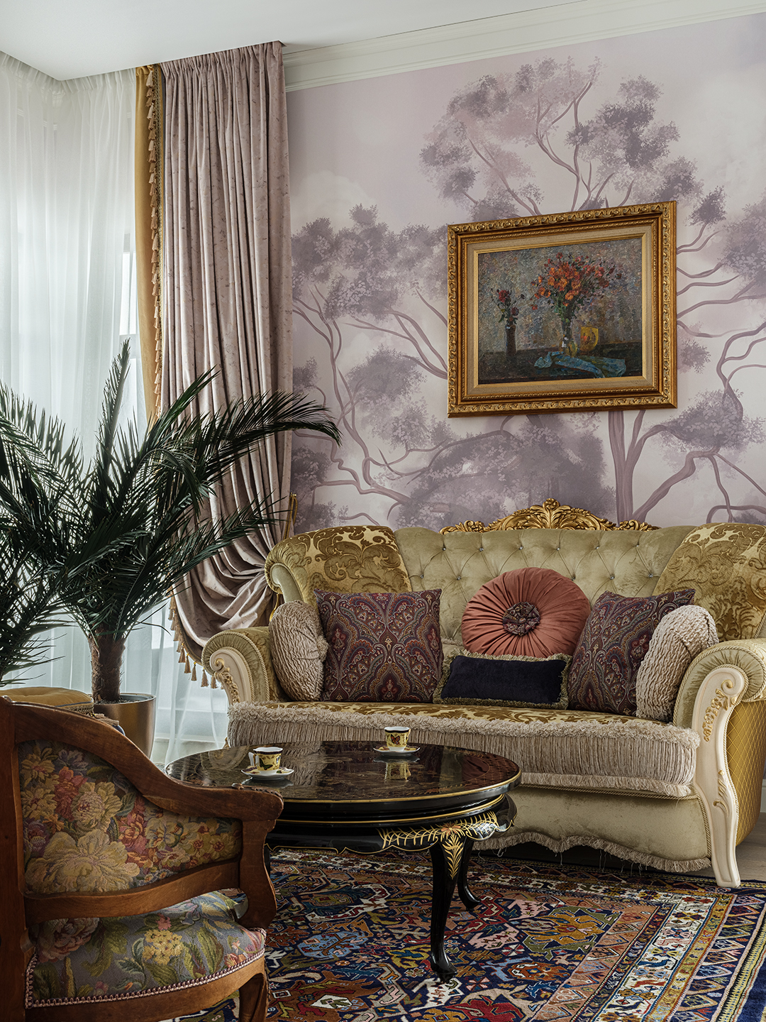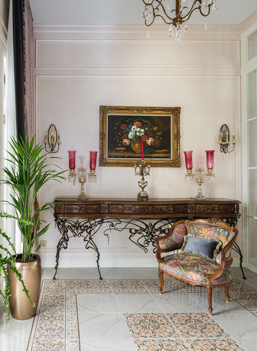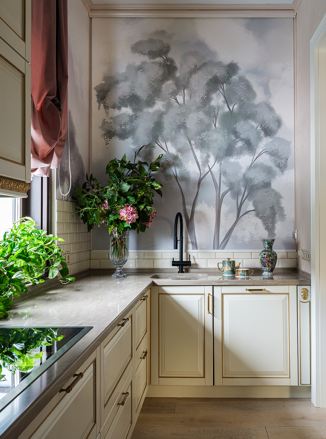 Концепция: Основная концепция проекта — виртуозное переосмысление существующего пространства и тонкая интеграция разнообразных стилевых элементов. Отталкиваясь от уже приобретенной винтажной мебели в классическом стиле и шинуазри, был разработан интерьер, где каждый элемент находит свое место. Ключевые изменения включали трансформацию продуваемой террасы в уютную отапливаемую веранду, скрытие кухни за раздвижной дверью с созданием нового оконного проема, а также прорубание окна в ванной комнате для максимального света и комфорта. Важной частью стало решение по декорированию технических дверей и акцентная художественная роспись по декоративной штукатурке в спальне, выполненная художником Геннадием Львовым.