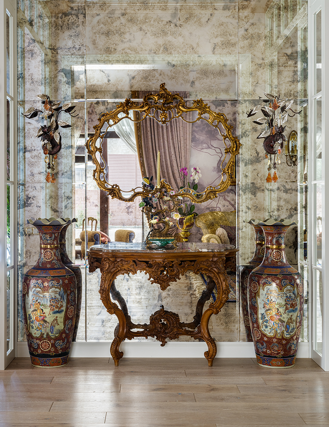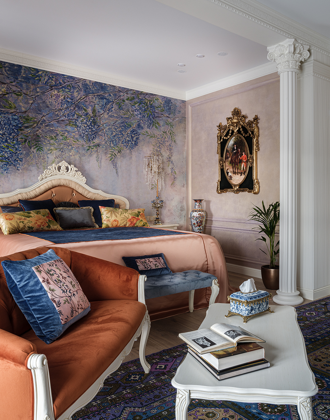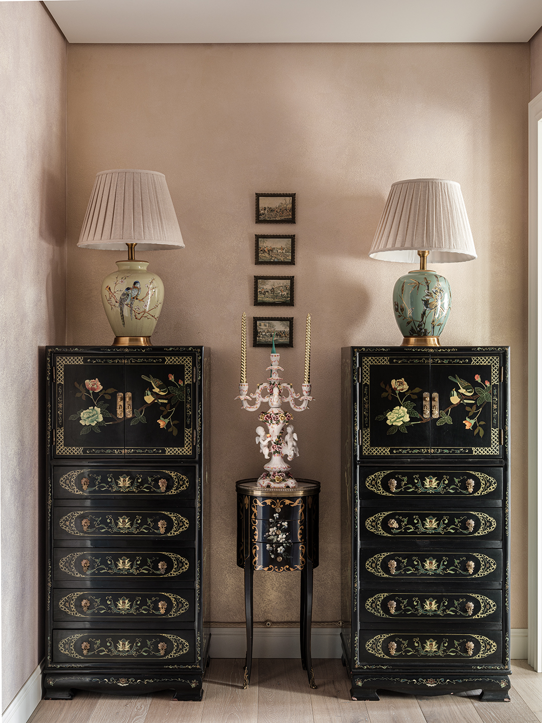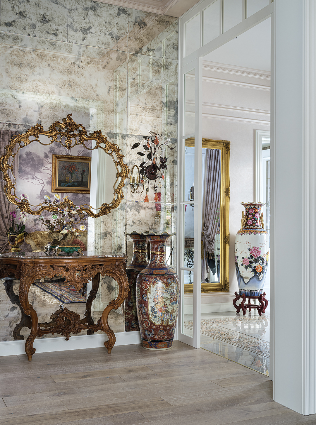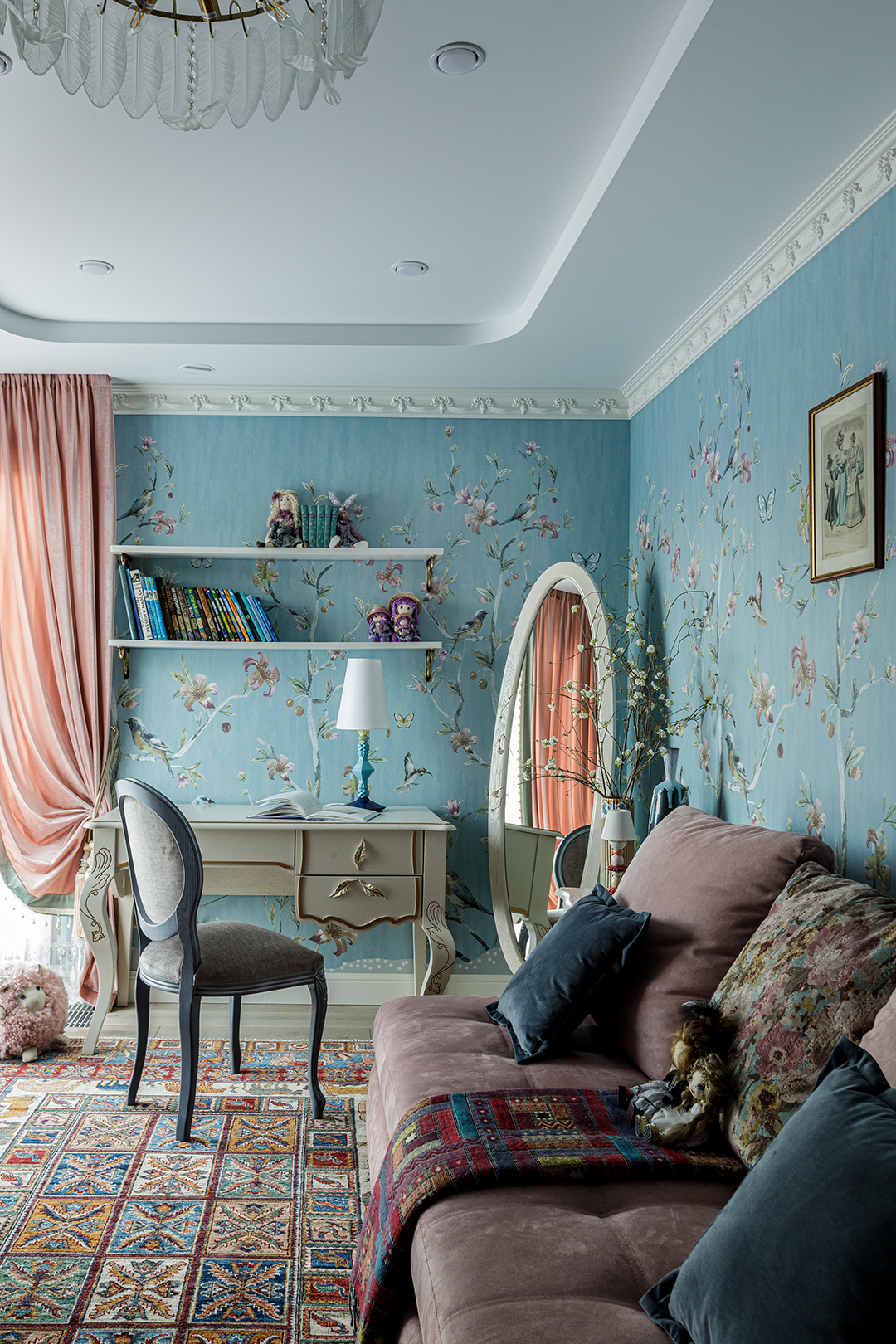 Концепция: Основная концепция проекта — виртуозное переосмысление существующего пространства и тонкая интеграция разнообразных стилевых элементов. Отталкиваясь от уже приобретенной винтажной мебели в классическом стиле и шинуазри, был разработан интерьер, где каждый элемент находит свое место. Ключевые изменения включали трансформацию продуваемой террасы в уютную отапливаемую веранду, скрытие кухни за раздвижной дверью с созданием нового оконного проема, а также прорубание окна в ванной комнате для максимального света и комфорта. Важной частью стало решение по декорированию технических дверей и акцентная художественная роспись по декоративной штукатурке в спальне, выполненная художником Геннадием Львовым.