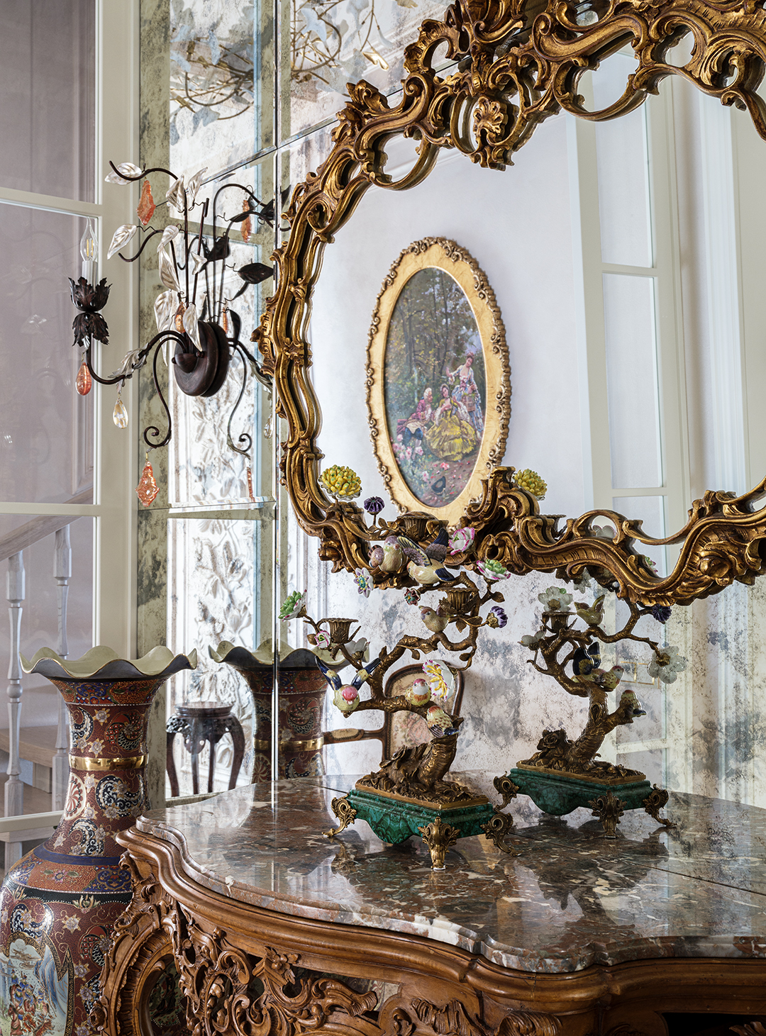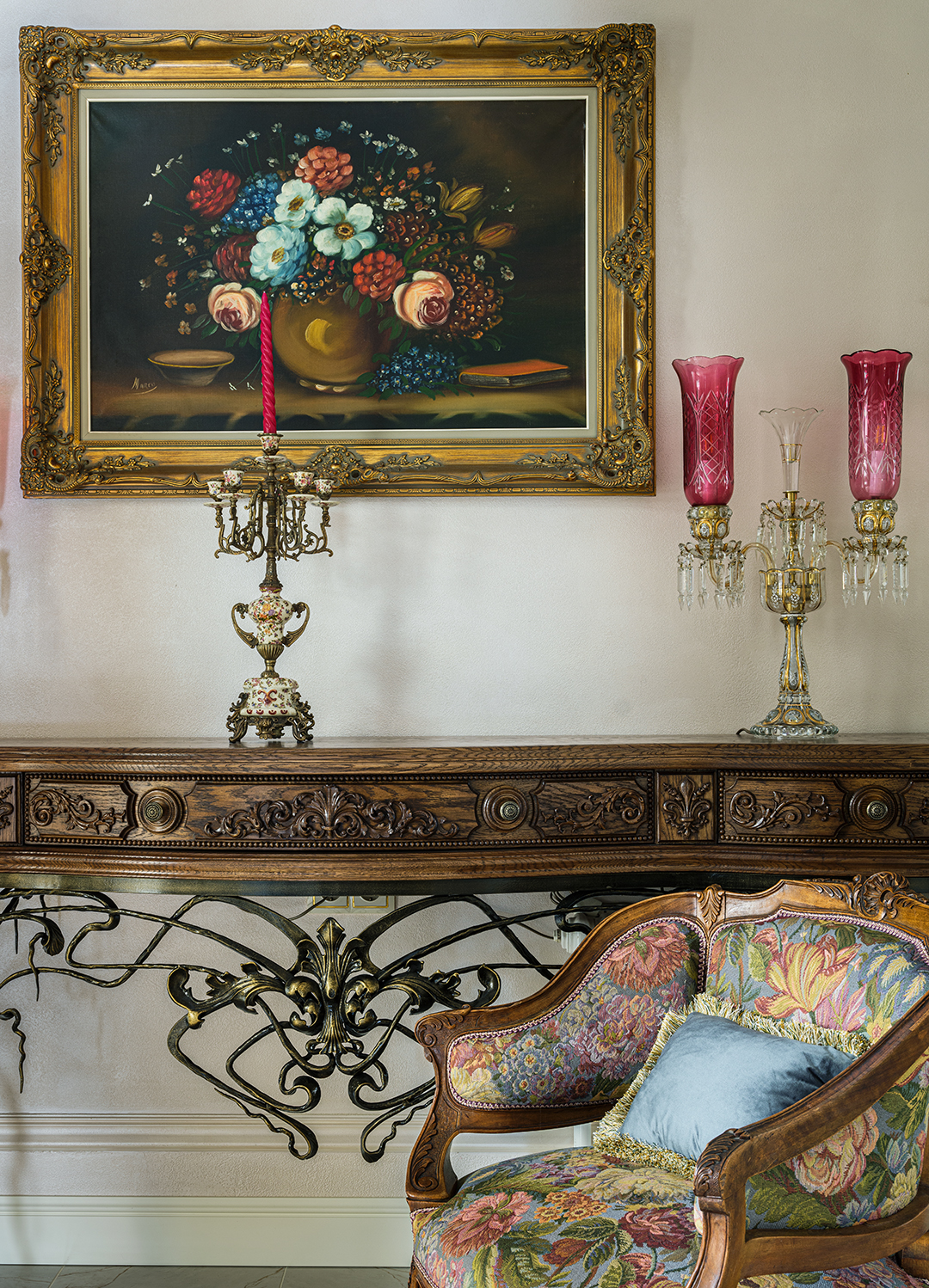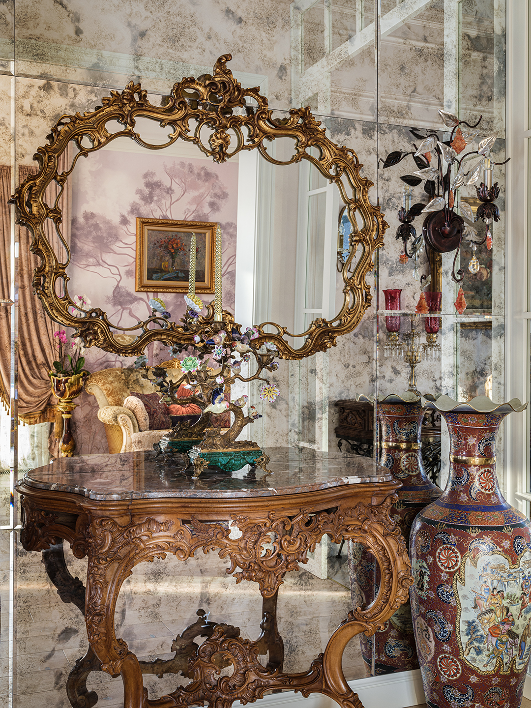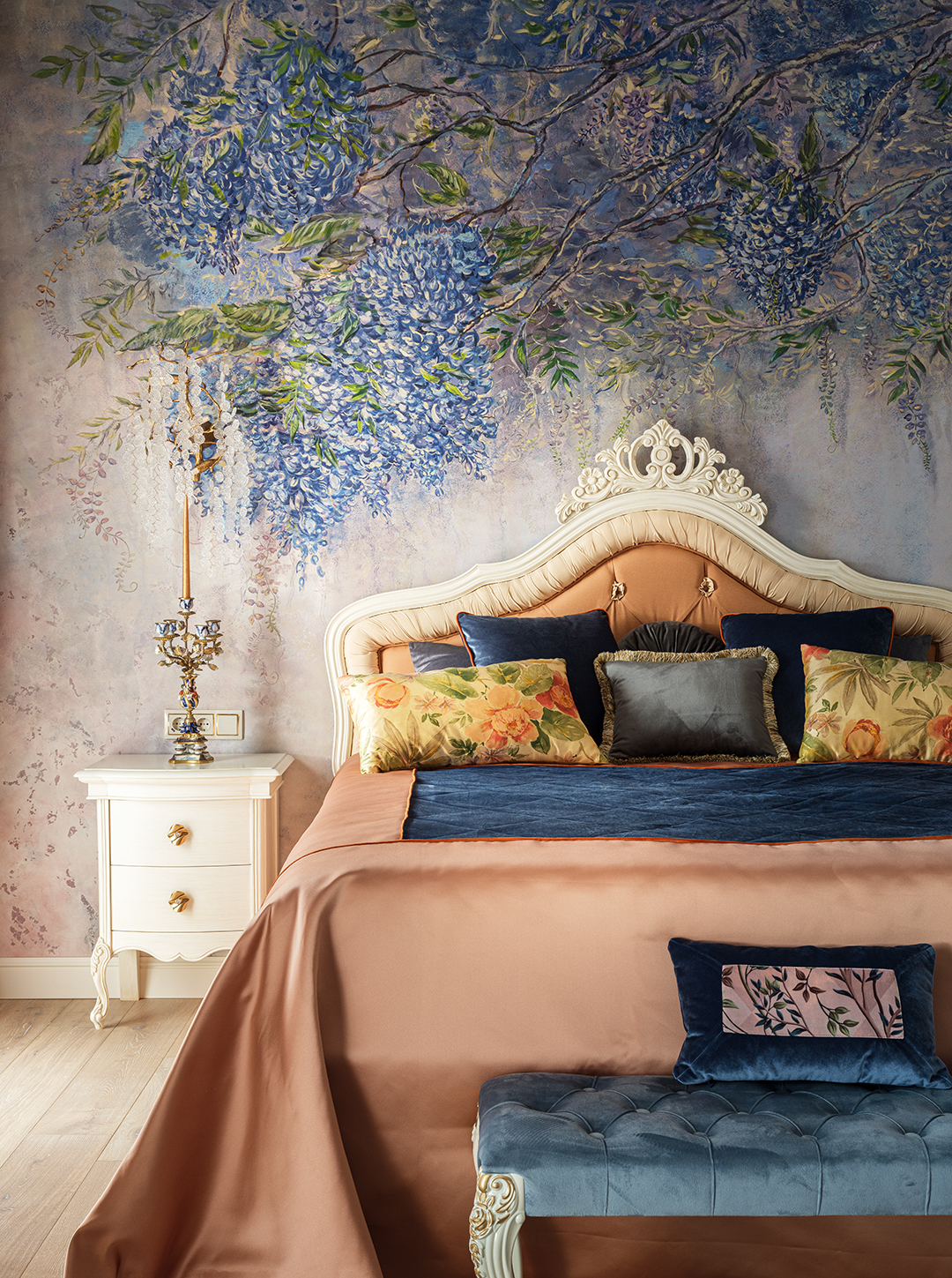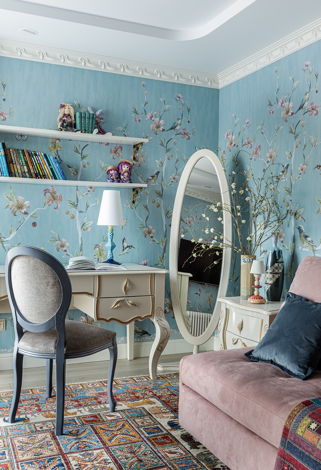 Концепция: Основная концепция проекта — виртуозное переосмысление существующего пространства и тонкая интеграция разнообразных стилевых элементов. Отталкиваясь от уже приобретенной винтажной мебели в классическом стиле и шинуазри, был разработан интерьер, где каждый элемент находит свое место. Ключевые изменения включали трансформацию продуваемой террасы в уютную отапливаемую веранду, скрытие кухни за раздвижной дверью с созданием нового оконного проема, а также прорубание окна в ванной комнате для максимального света и комфорта. Важной частью стало решение по декорированию технических дверей и акцентная художественная роспись по декоративной штукатурке в спальне, выполненная художником Геннадием Львовым.