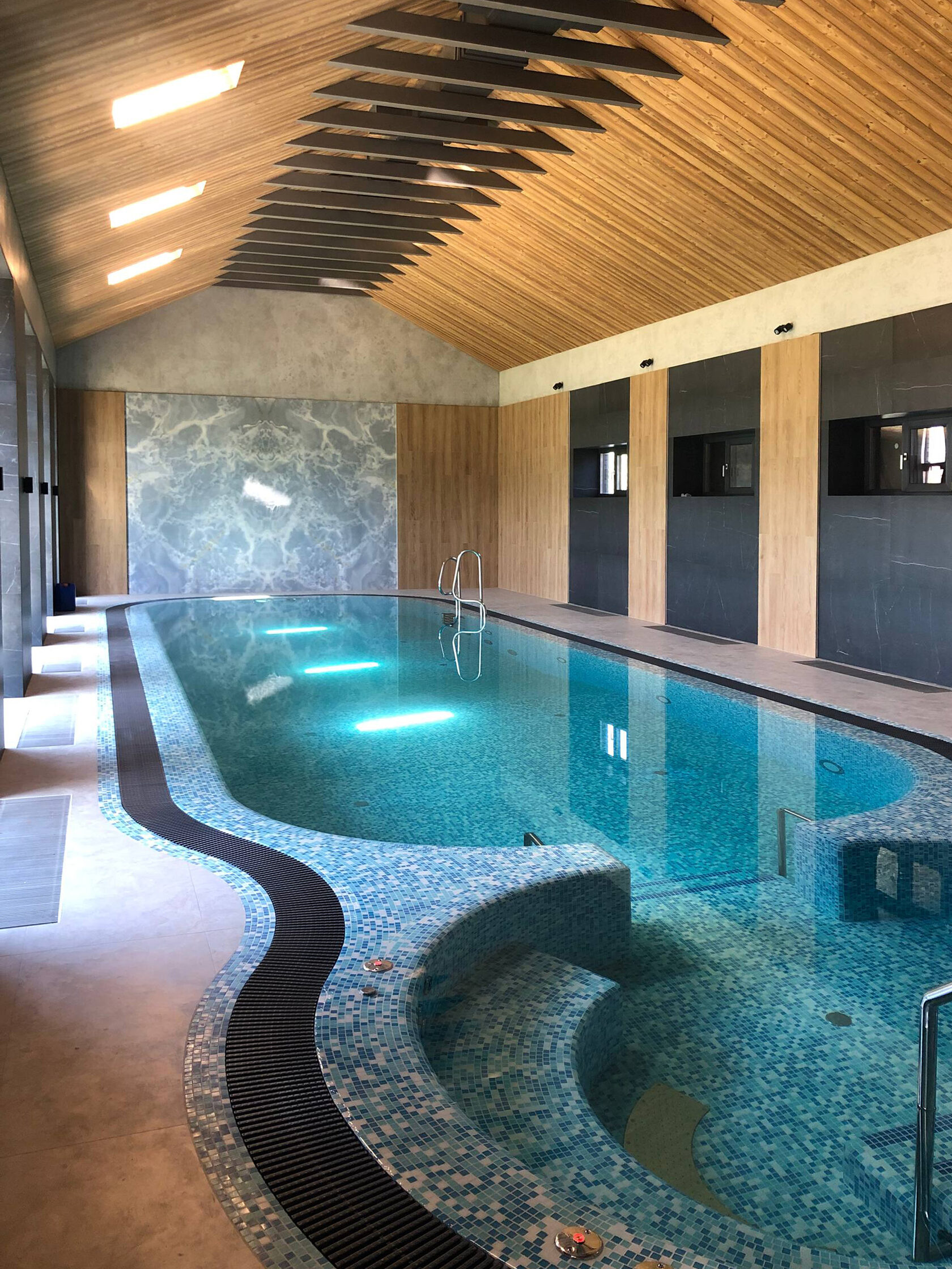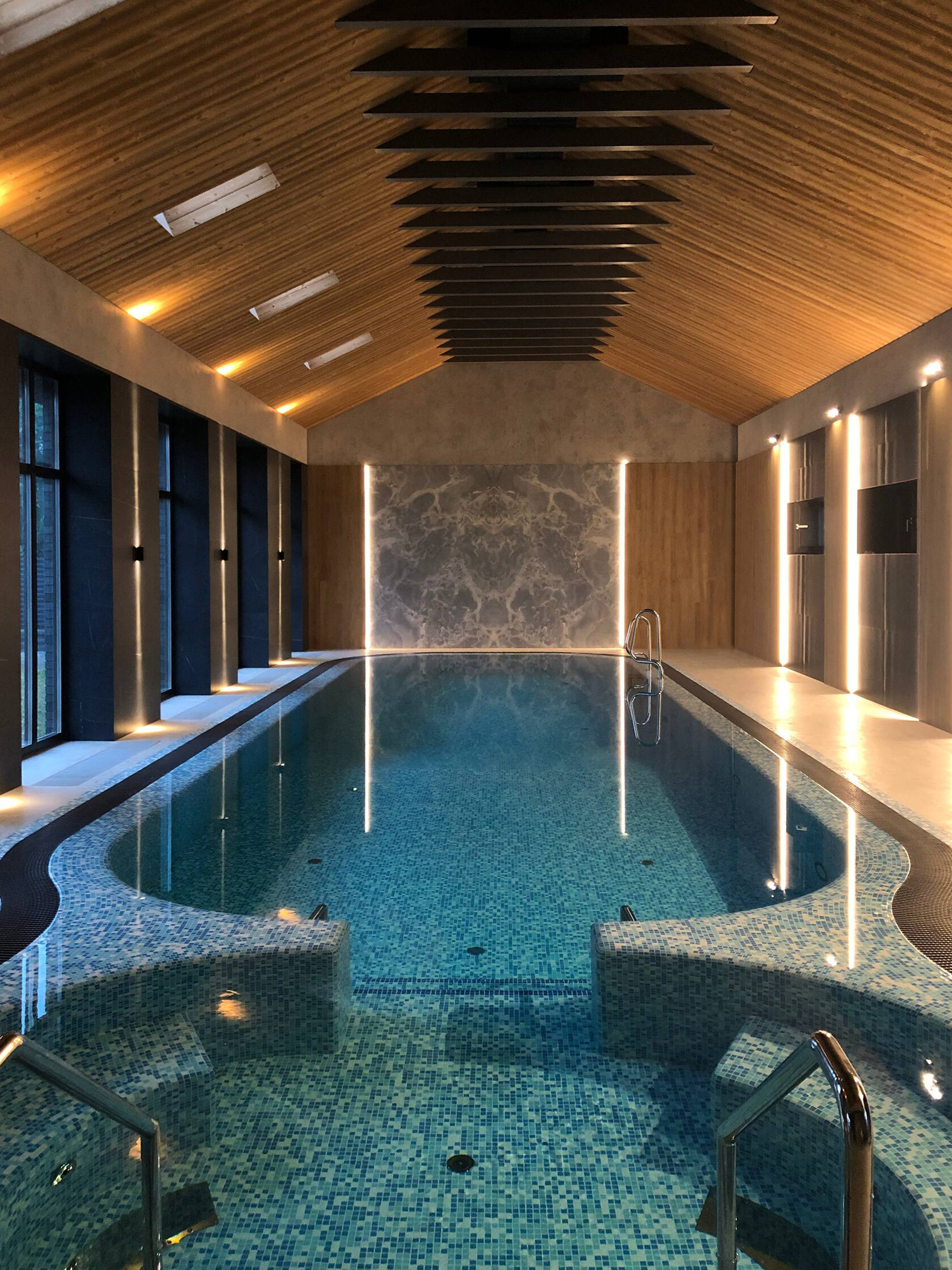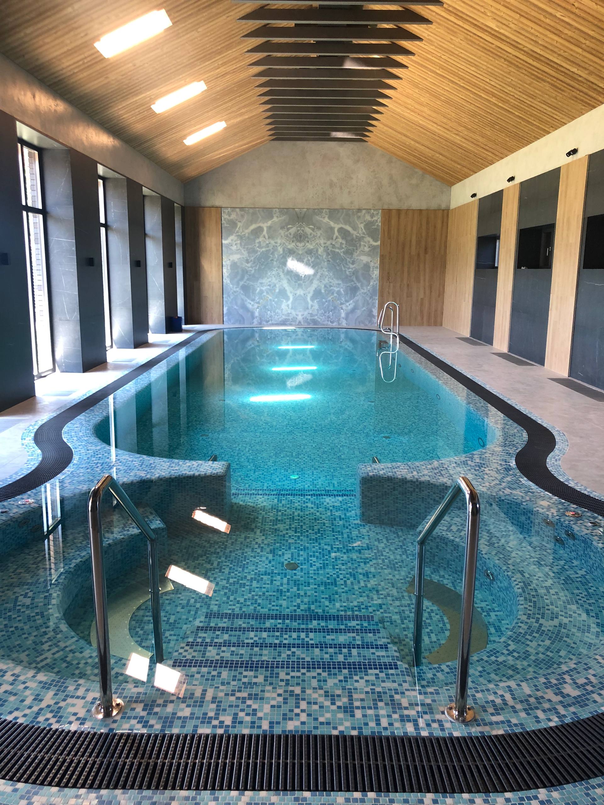 Идея нашего проекта — выйти за рамки традиционного представления о бассейне, превратив его в многослойное эстетическое переживание. Мы создали не просто пространство для плавания, а динамичную среду, где вода, свет и тактильные поверхности вступают в диалог, рождая уникальную атмосферу гармонии и роскоши.